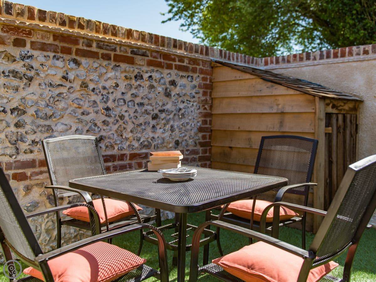 Outside, there's a small walled courtyard. It gets the sun. You can see over to the Isle of Sheppey from the fields sometimes.