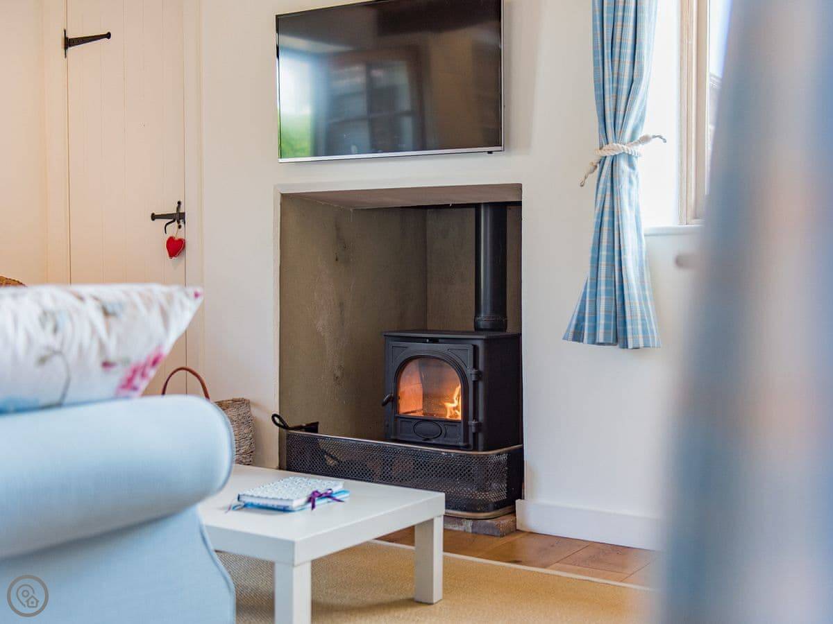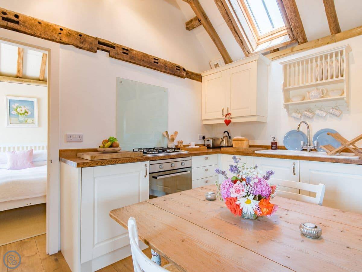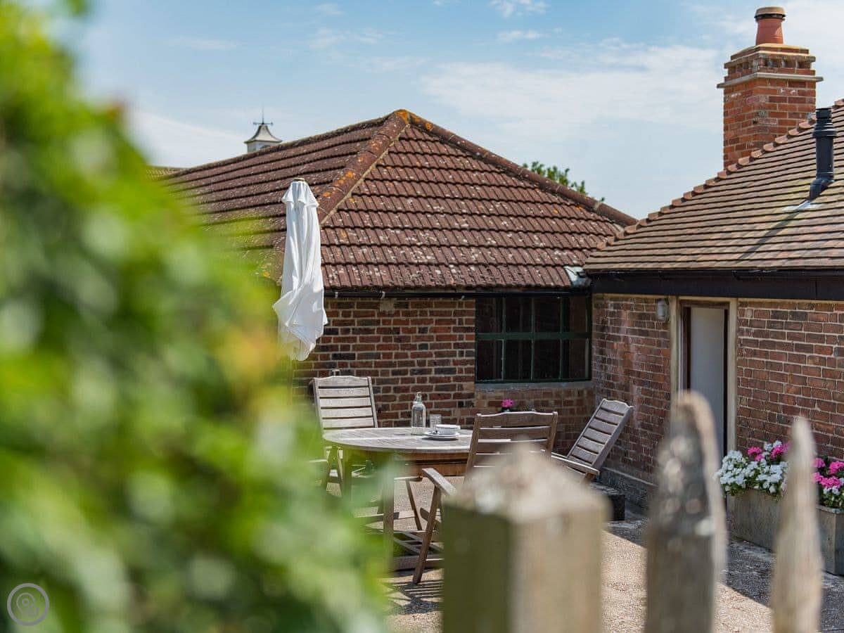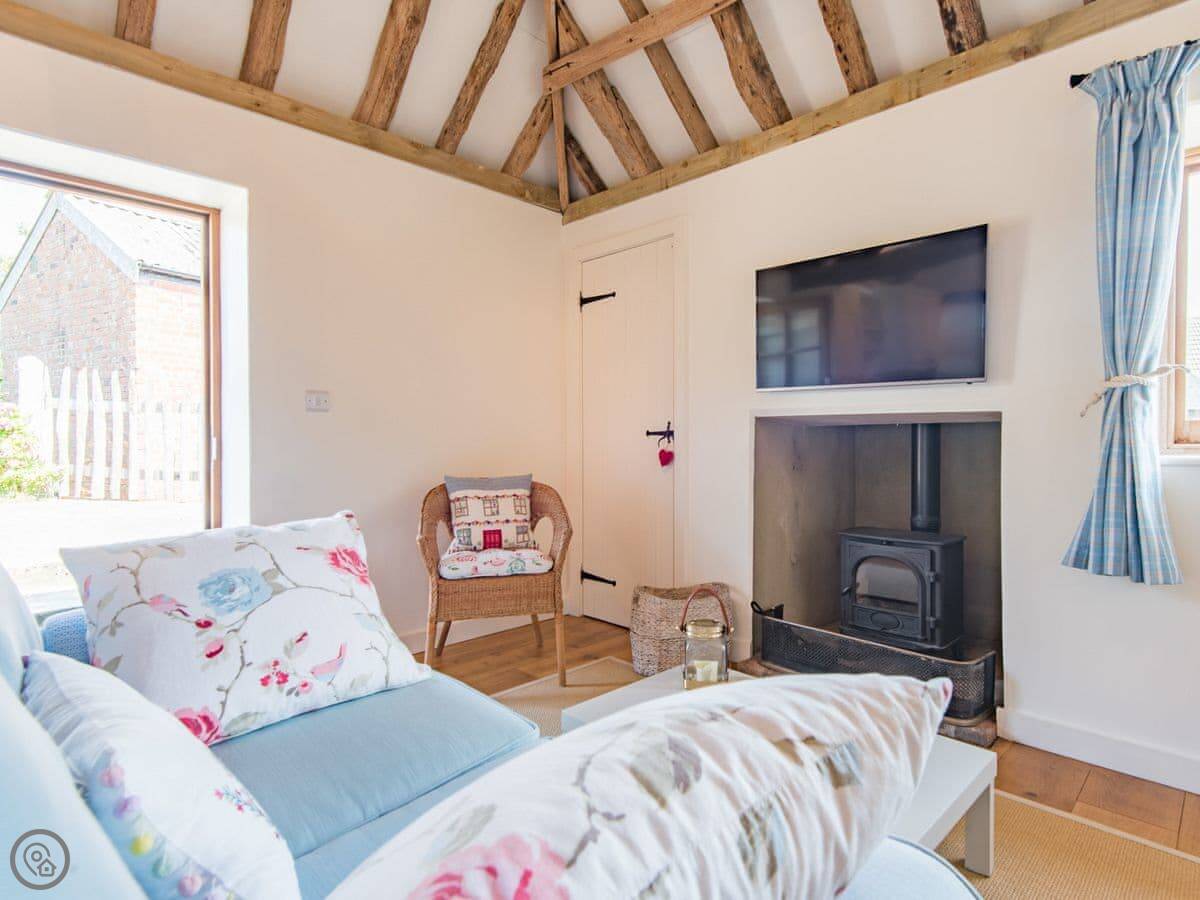 The main room is open plan. Kitchen, table, and a sitting area with a wood burner. There's underfloor heating too. The doors lead out to a private, enclosed courtyard garden with a table and a barbecue.