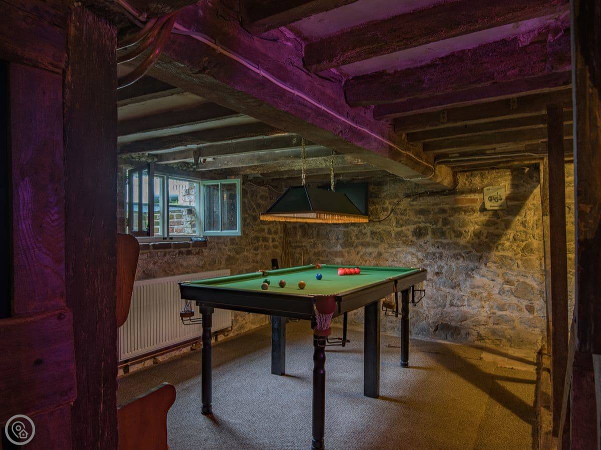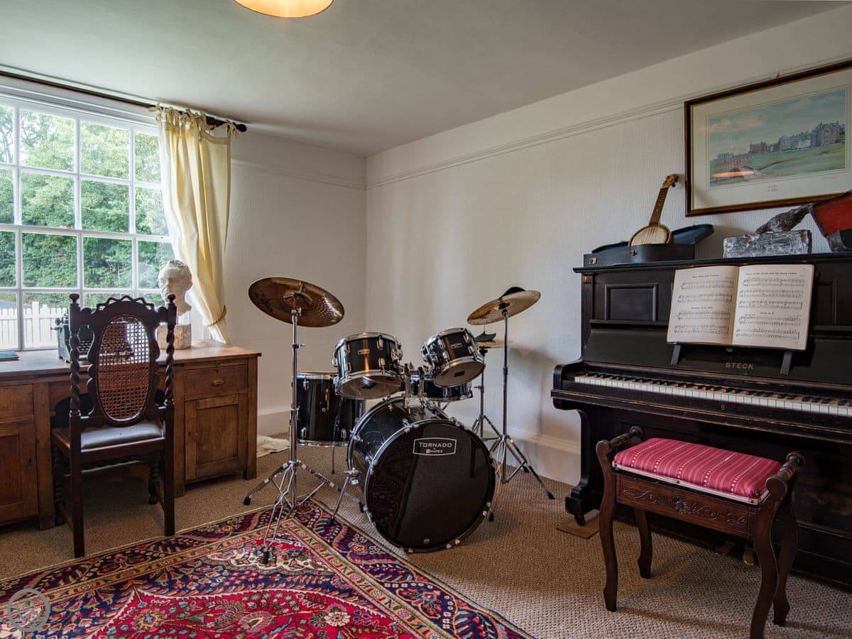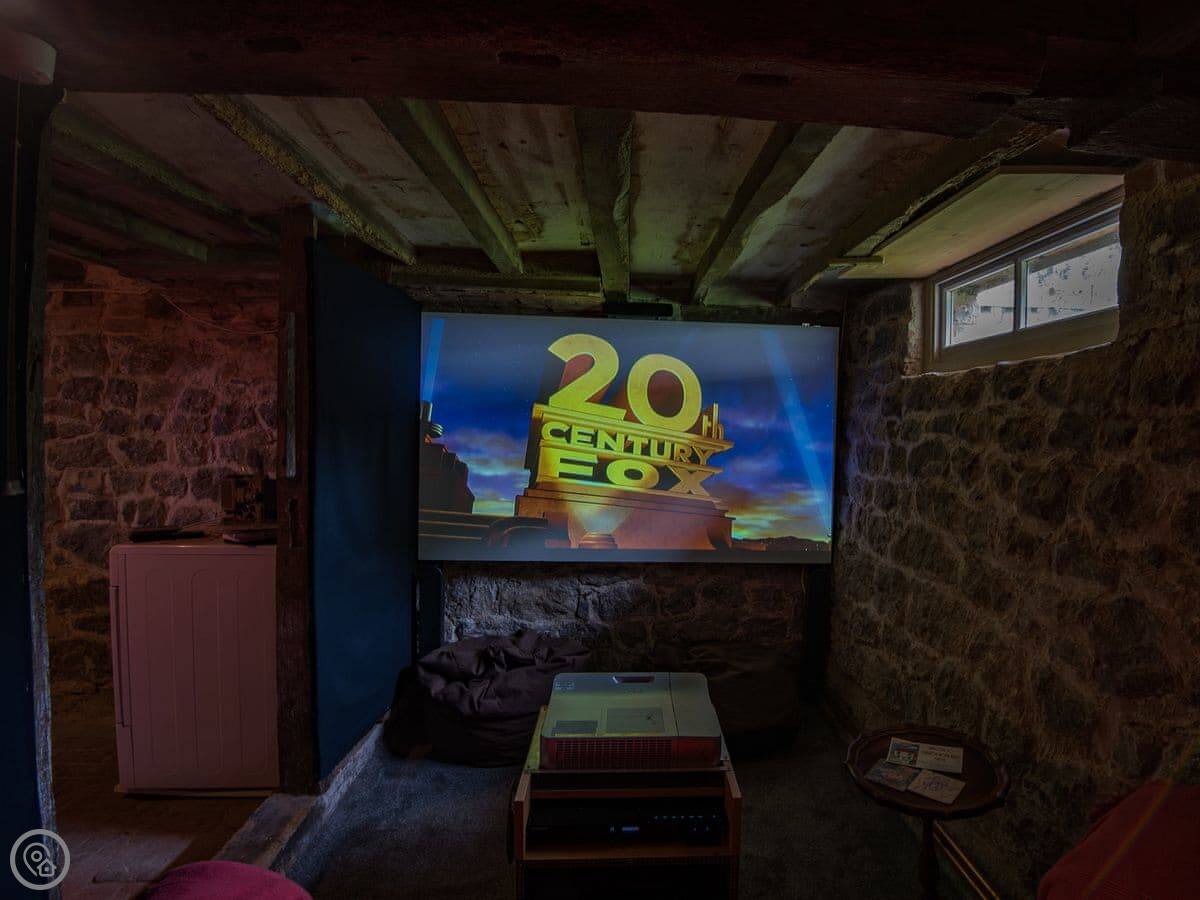 Downstairs, there's a main sitting room with a wood burner and a dining room. There's also a music room with a piano. The kitchen has what you need. The main thing is downstairs again, on the lower ground floor. That's where the cinema room is, with a big screen and projector. There's a games room down there too, with a pool table and darts.