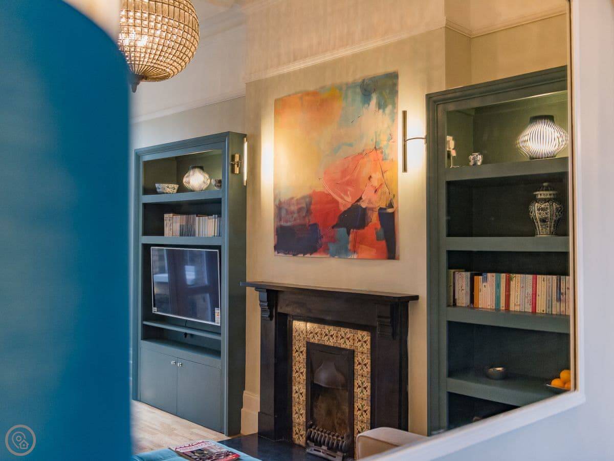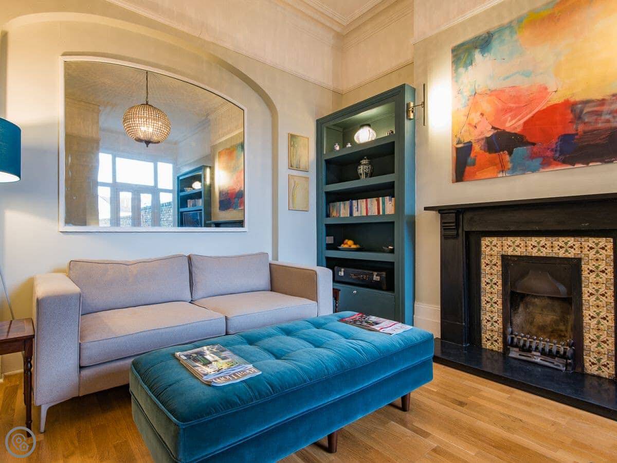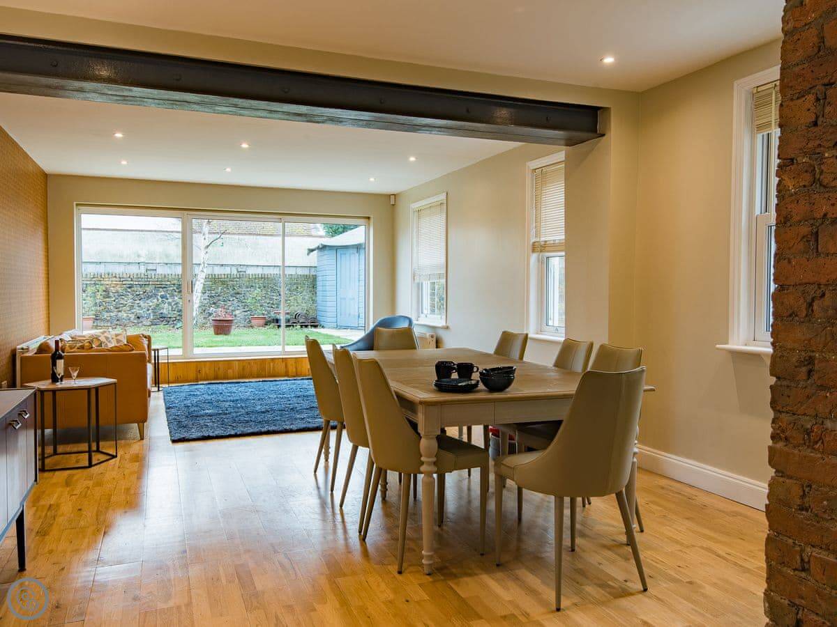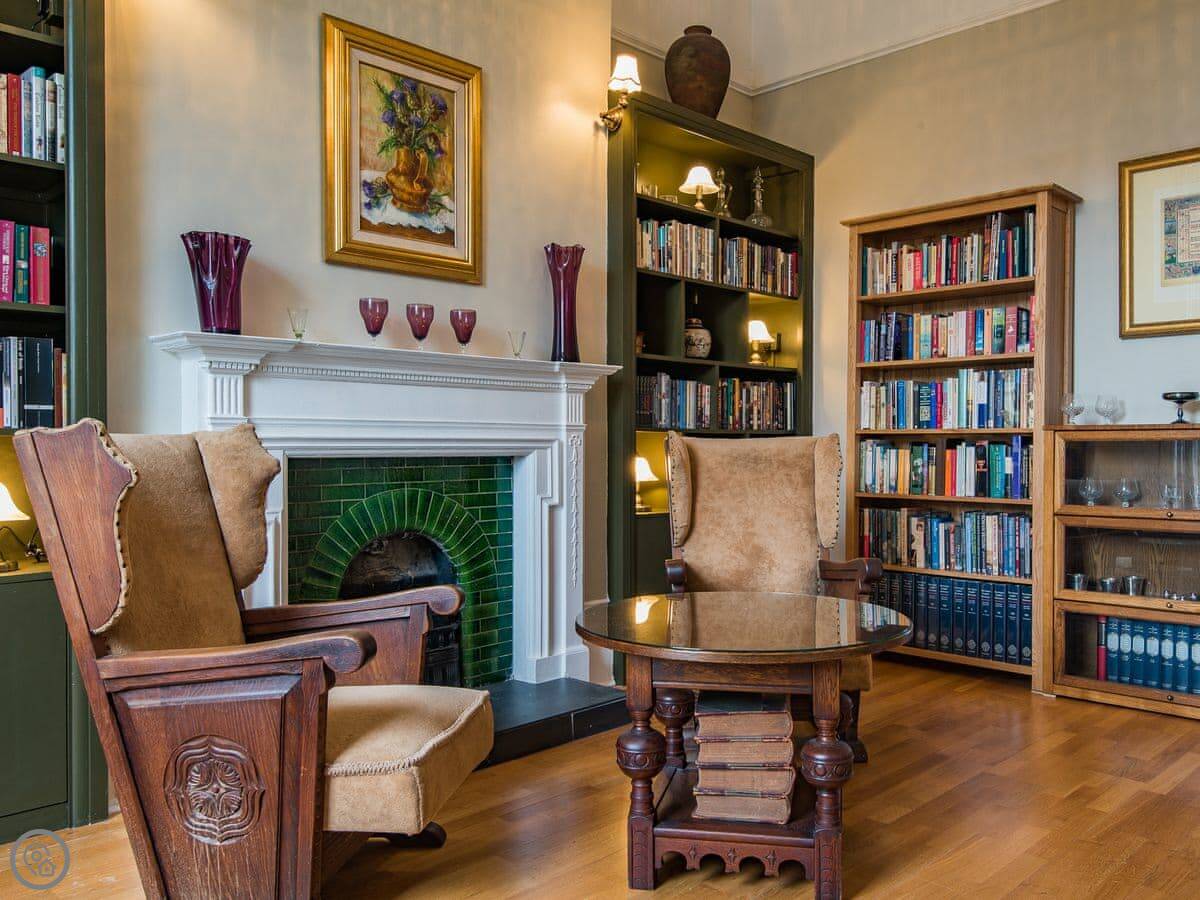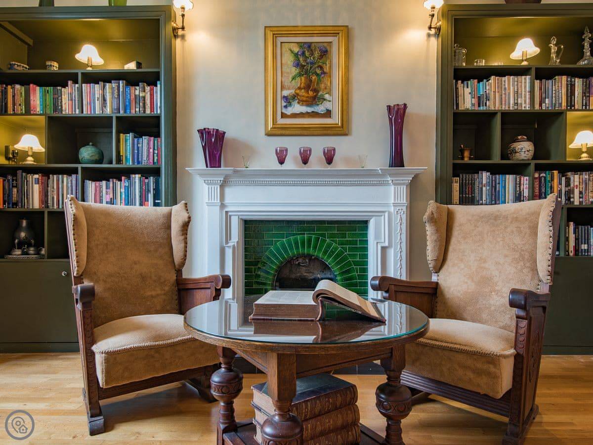 The house is from 1875. It's got that turret you see from the street. The ceilings are high, which makes it feel airy even with a full group. There's a lot of original stuff, like the coloured glass in the hall. The main rooms are big. The sitting room fits everyone for a film, and there's a quieter library if you need a break.