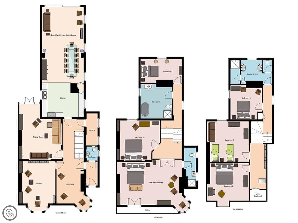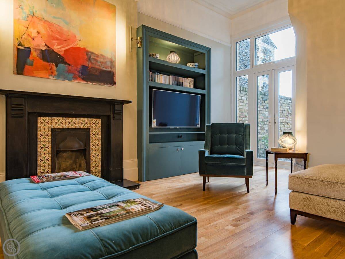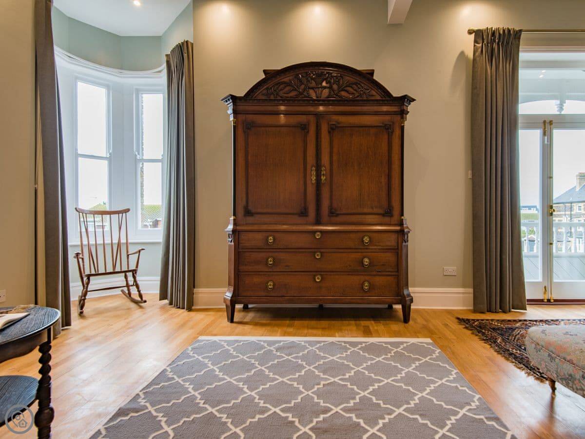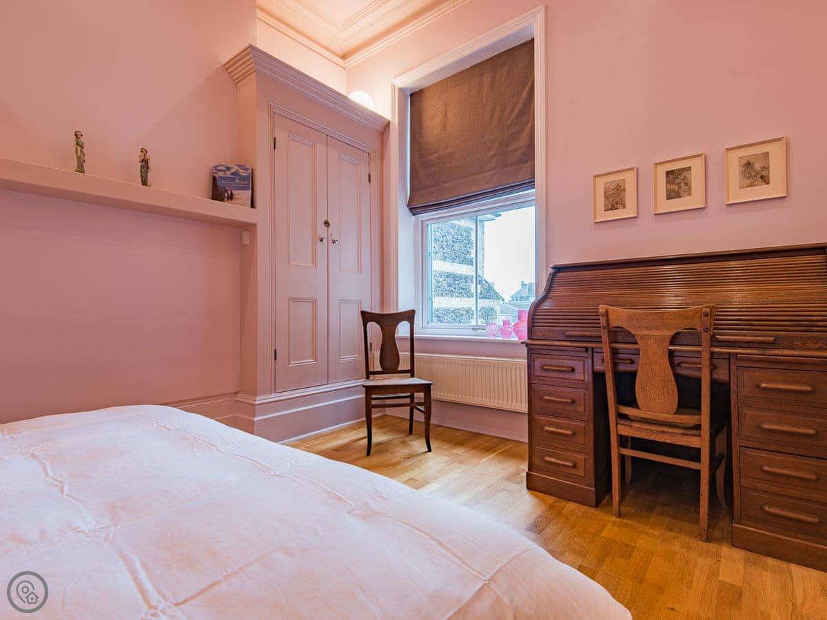 Six bedrooms are spread over the upper floors. One has the turret, so you get a little reading nook up there. There are side sea views from a couple of rooms. The sea is only a few hundred yards away. All the bathrooms have underfloor heating, which is nice.