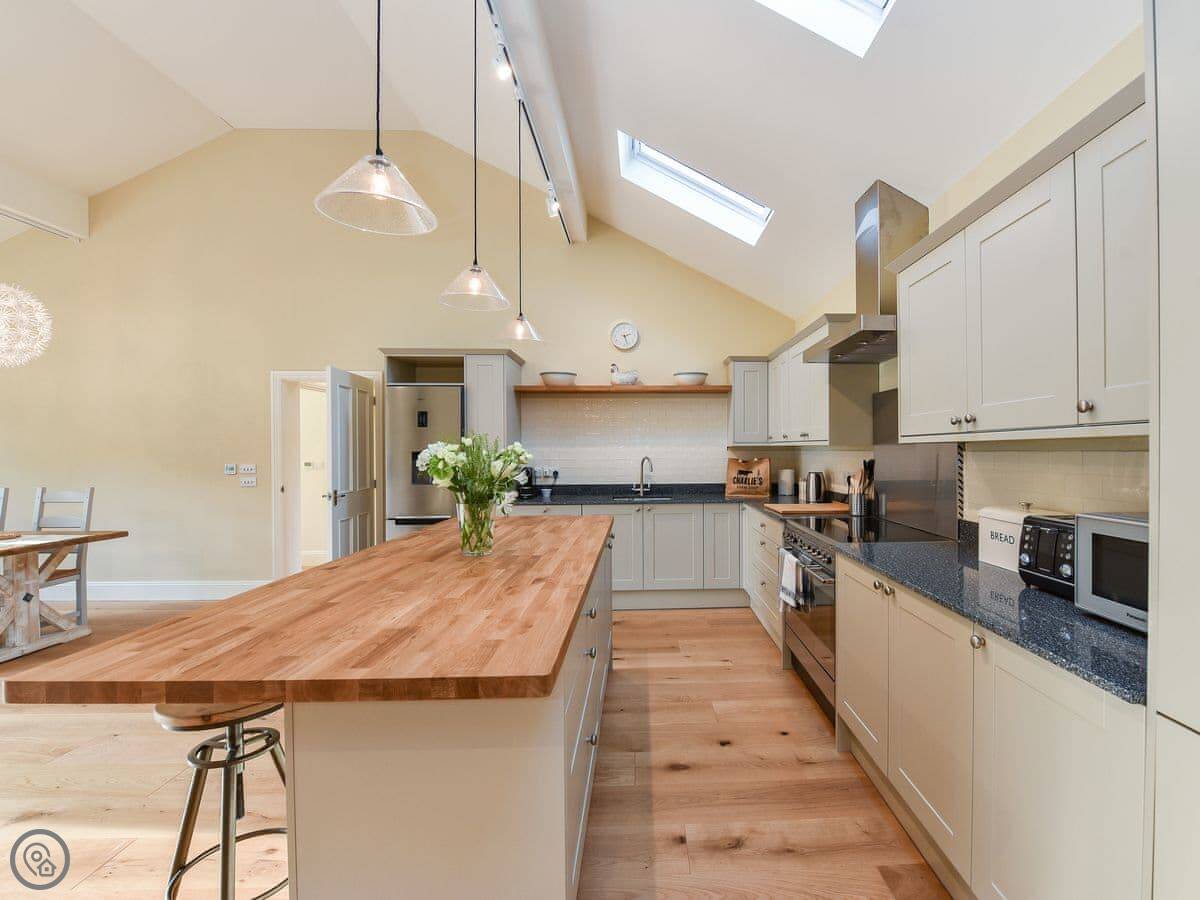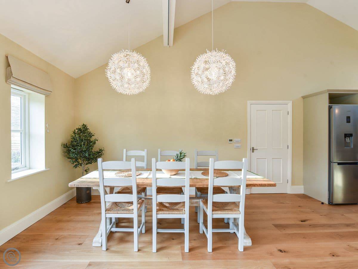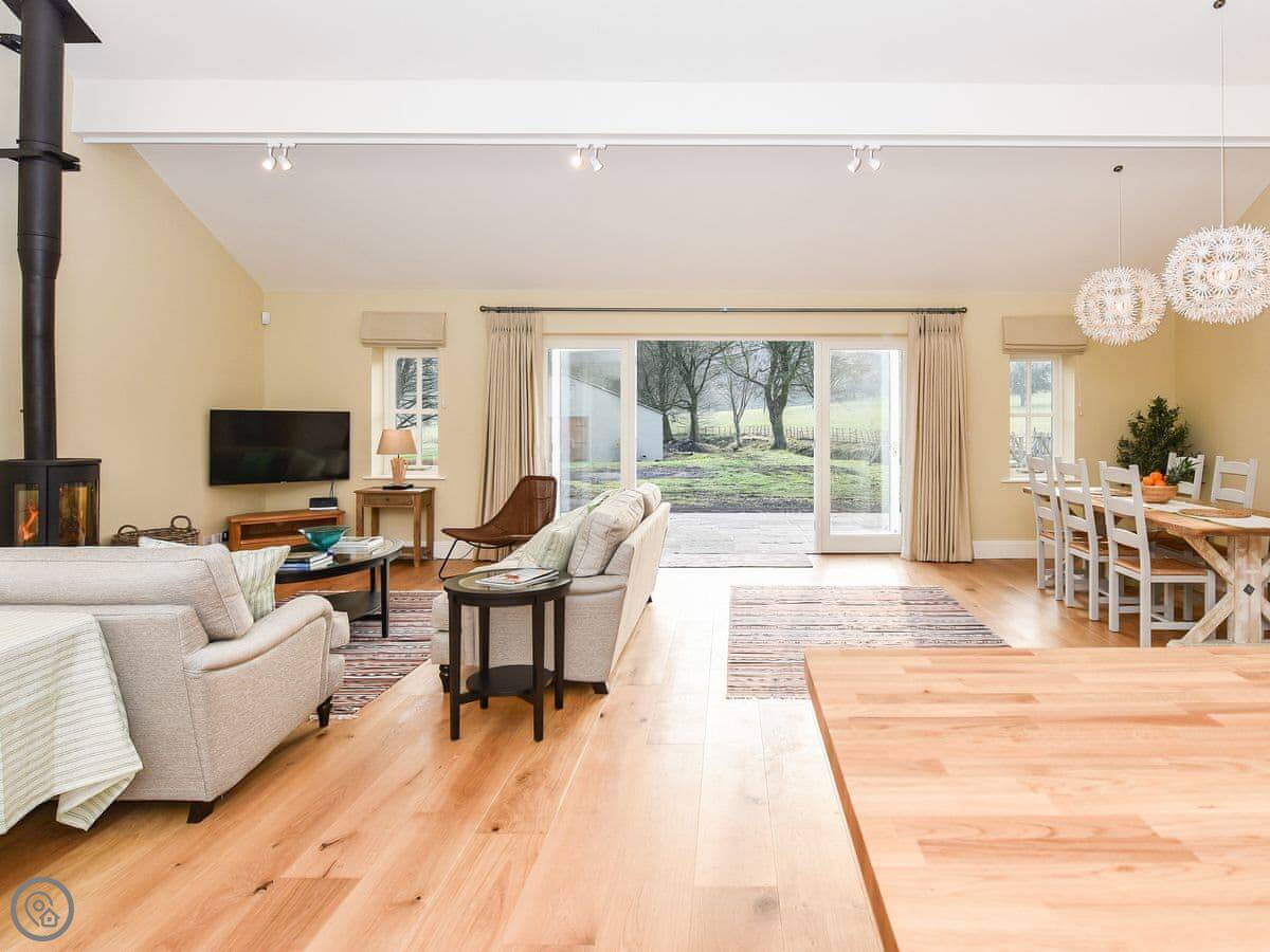 The main room is open plan. Kitchen at one end, sofas and TV at the other, and a table in the middle. The kitchen has a dishwasher and a washing machine. There's a utility room with a boot rack for muddy shoes.