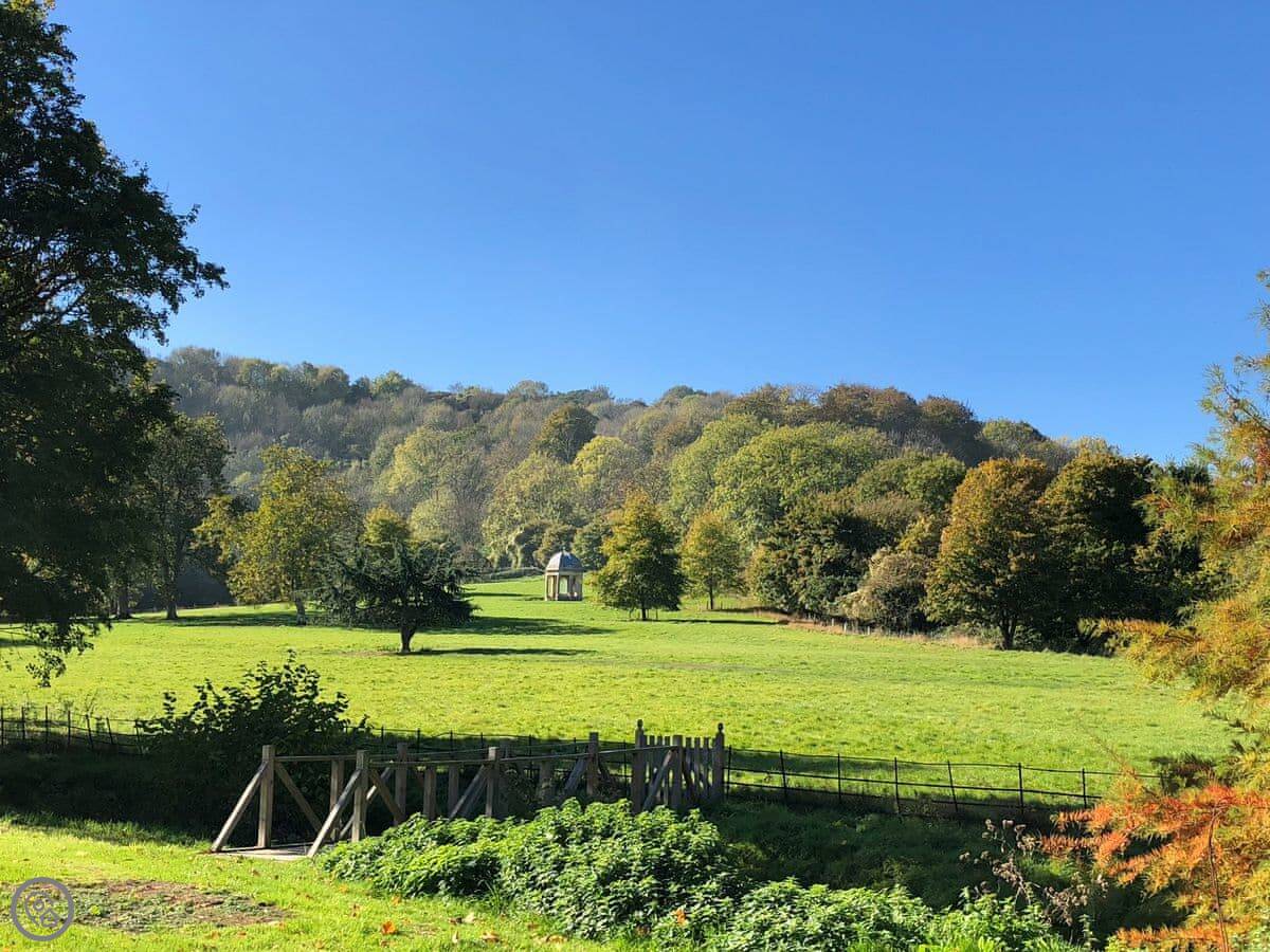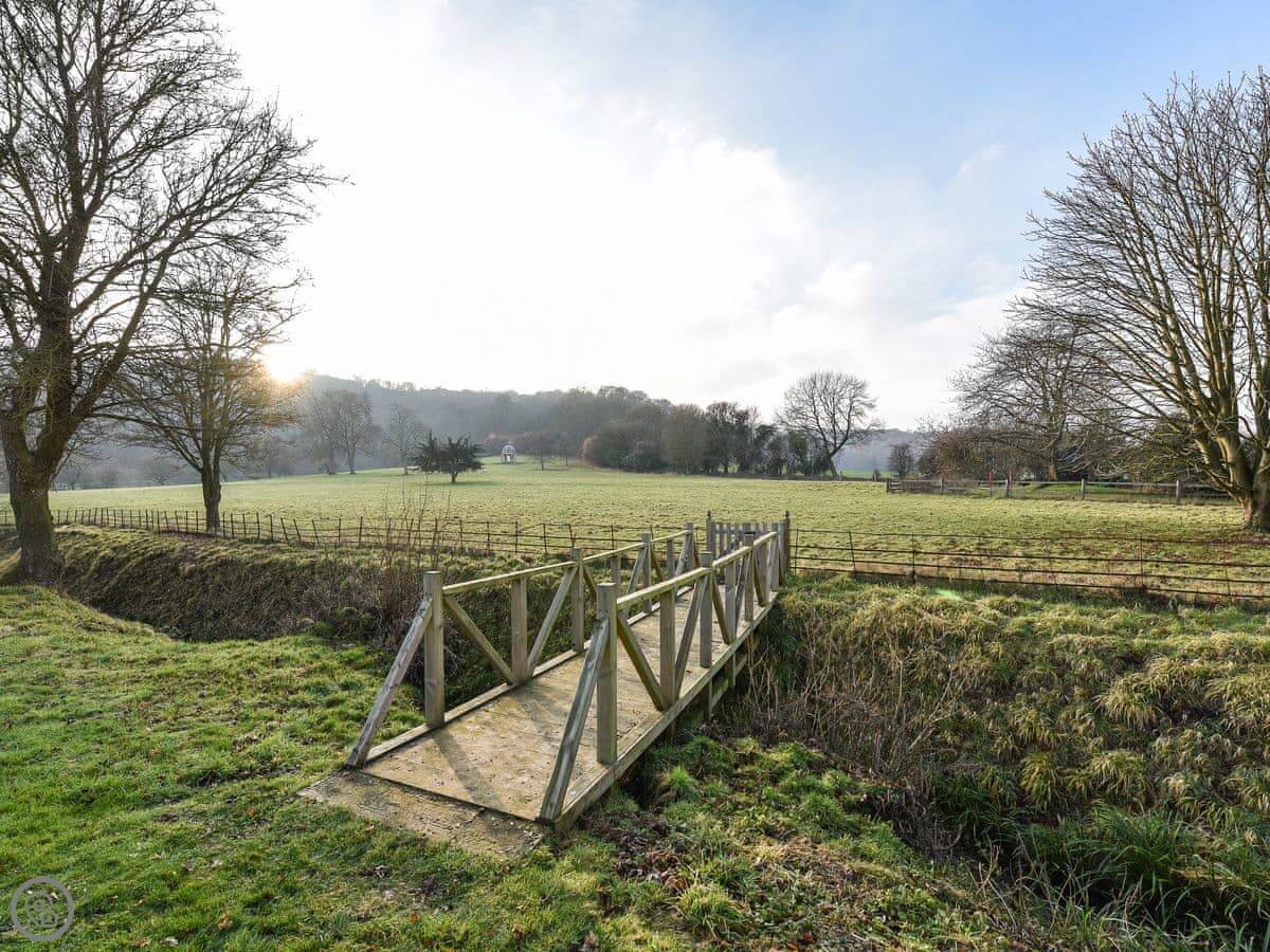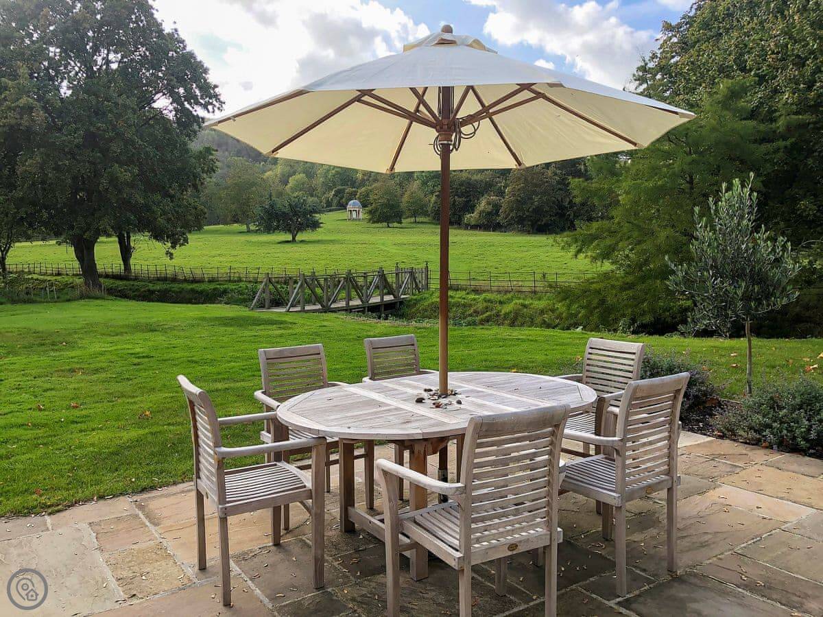 Outside, there's a terrace and a lawned garden. It looks out over fields. There's a folly in the next field you can see from the garden.