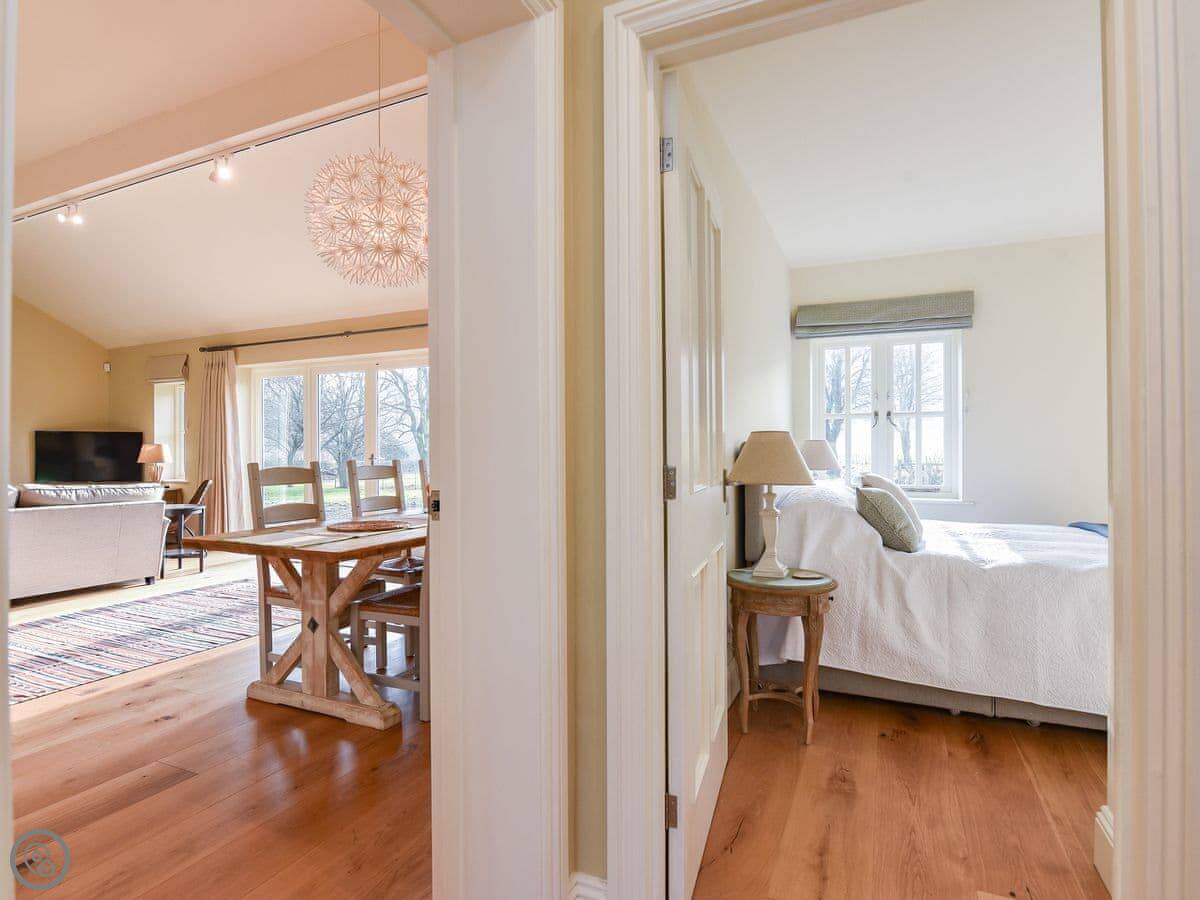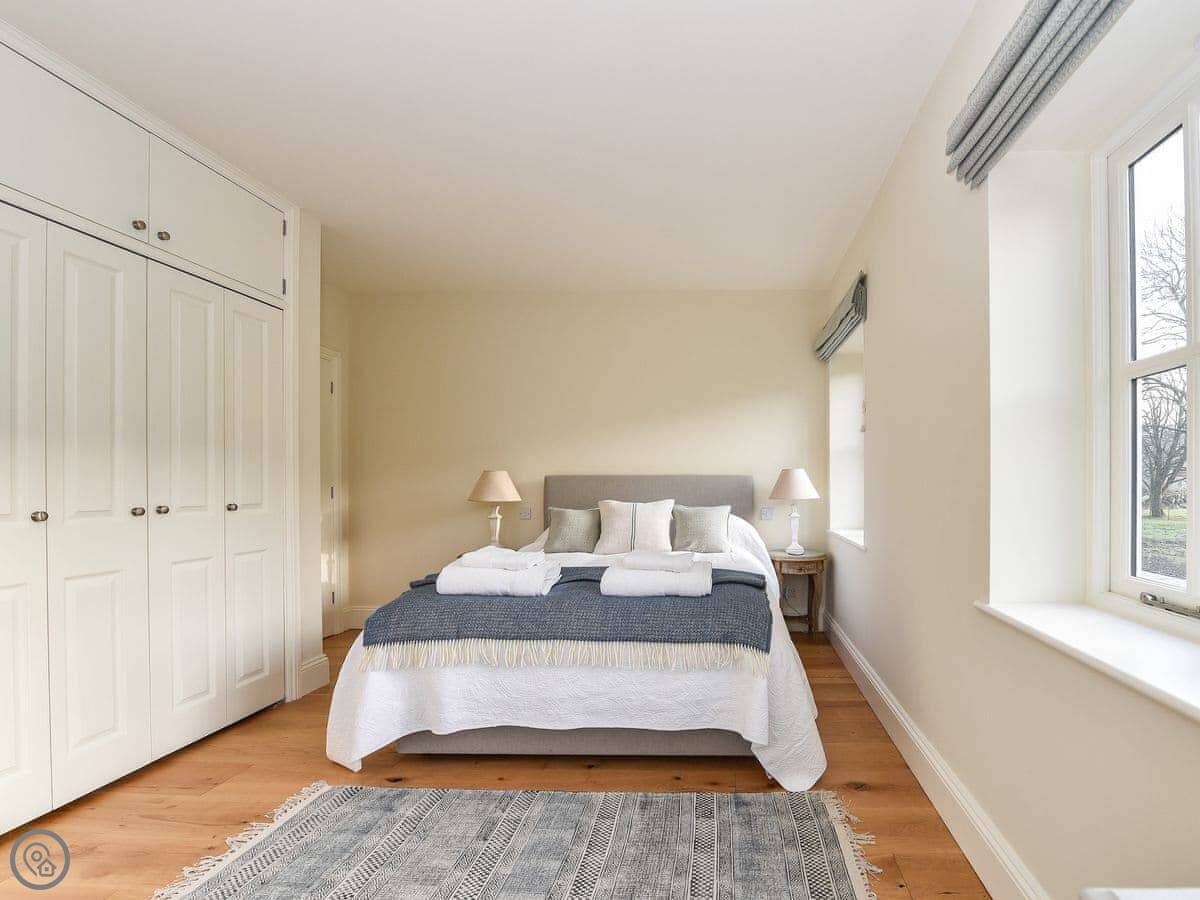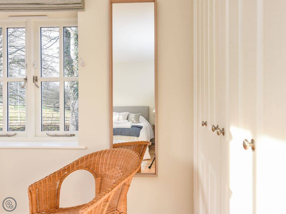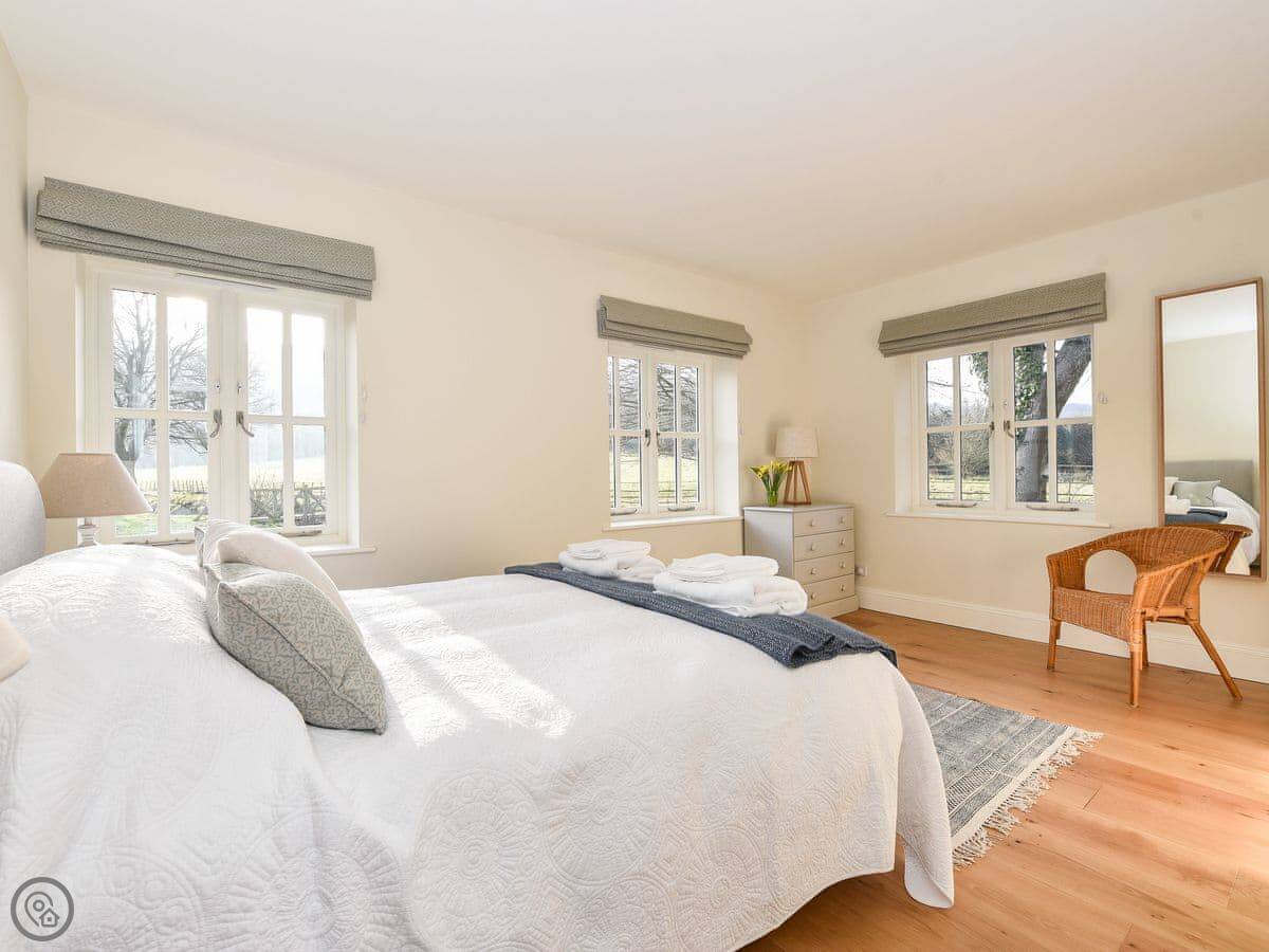 Outside, there's a terrace and a lawned garden. It looks out over fields. There's a folly in the next field you can see from the garden.