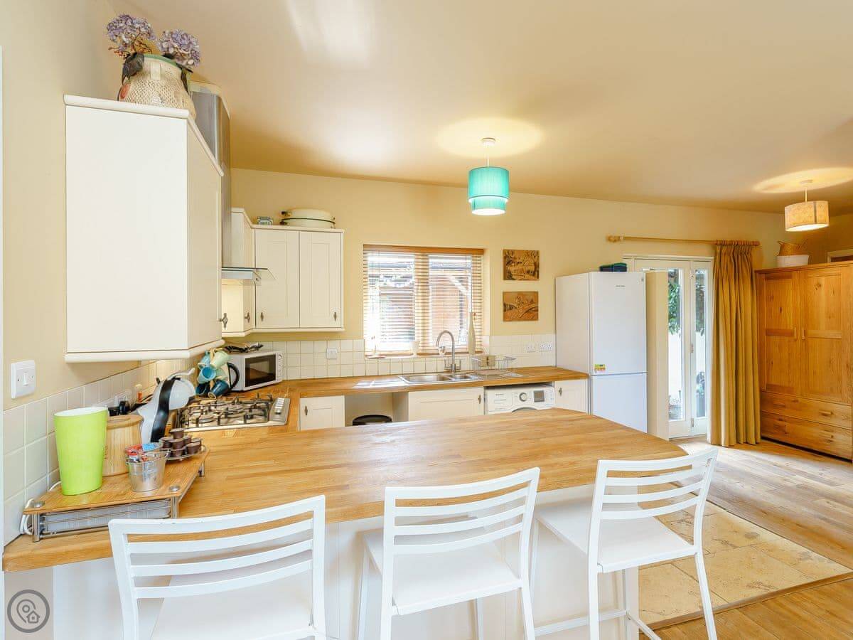 It’s a modern place, sleeps five. Two bedrooms and one bathroom. One of the bedrooms is also set up as a sitting room with a sofa, TV and doors to the garden. It all feels quite new and clean.