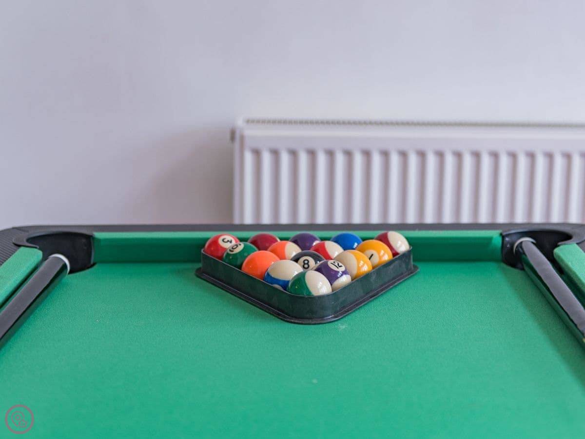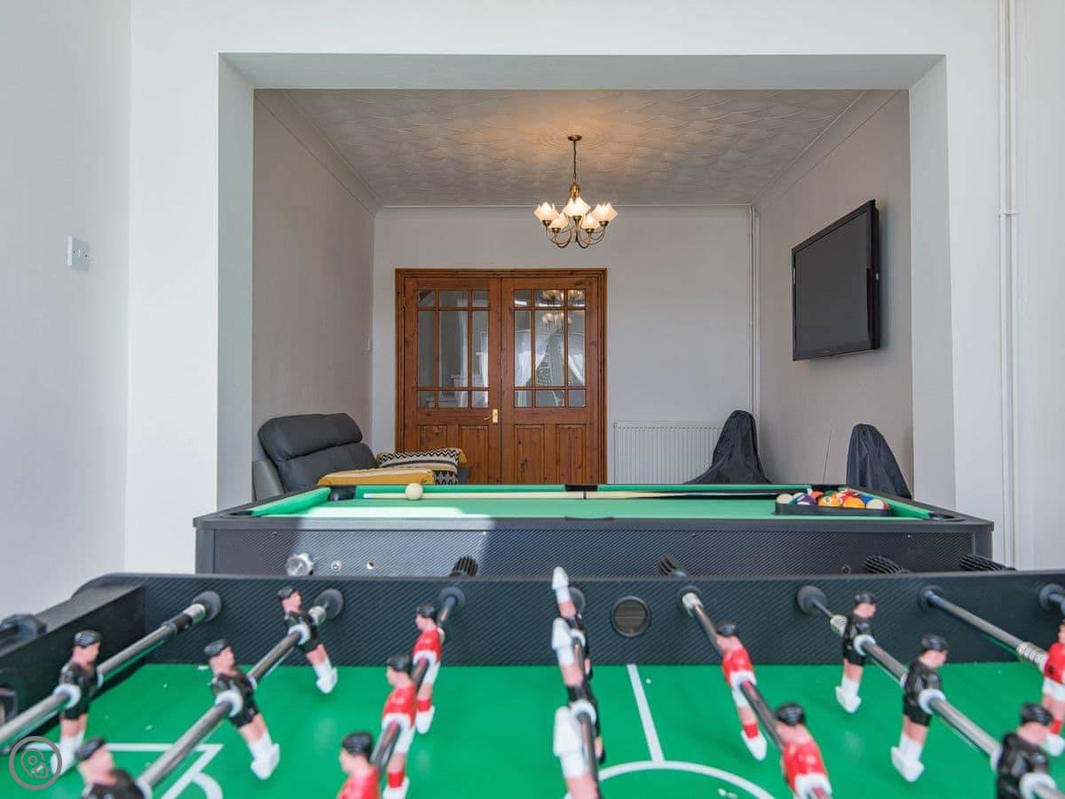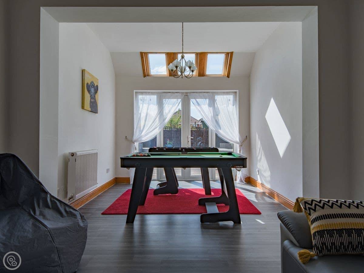 The living room is a good size. There's a games room with a table tennis table, which is handy if the weather turns. The kitchen is open plan with the dining area. French doors open onto a deck and a decent sized garden, which is fenced in. Good for sitting out or if you've got kids.