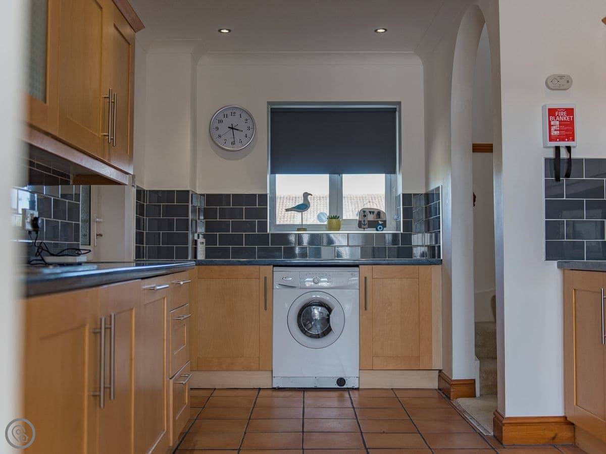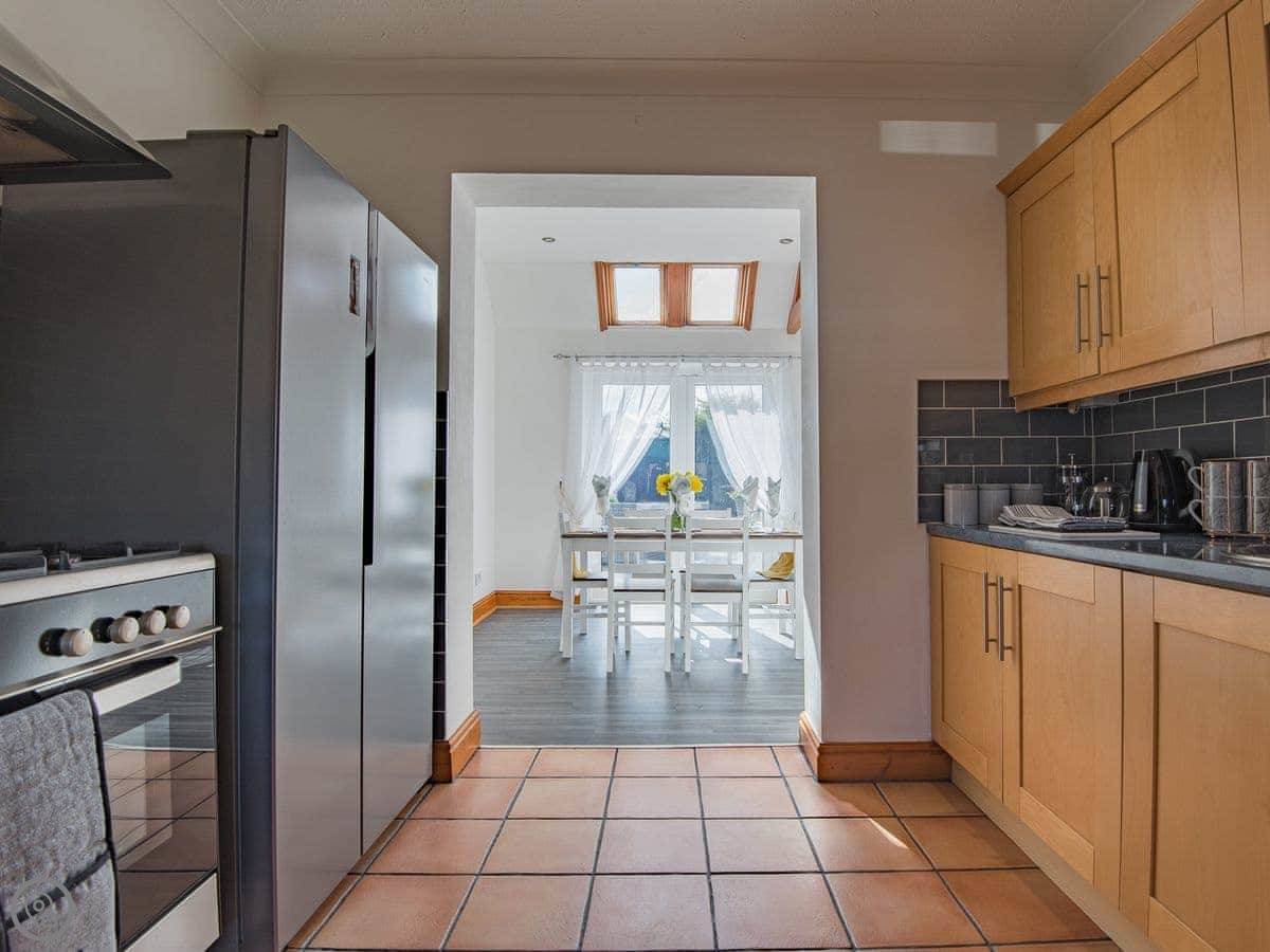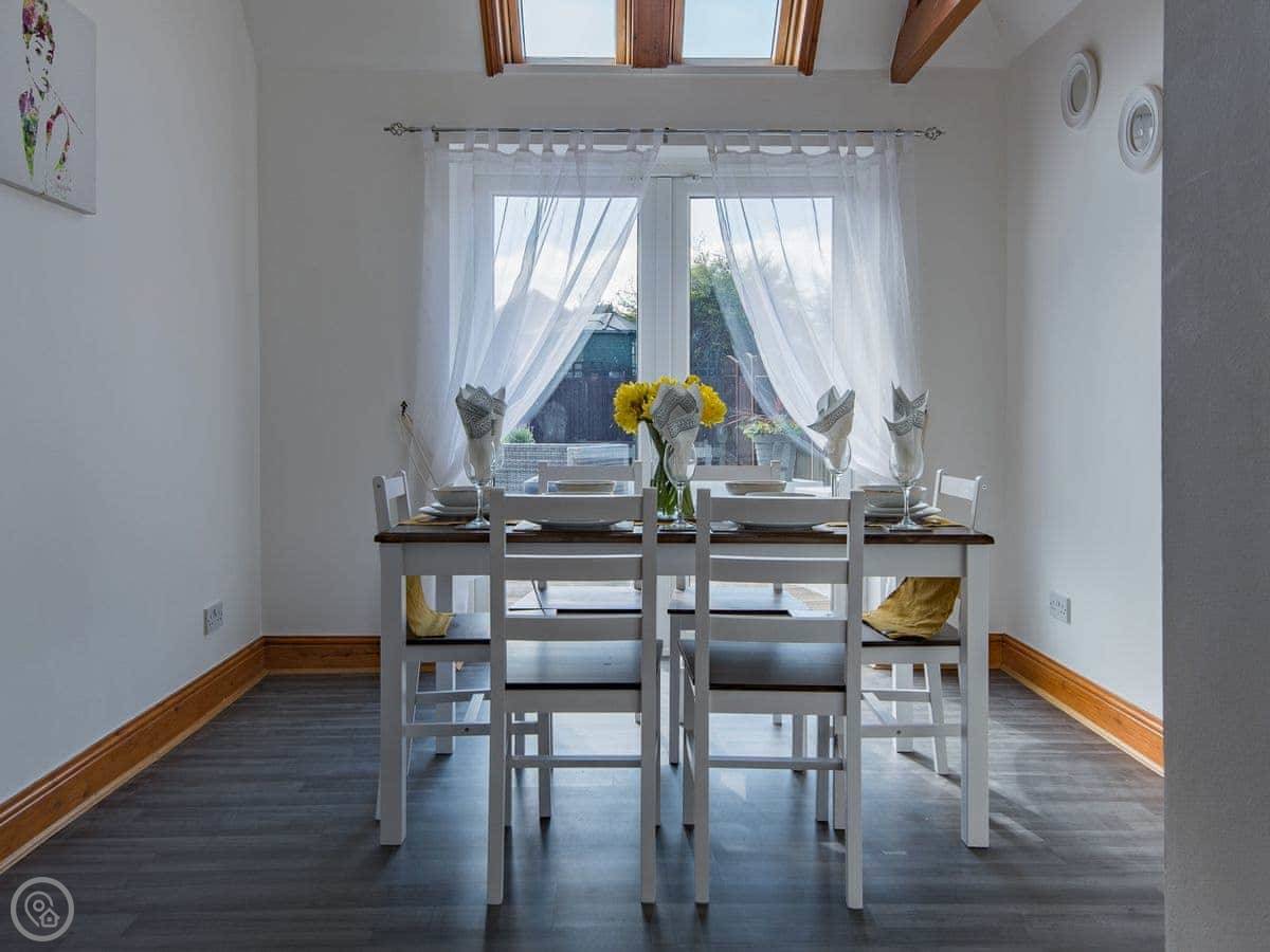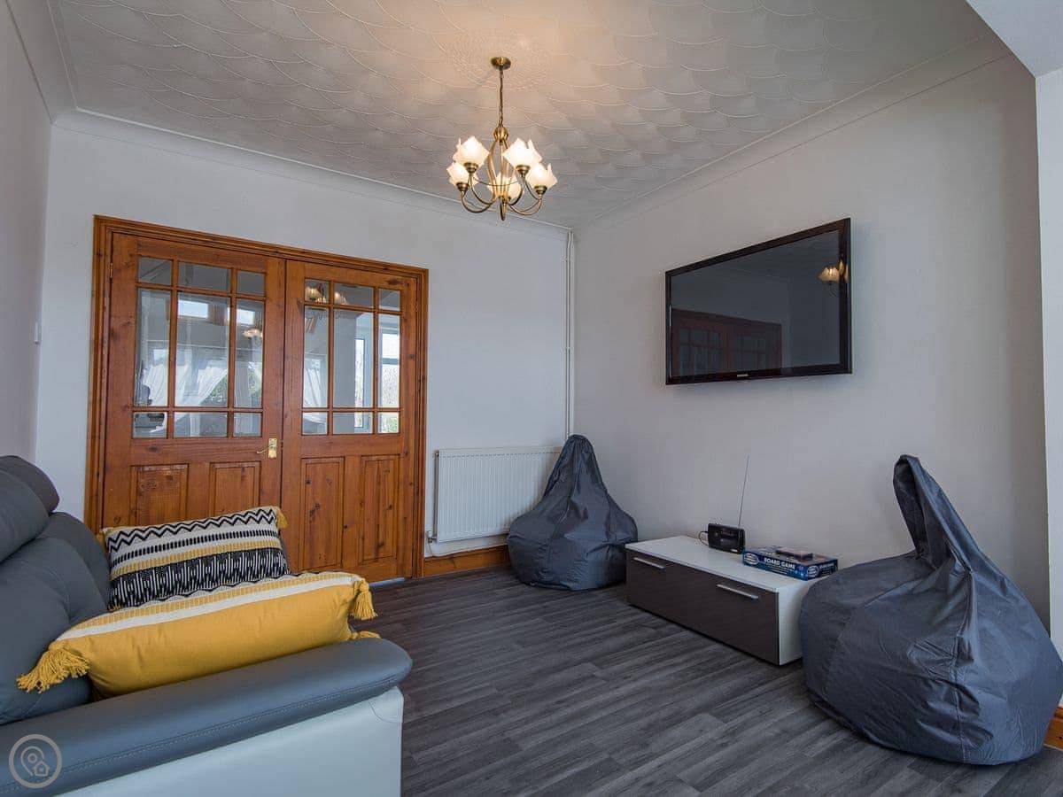 The living room is a good size. There's a games room with a table tennis table, which is handy if the weather turns. The kitchen is open plan with the dining area. French doors open onto a deck and a decent sized garden, which is fenced in. Good for sitting out or if you've got kids.