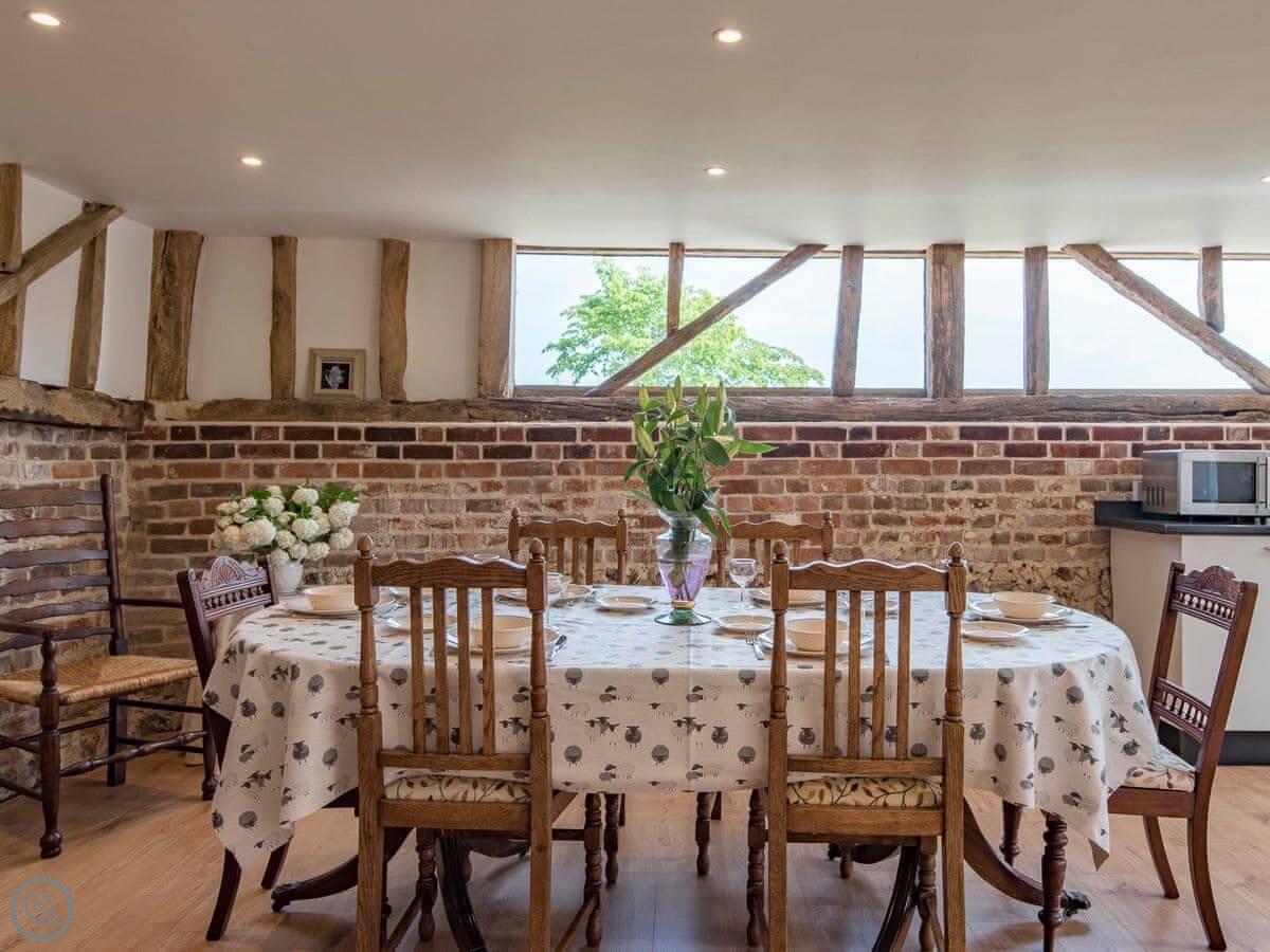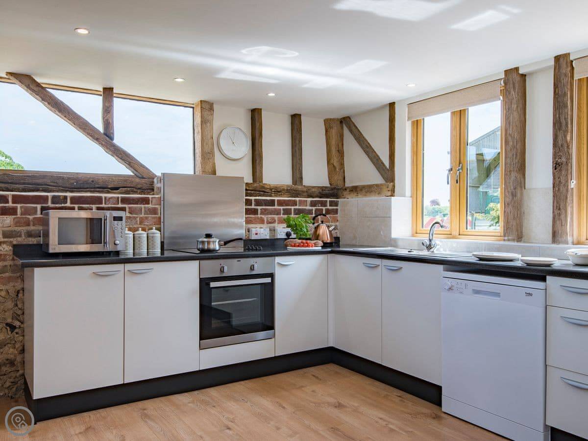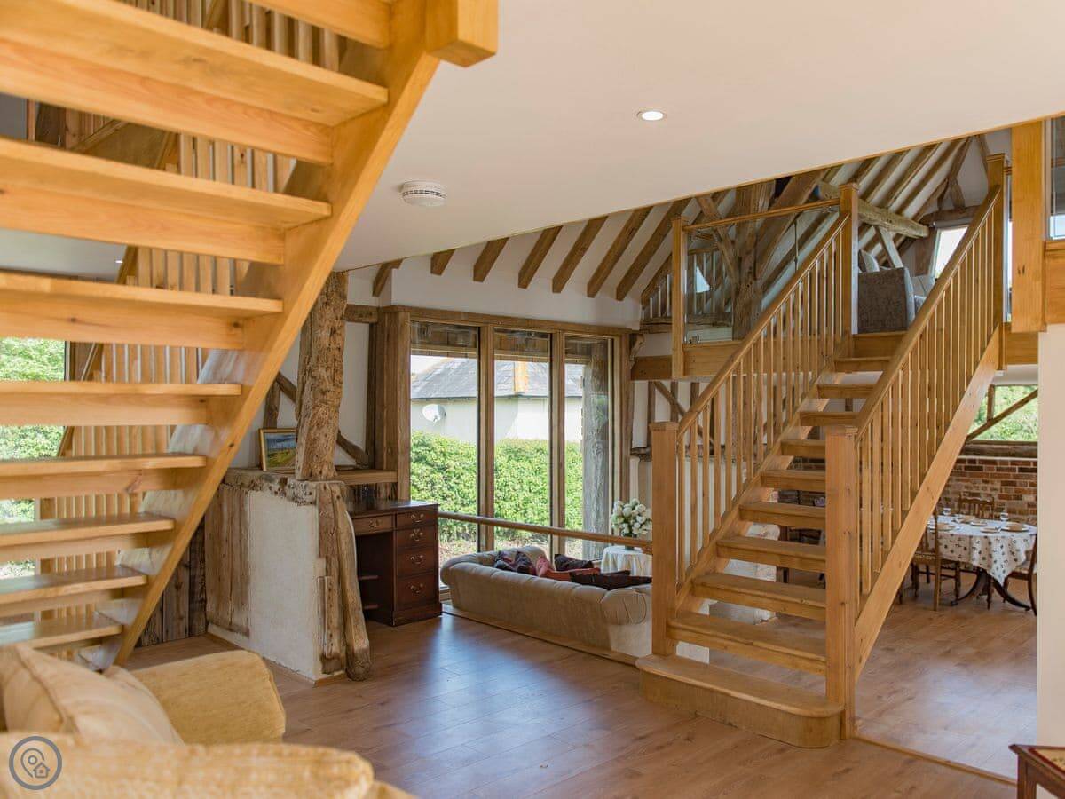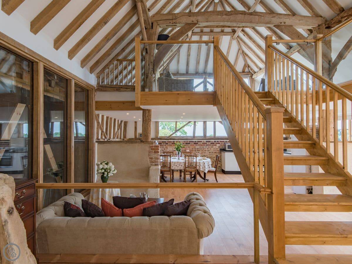 It's a barn conversion, so the ceilings are high and there are old oak beams. The main living area is up a flight of stairs on a sort of mezzanine floor. It looks down over the kitchen through a glass balcony. The best bit is the big picture window in that living room. On a clear day you can see for miles, right out to the coast near Whitstable.