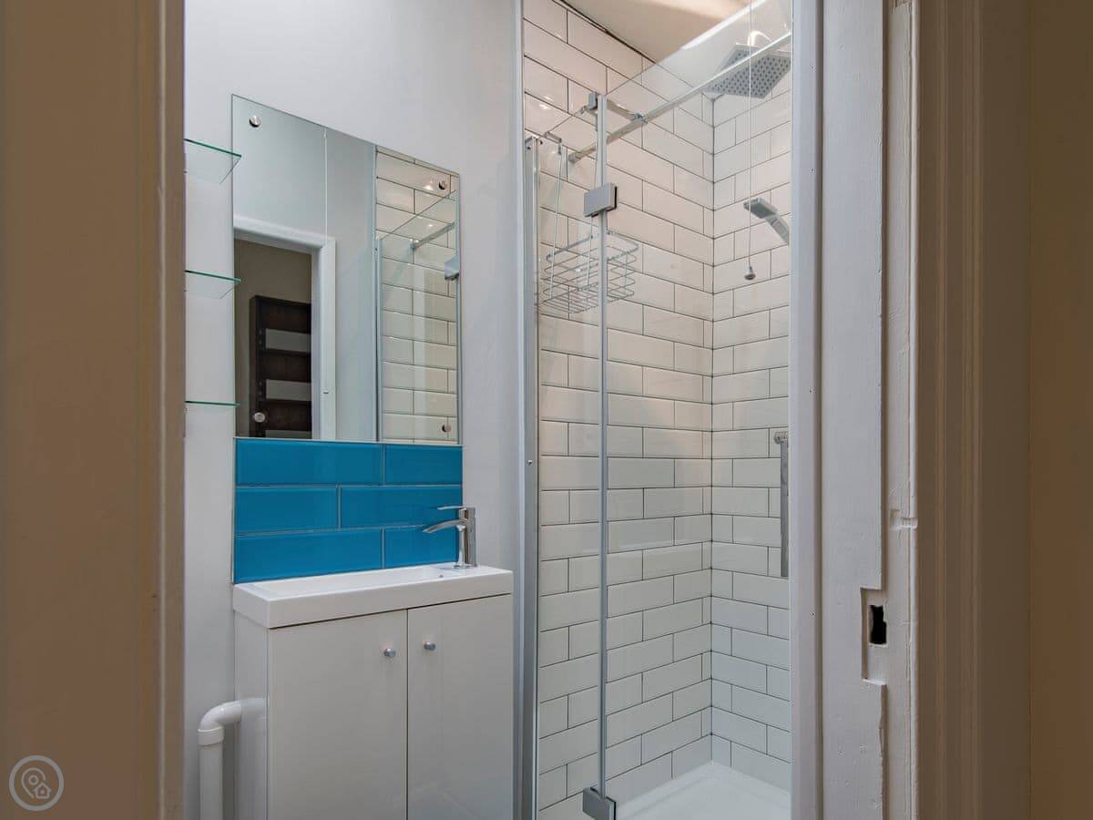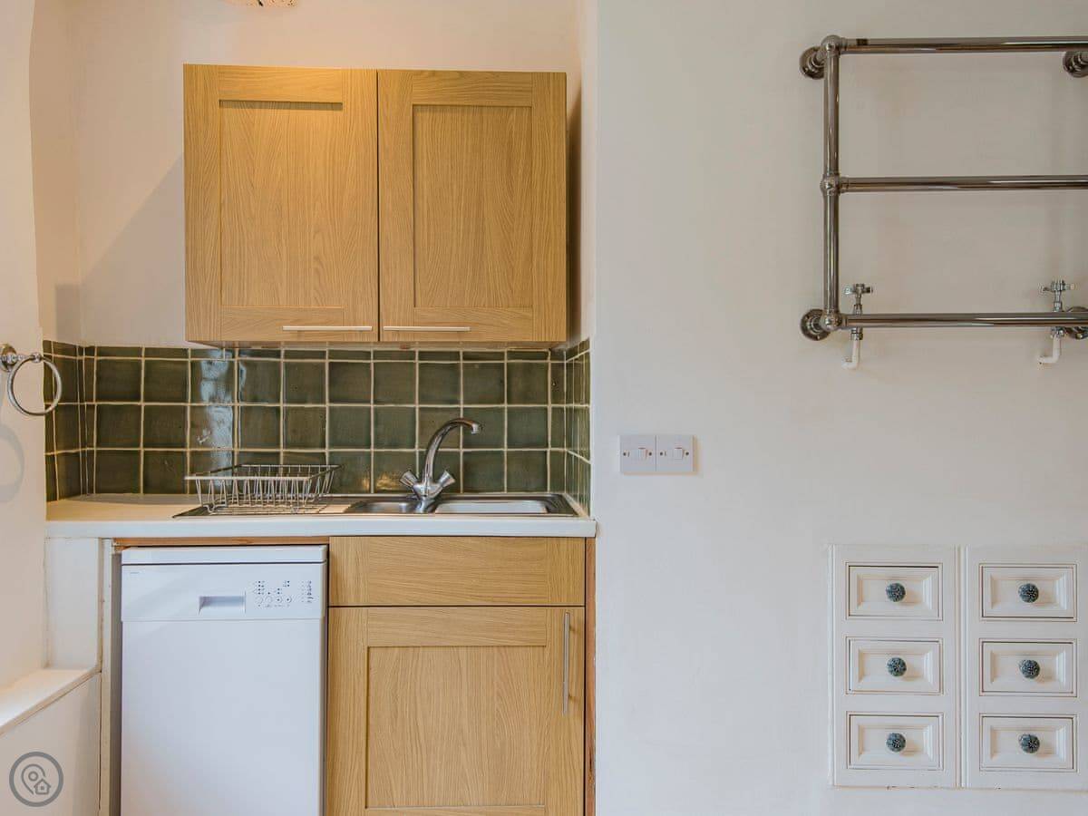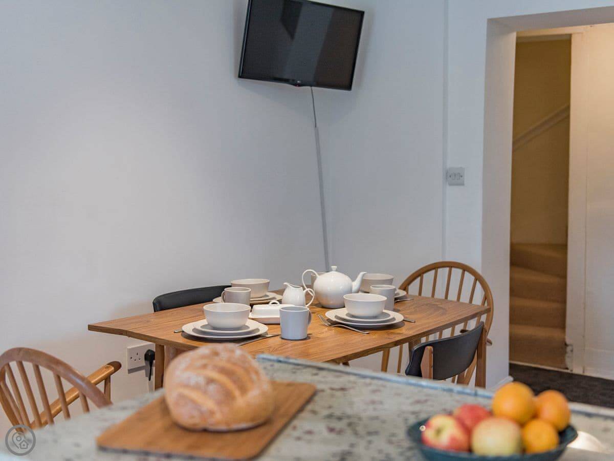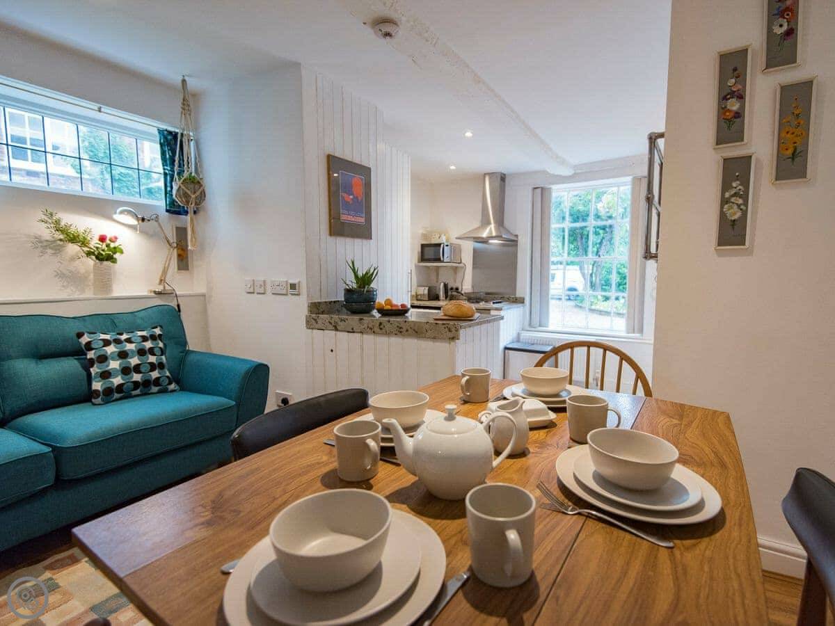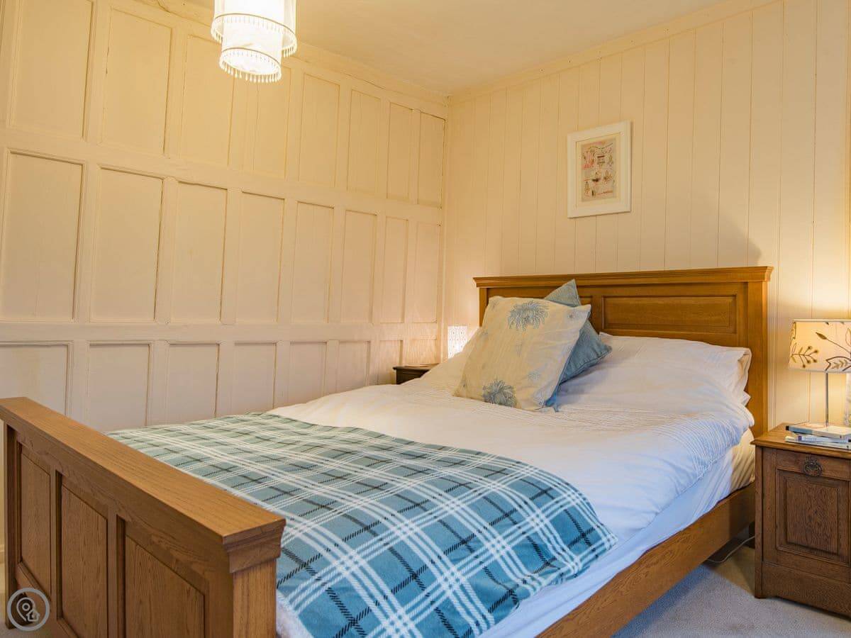 This cottage has a small snug open plan living area with comfy sofas and chairs, dining table and chairs, and kitchen. Upstairs are two double bedrooms and a shower room.