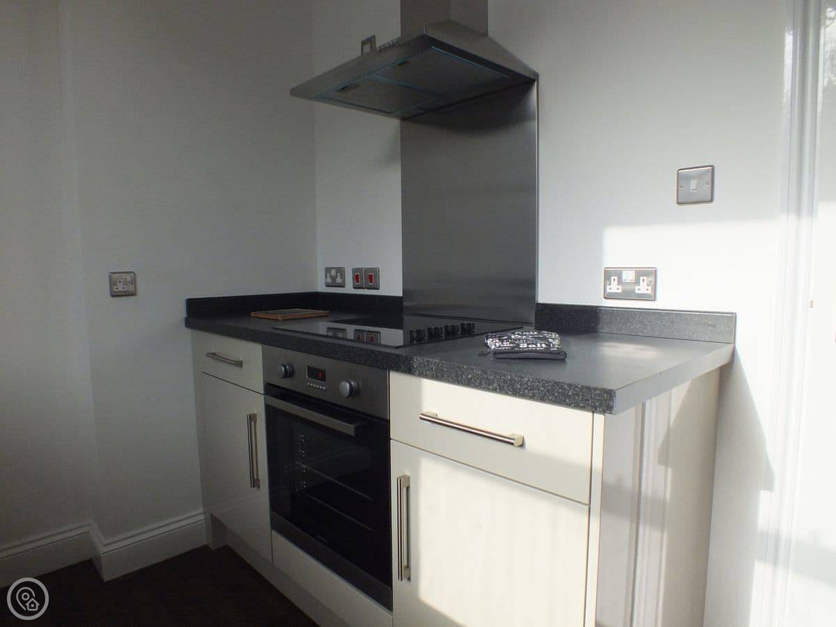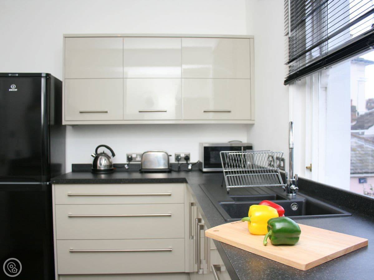 The kitchen is small but it's got everything: a dishwasher, washing machine, the usual. There's a table with stools. You'll probably eat out a lot because everything is on your doorstep, but it's there if you need it.
