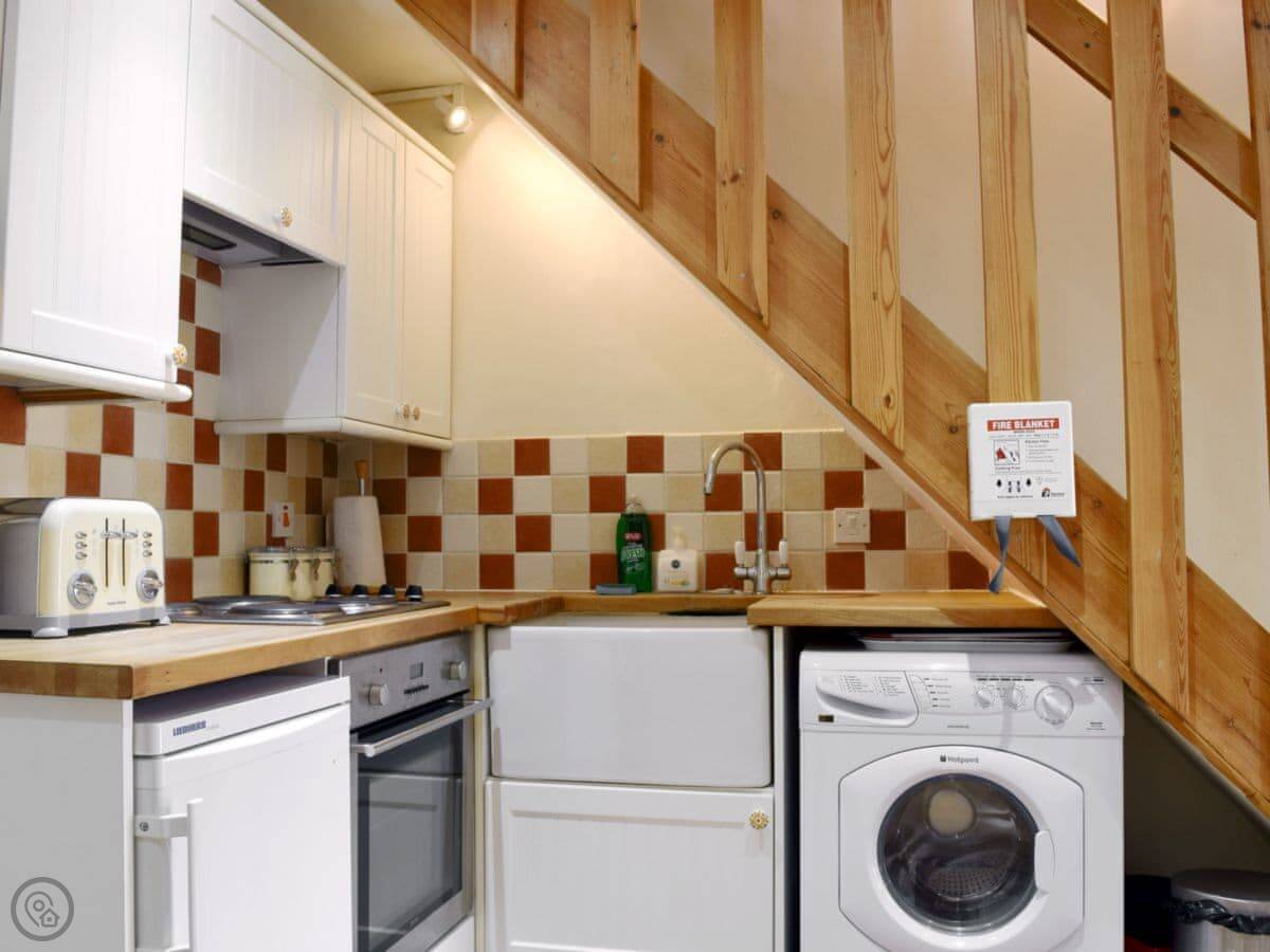 Inside, it’s got what you’d need: a dishwasher, washing machine, WiFi, TV. Bedding and towels are included. There’s parking right outside.