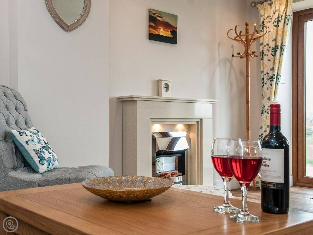 The main room is open plan. It's a good size, with big windows that look out over fields. There's a patio with a table and chairs. Parking is right outside.