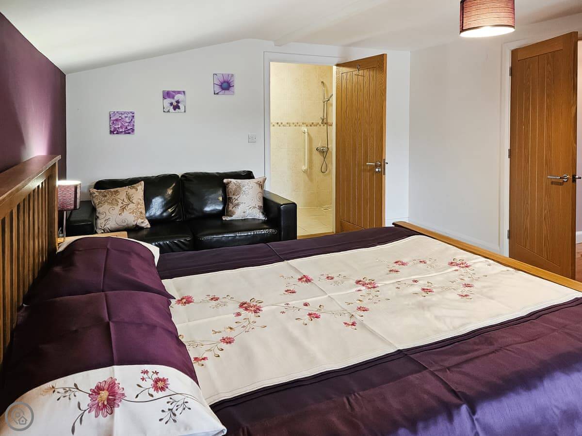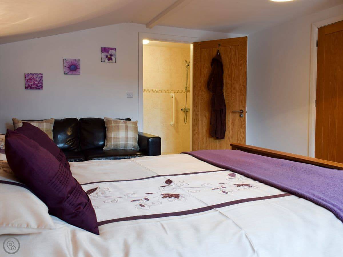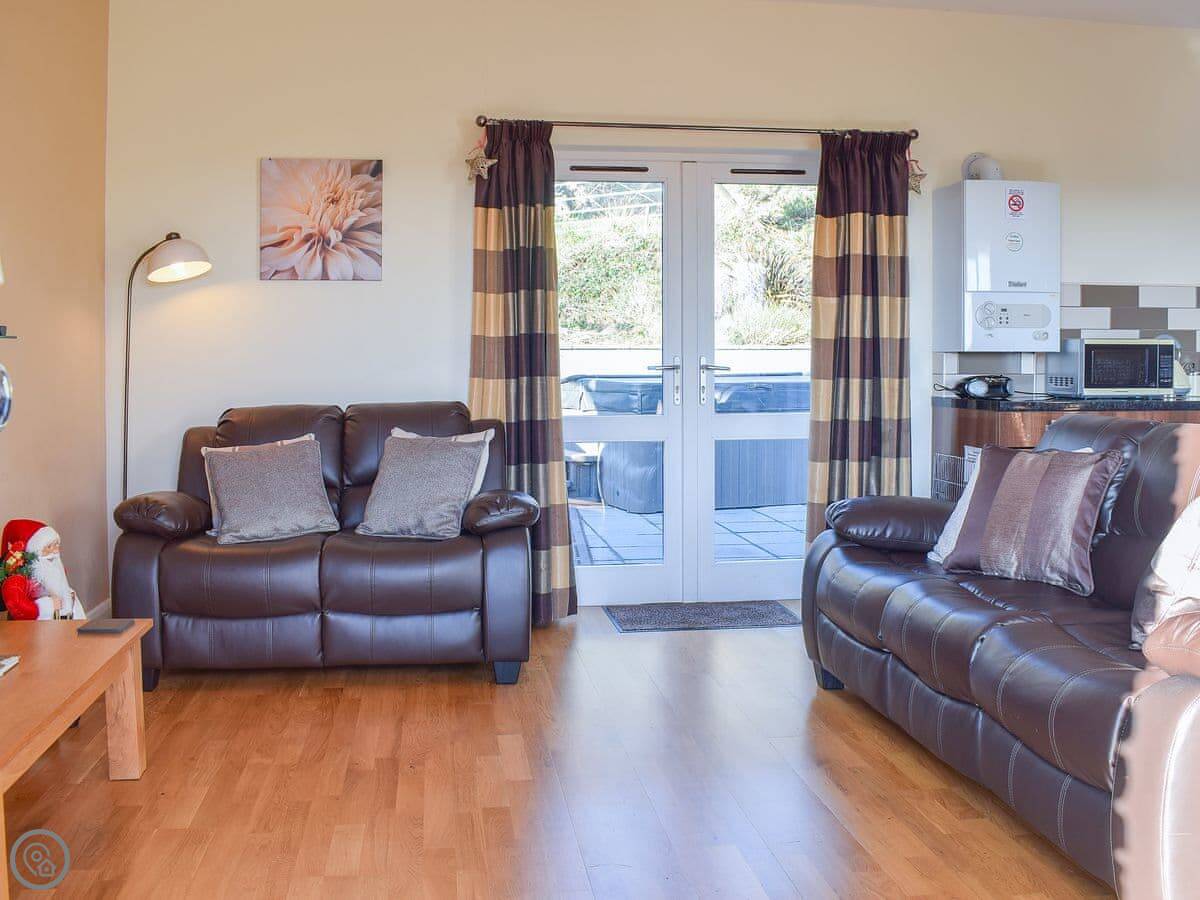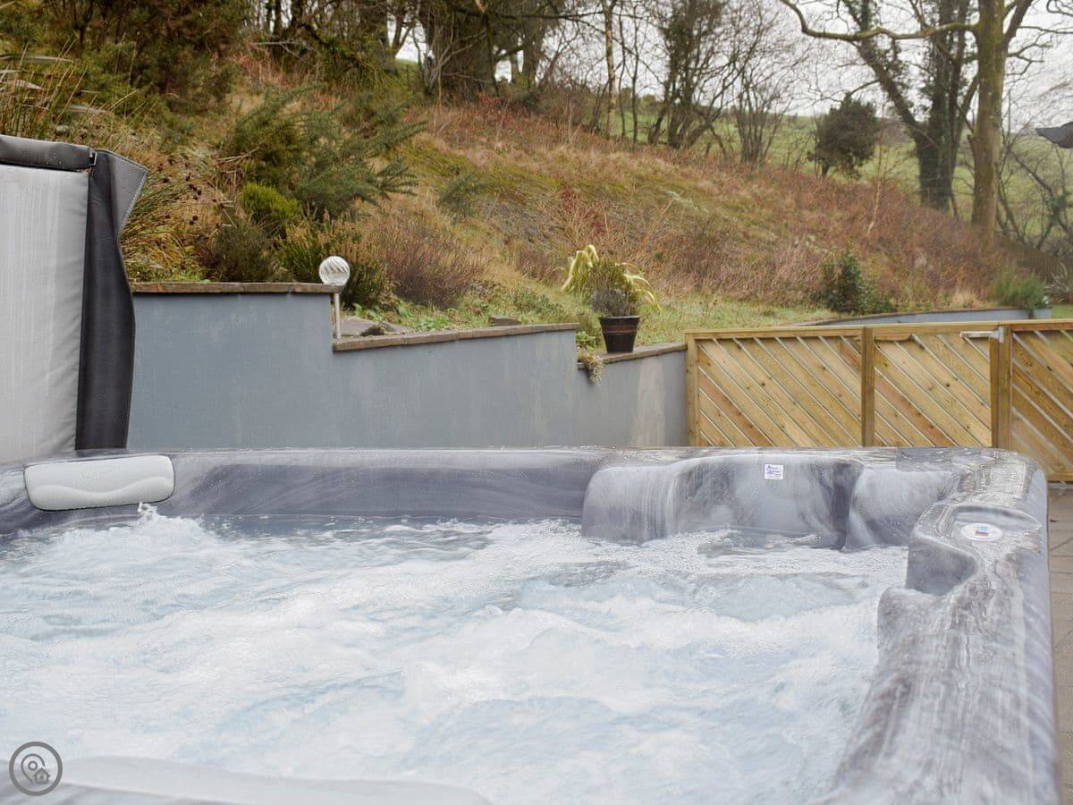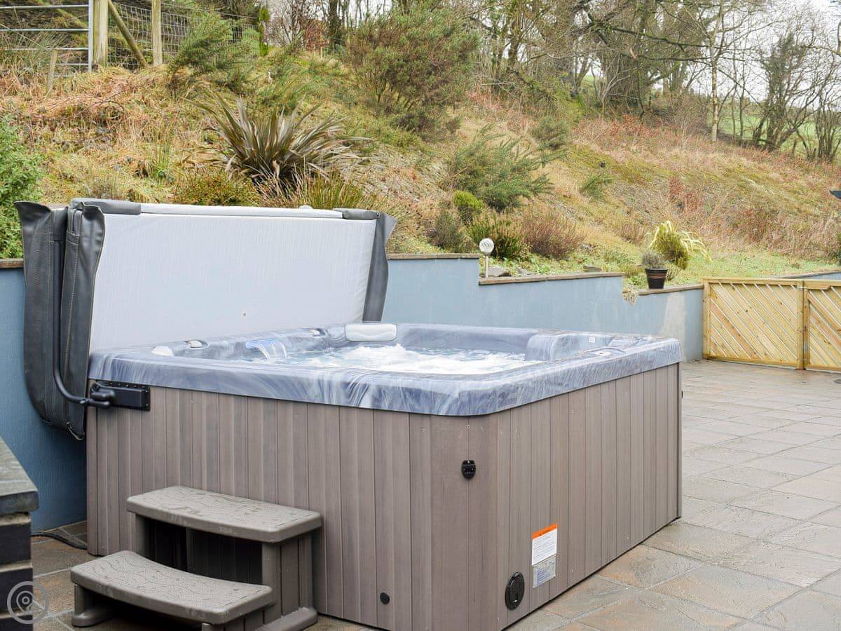 Outside, you have your own enclosed patio with a hot tub. There's parking right outside your door. The views are over fields. We've got a barn owl that lives around the place, so you might see it in the evening.