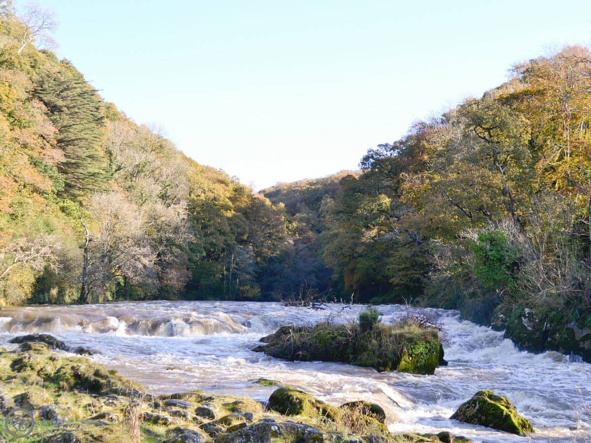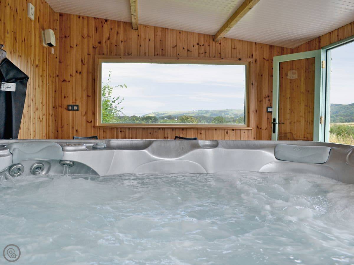 Outside, there's a wooden hot tub cabin that opens onto the garden. There's a barbecue and picnic bench. The property sits in 17 acres. Five of those are woodland, bordered by the River Teifi. About 150 yards from the back door, down by the river, we've put another picnic bench and a firepit. It's a good spot. You'll often see herons, sometimes an otter or a kingfisher.