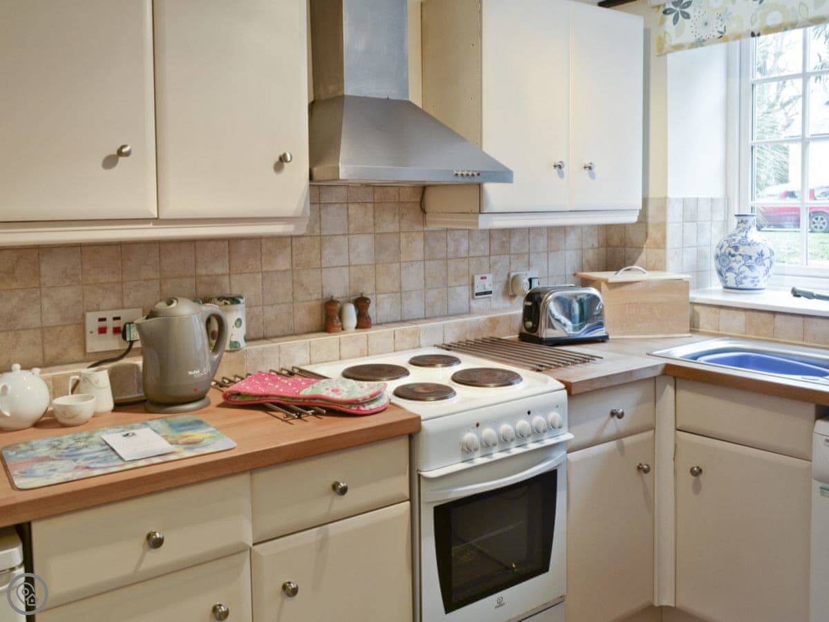 It sleeps four. Two bedrooms, one bathroom. It's got a 4 Star rating. It's comfortable. There's a woodburning stove for cooler evenings, which is nice. Everything's included: towels, bedding. There's a washing machine, a cot, a highchair. Parking is right there.