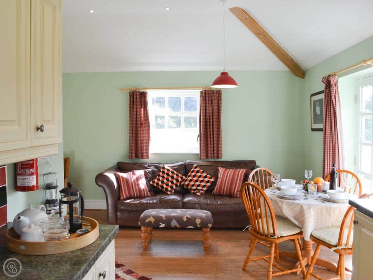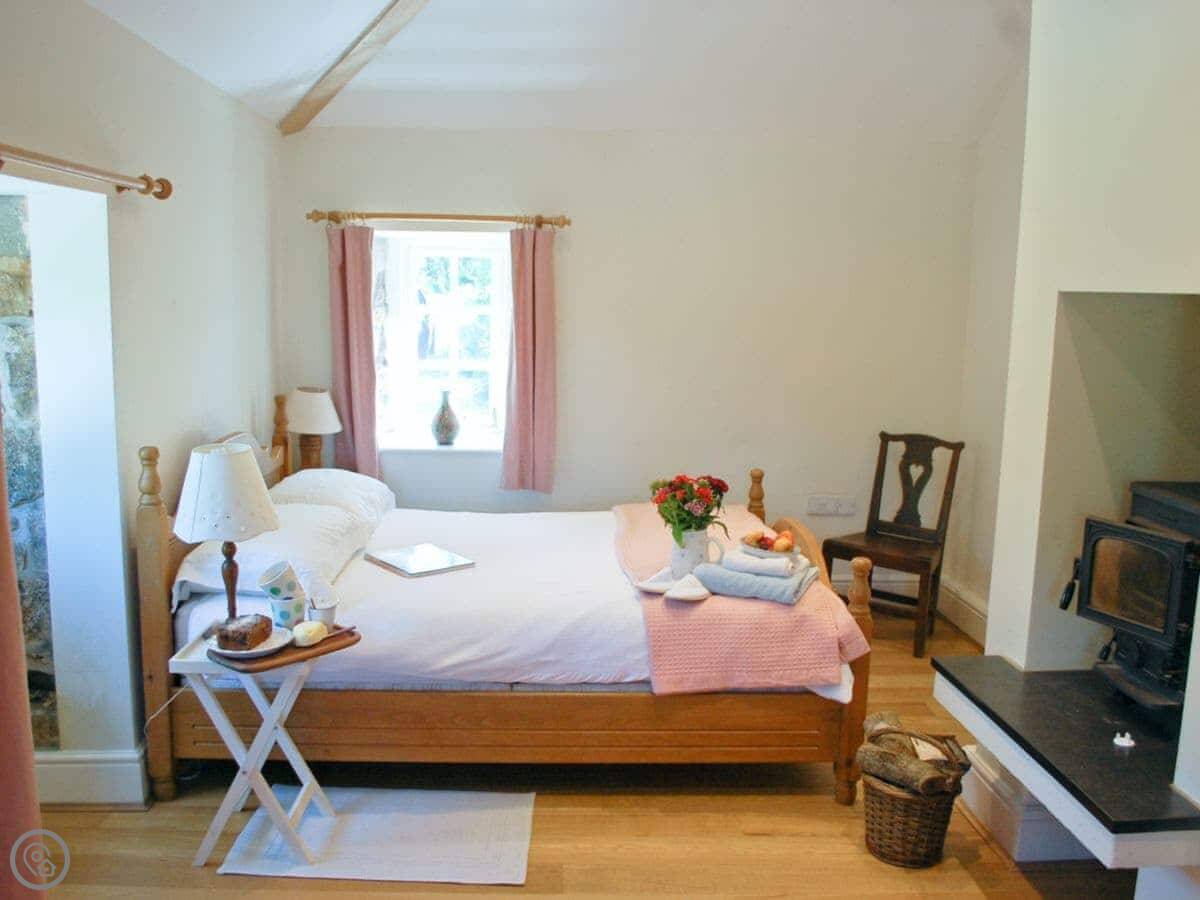 It sleeps four. Two bedrooms and one bathroom. It’s got a 5 Star rating, which means it’s comfortable and well looked after. There are two wood-burning stoves and underfloor heating downstairs. The beams are original.