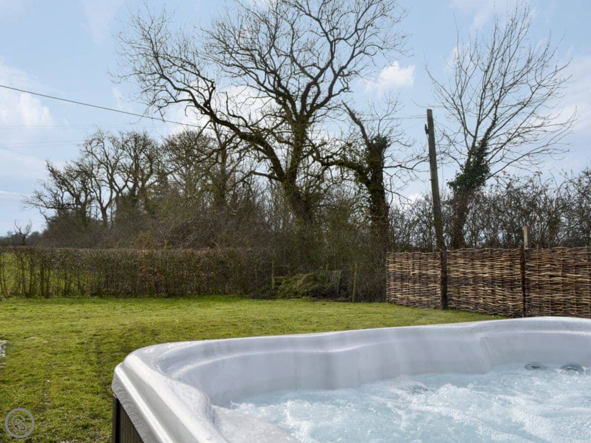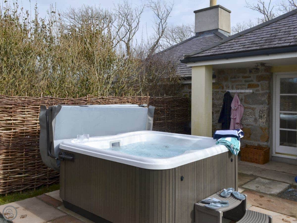 Outside, there’s an enclosed garden with a hot tub. It looks out over fields and woods. You’re also welcome to walk around the farm’s 75 acres. There’s parking right there.