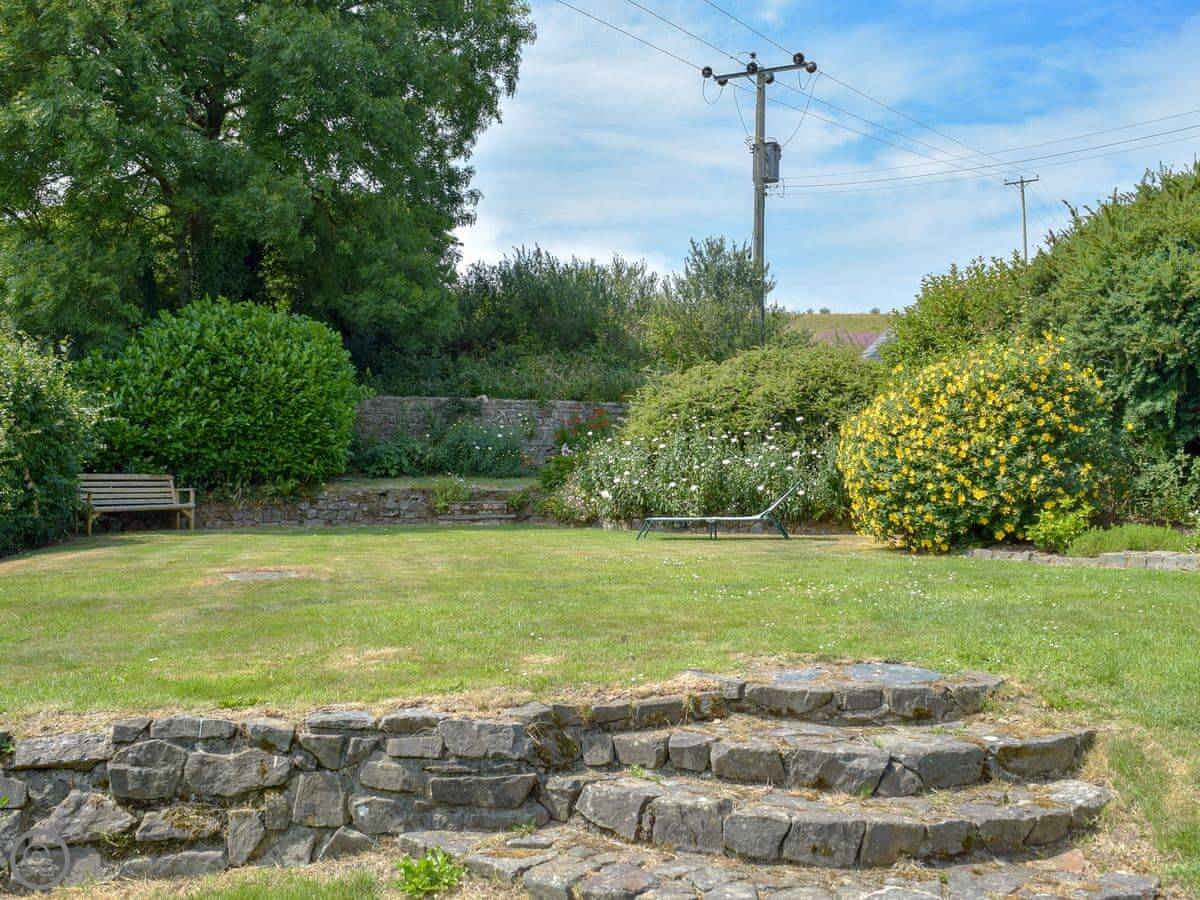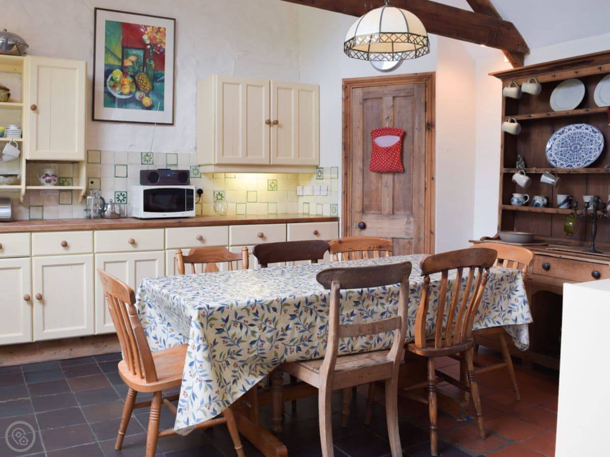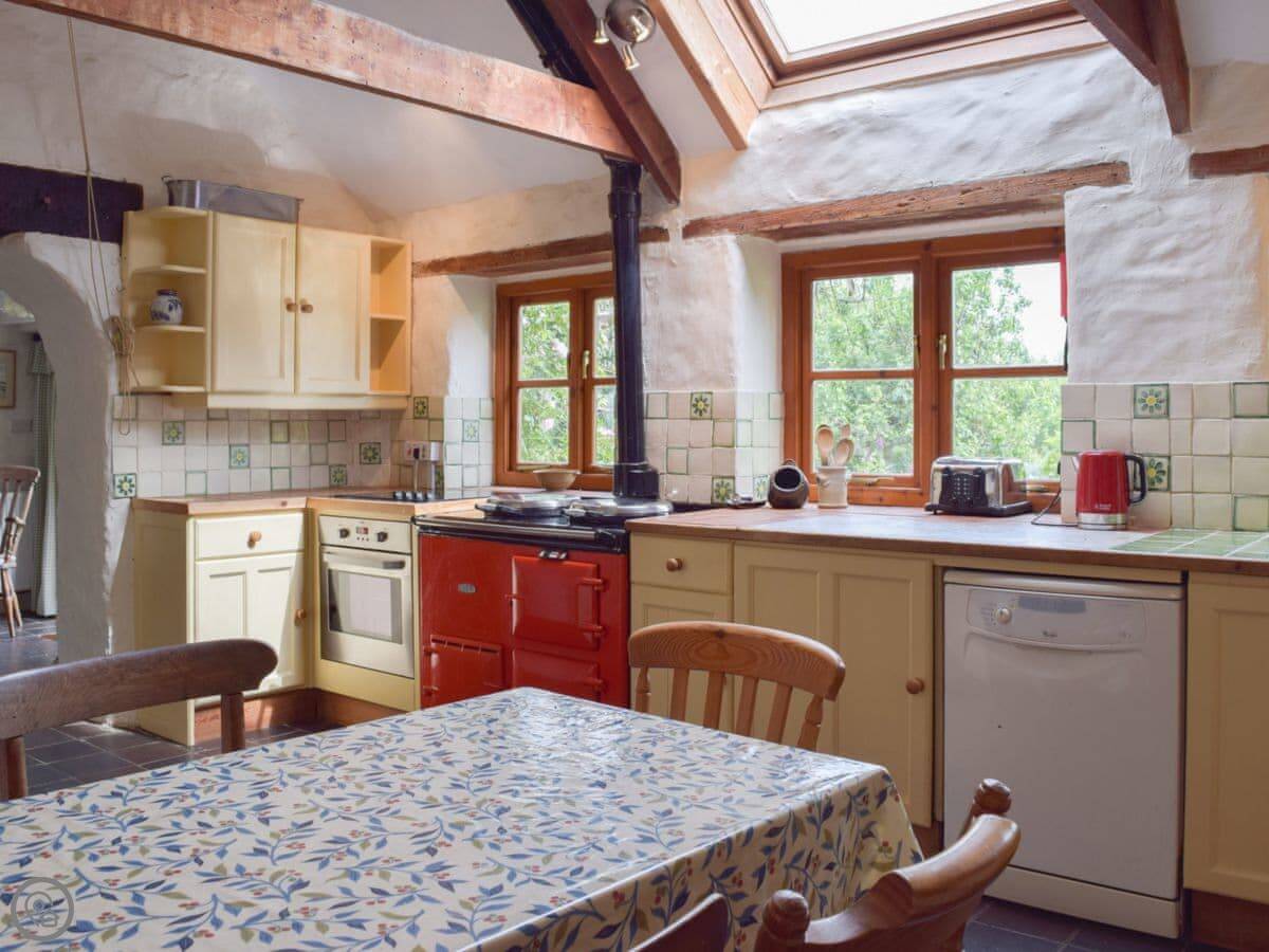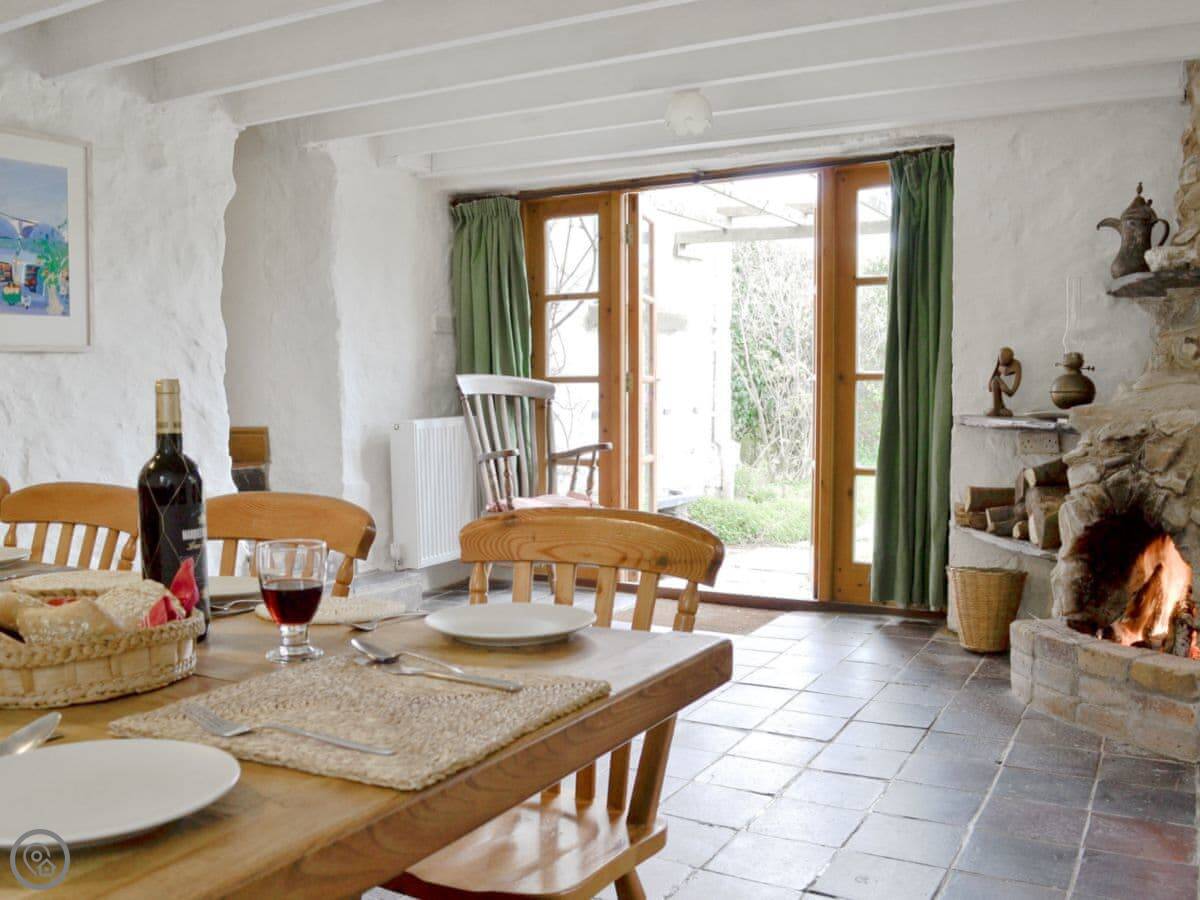 The kitchen has an Aga and a big dishwasher. The main living area has a big fireplace. The dining room has French doors that go out to the garden, which gets the sun and has a nice view over the valley.