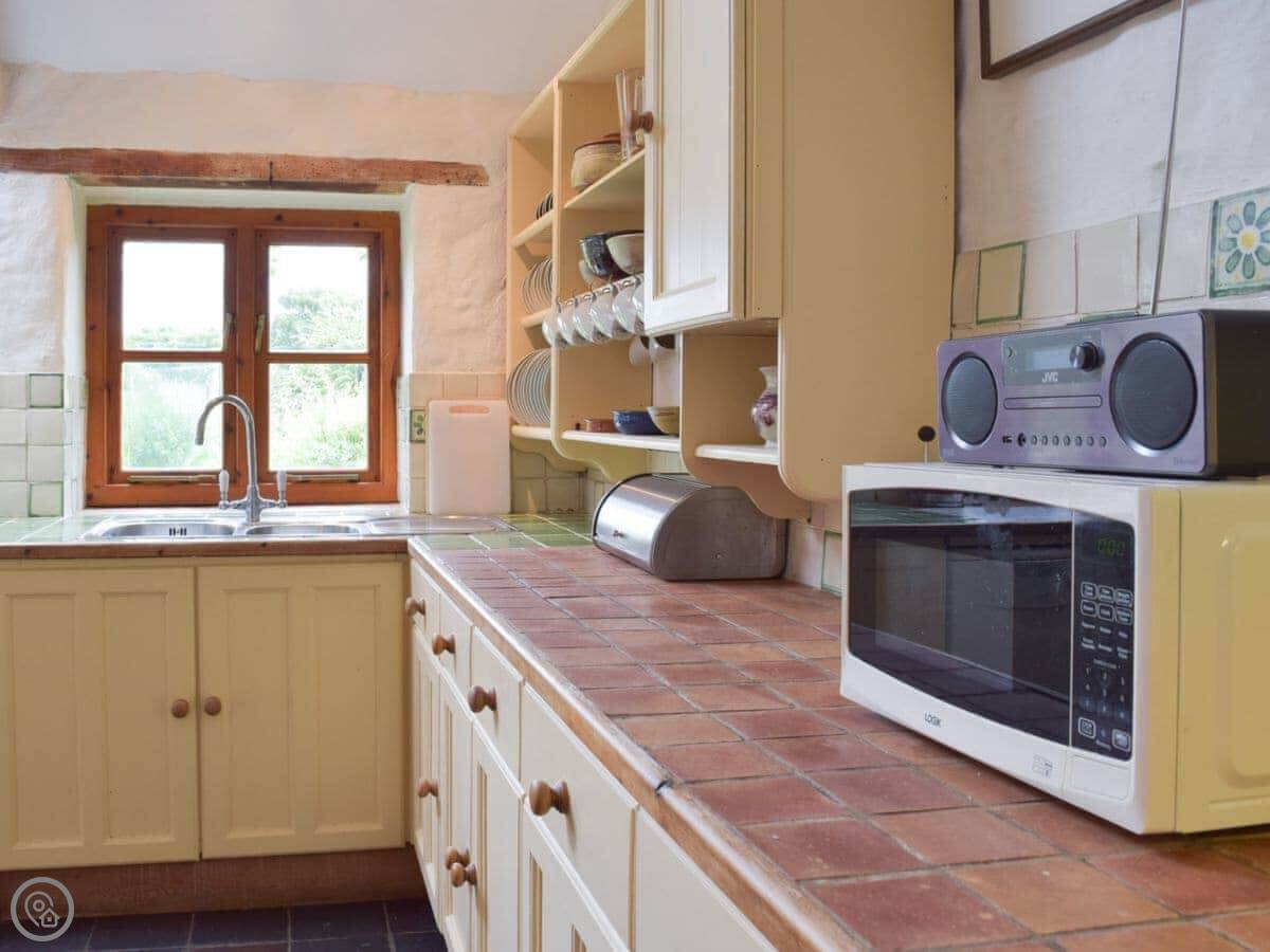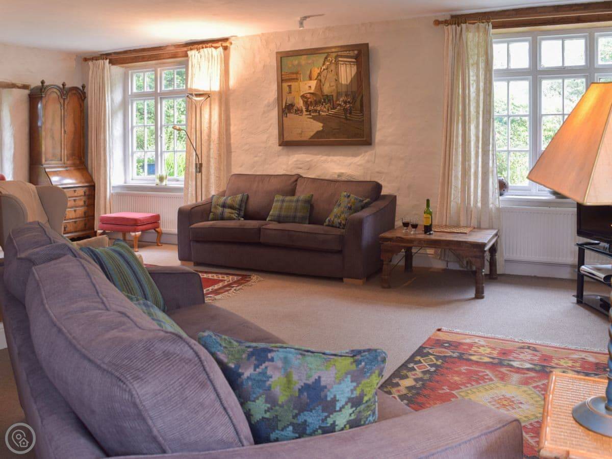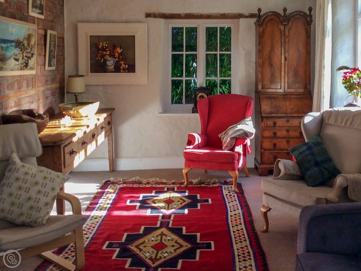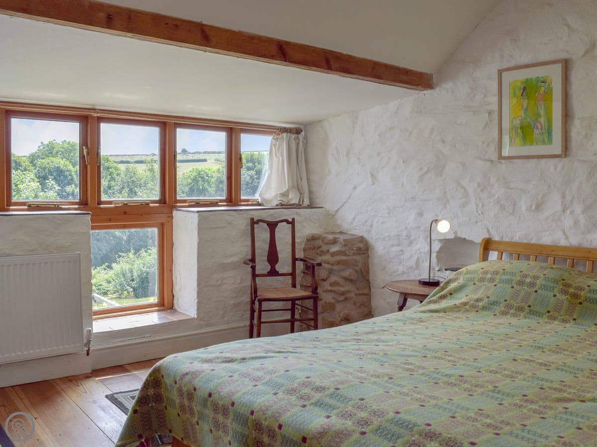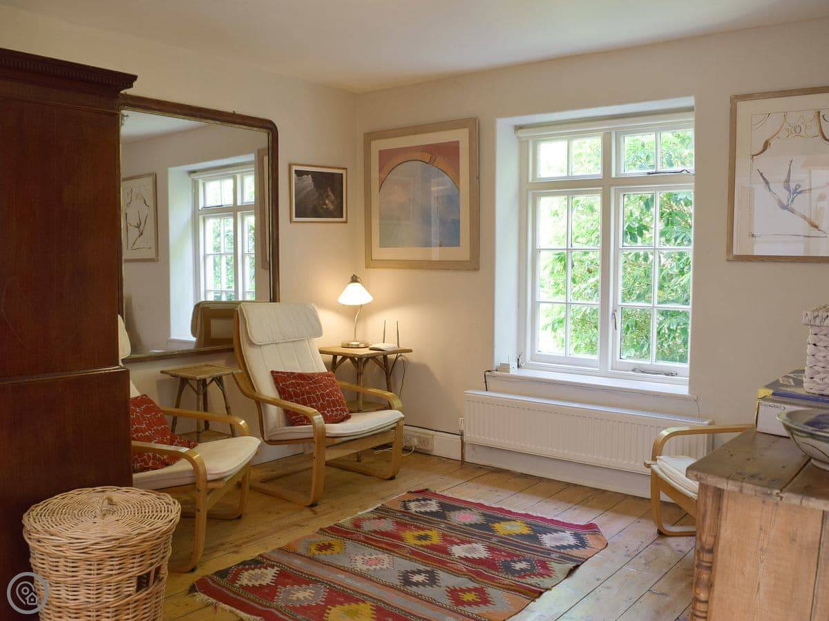 The kitchen has an Aga and a big dishwasher. The main living area has a big fireplace. The dining room has French doors that go out to the garden, which gets the sun and has a nice view over the valley.