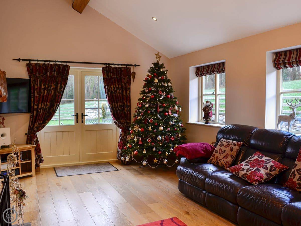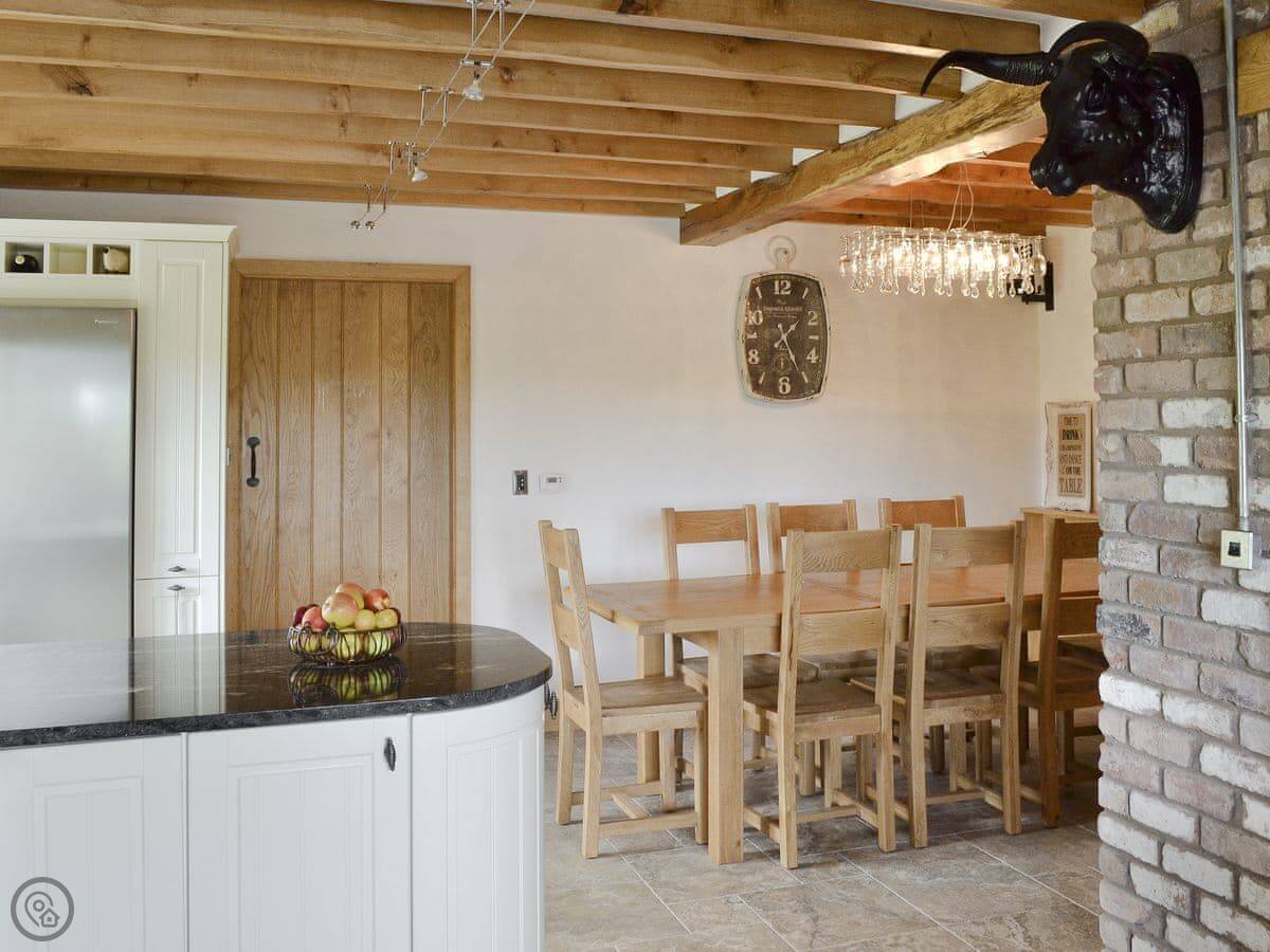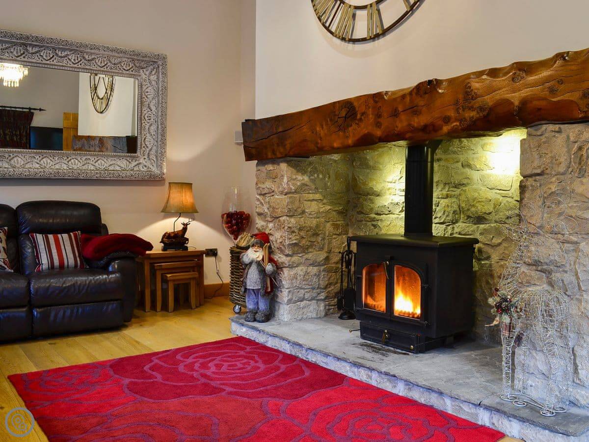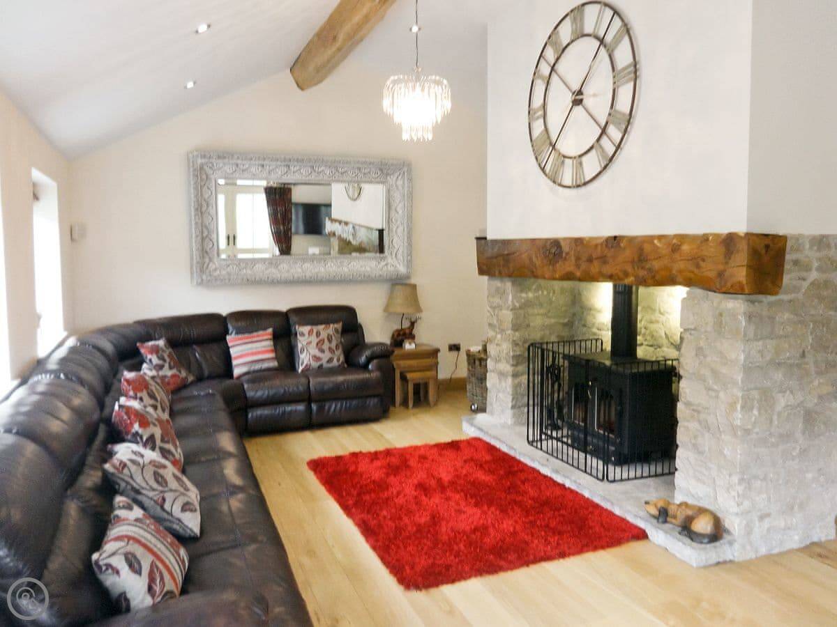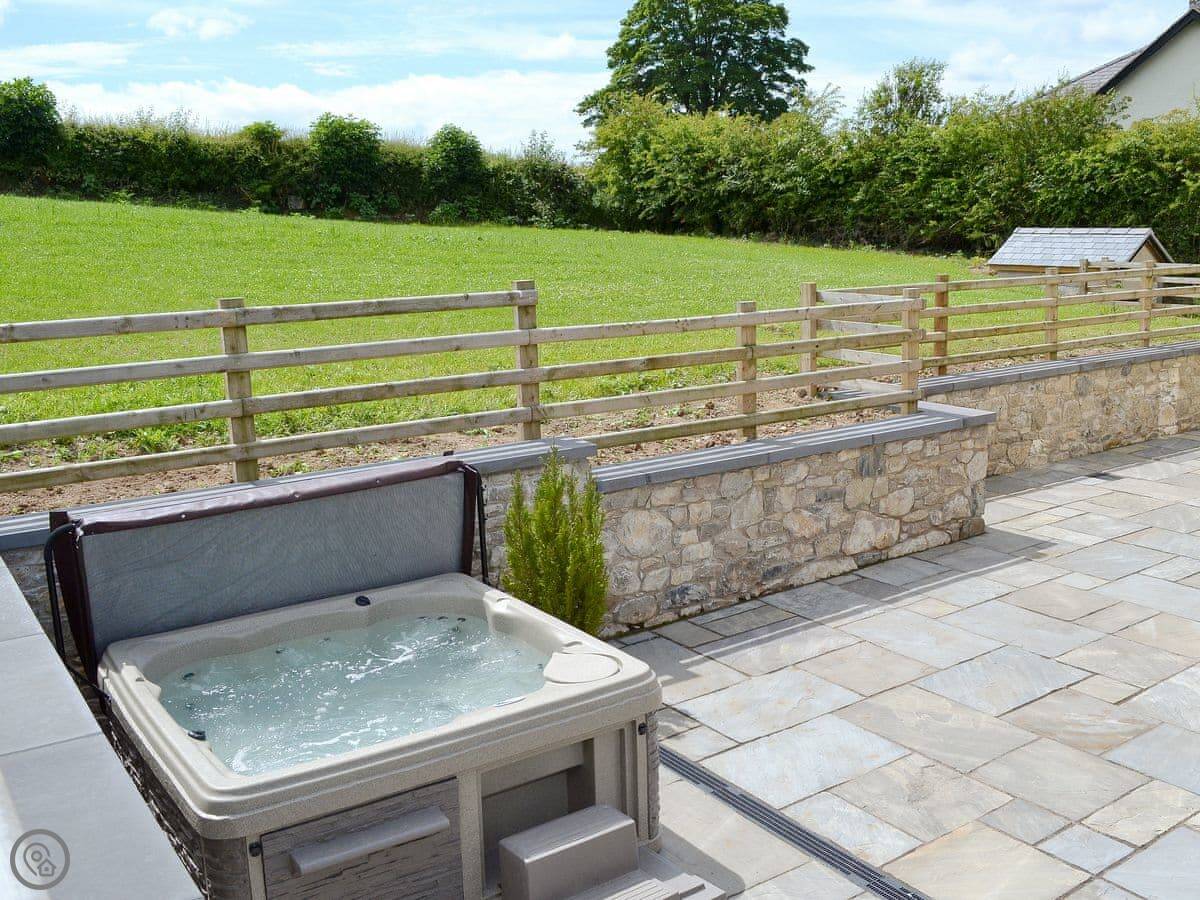 It's a modern build done up to look traditional. There are beams and a wood burner. The kitchen is new. There's a music system that plays through the house and outside, and a hot tub in the garden. All the bedrooms have smart TVs.