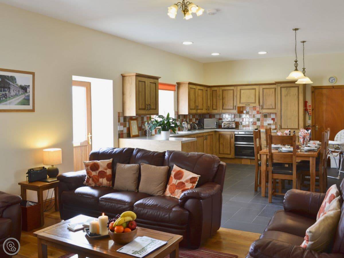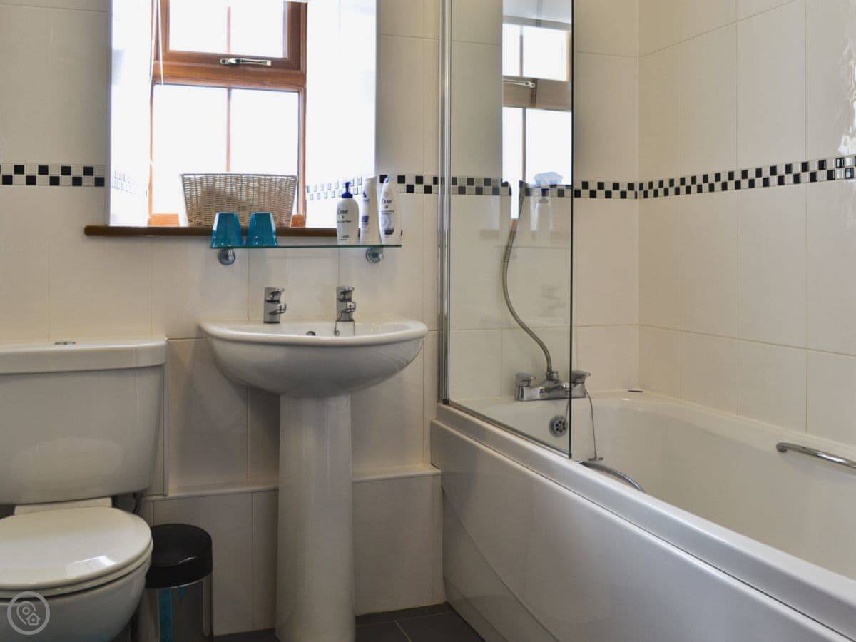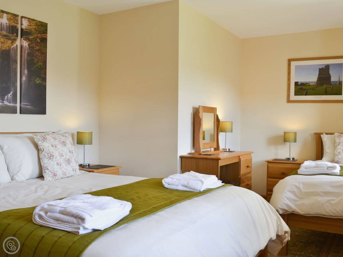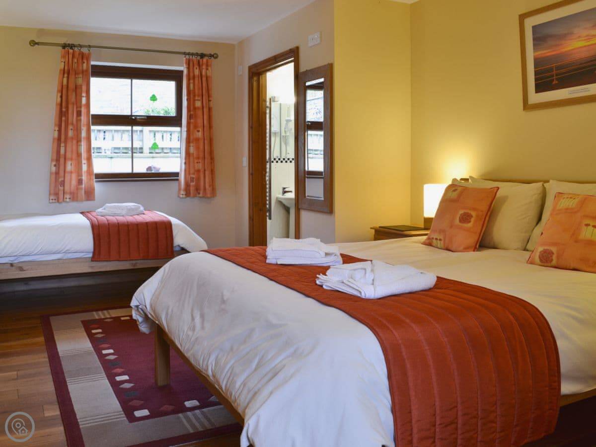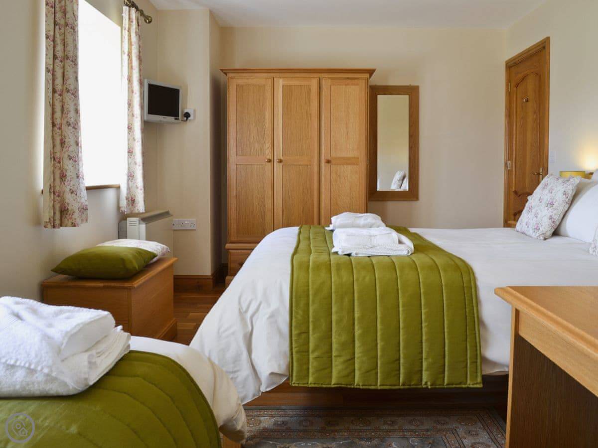 It sleeps six but only has two bedrooms. They're both quite big with an ensuite bathroom each, so it works. The place is 5 Star. That means it's well looked after and comfortable. It's a converted farm building. The other cottage, Helygen, is attached, but you wouldn't really know from inside. You have your own garden and it's enclosed.