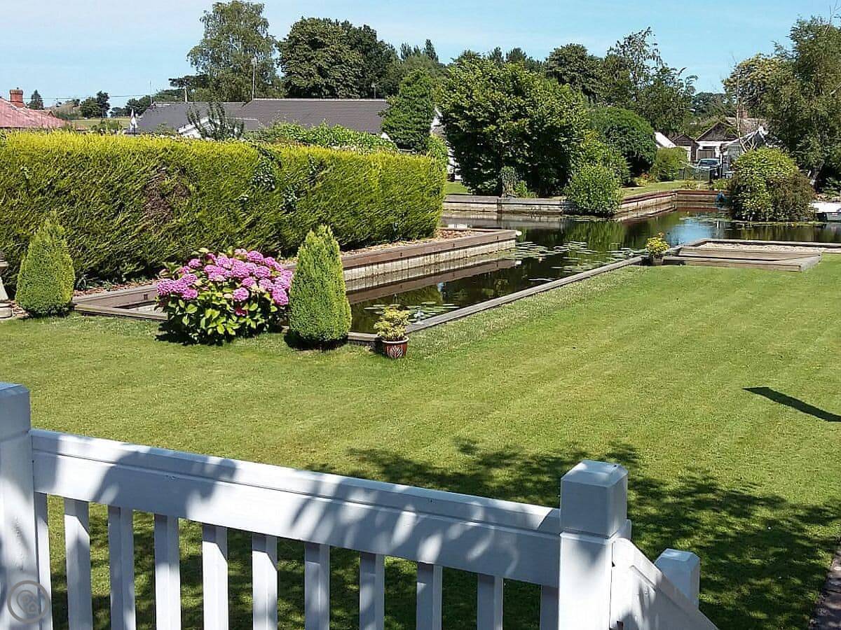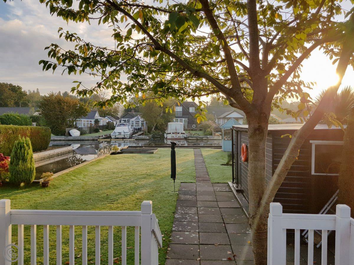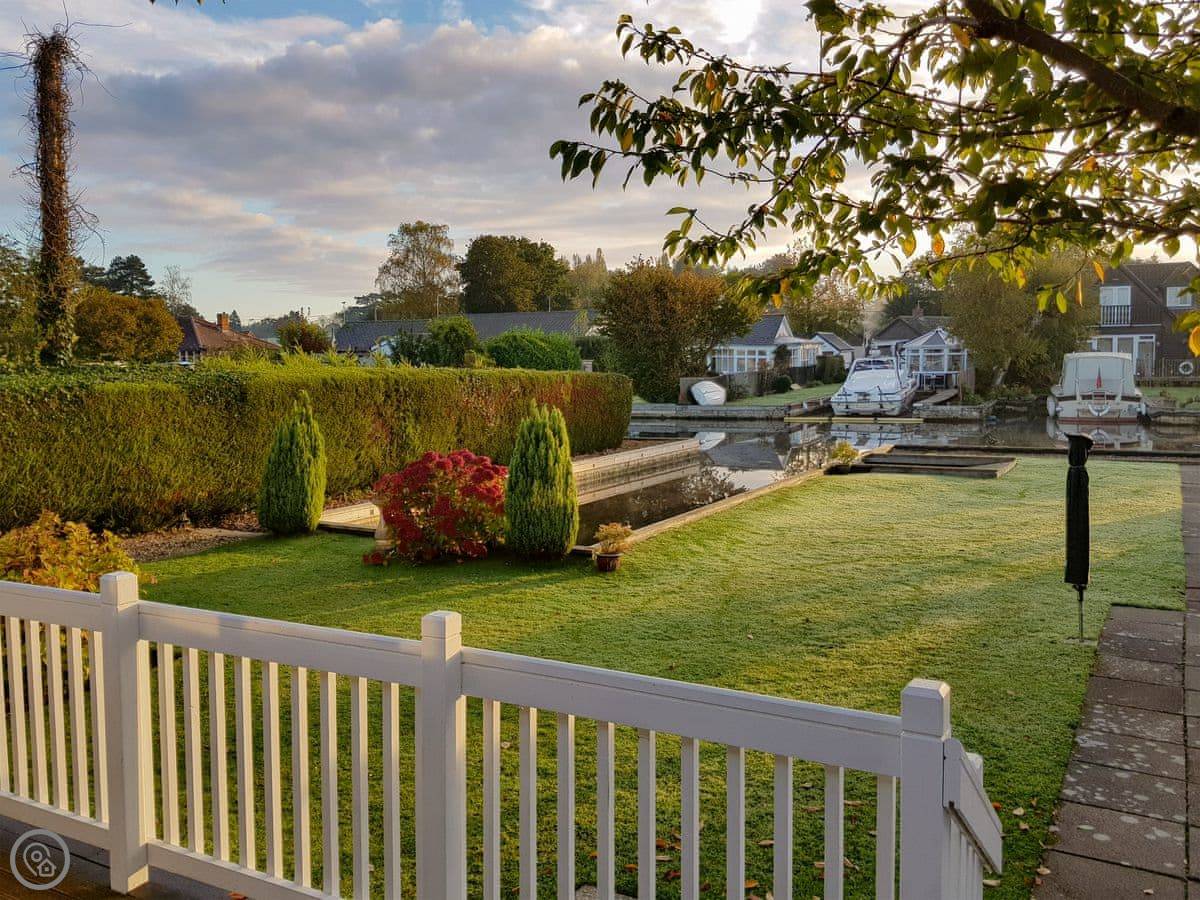 The Willows is in Hoveton. It's a detached cottage right on a private dyke off the River Bure. You get a verandah with chairs and a big lawned garden. The view is over the water.