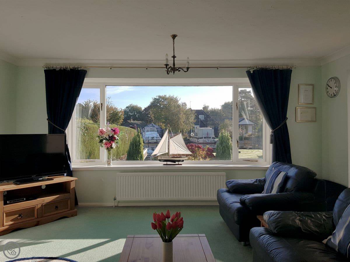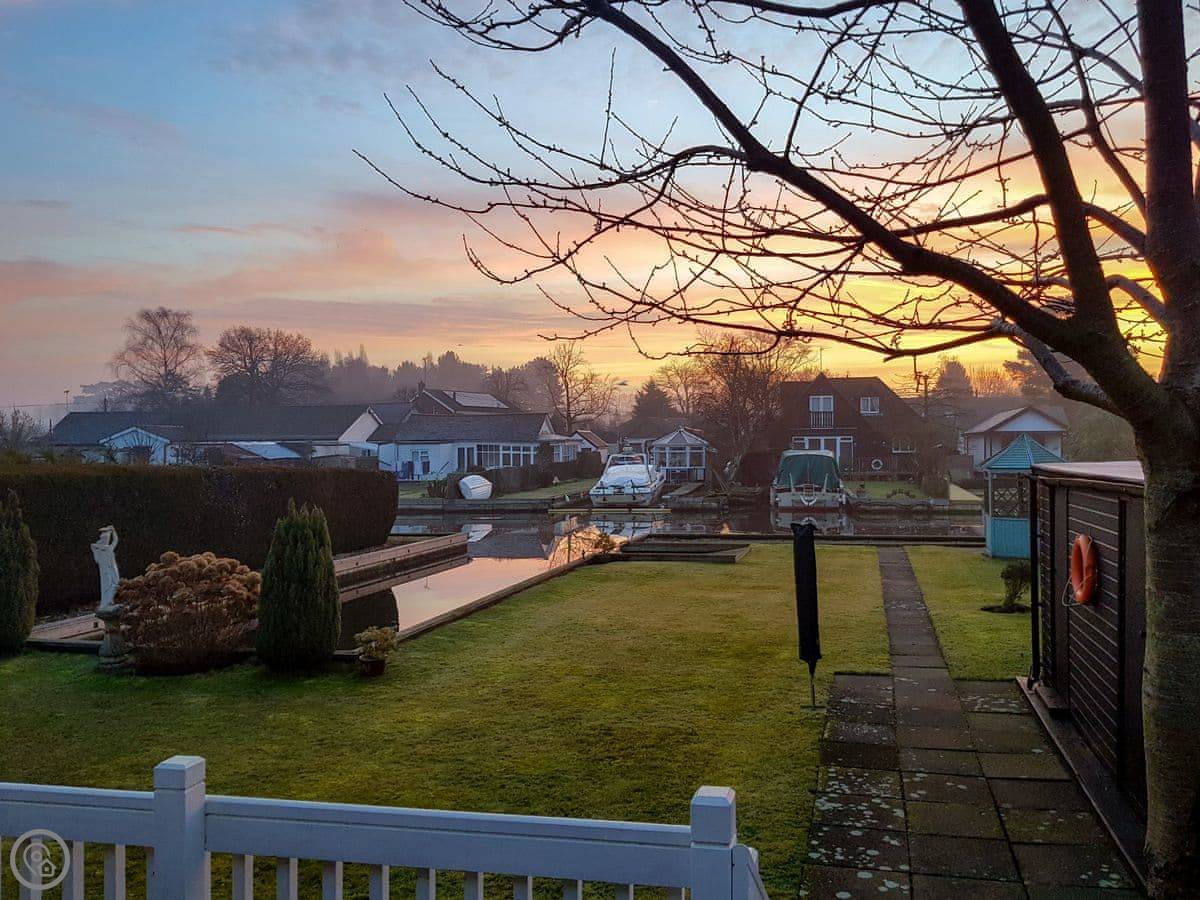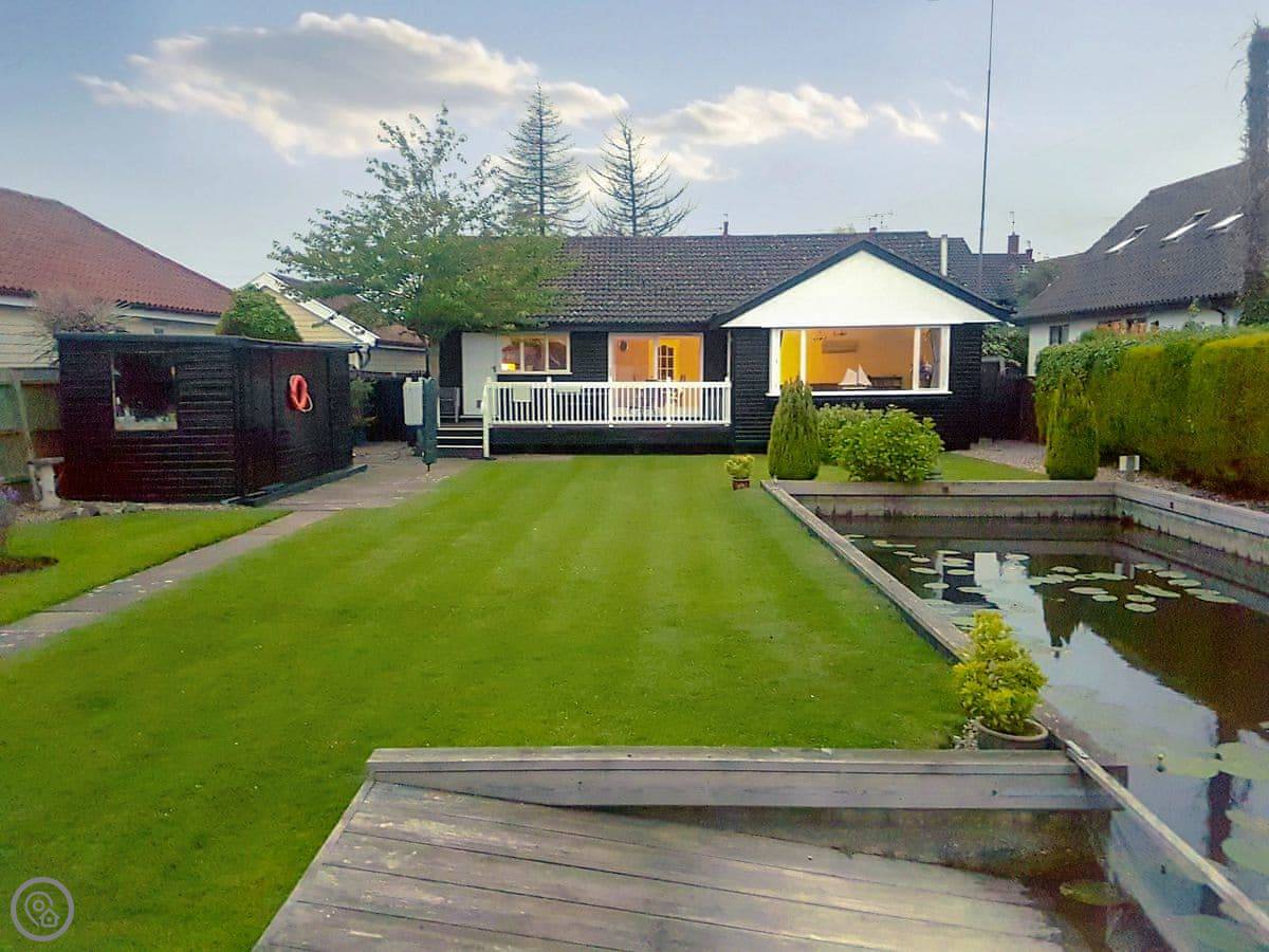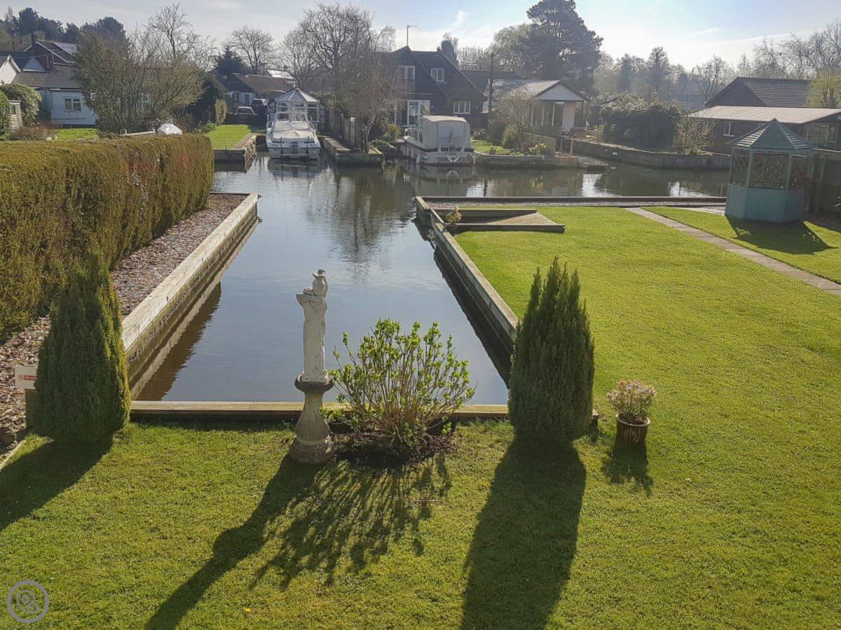 The Willows is in Hoveton. It's a detached cottage right on a private dyke off the River Bure. You get a verandah with chairs and a big lawned garden. The view is over the water.