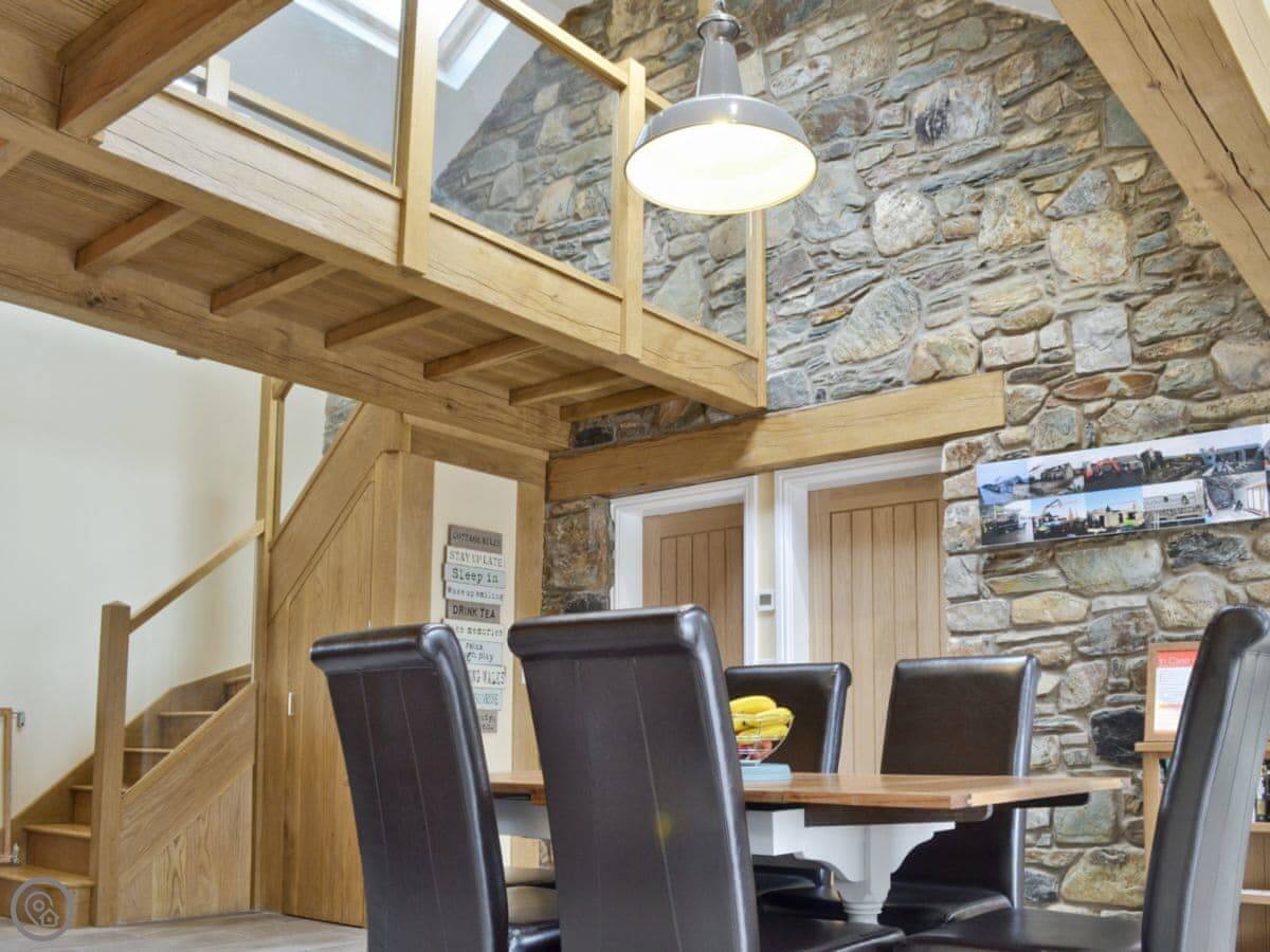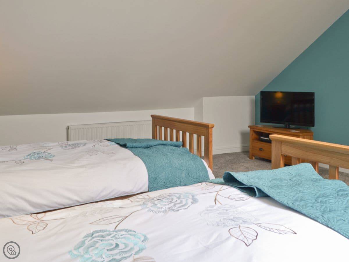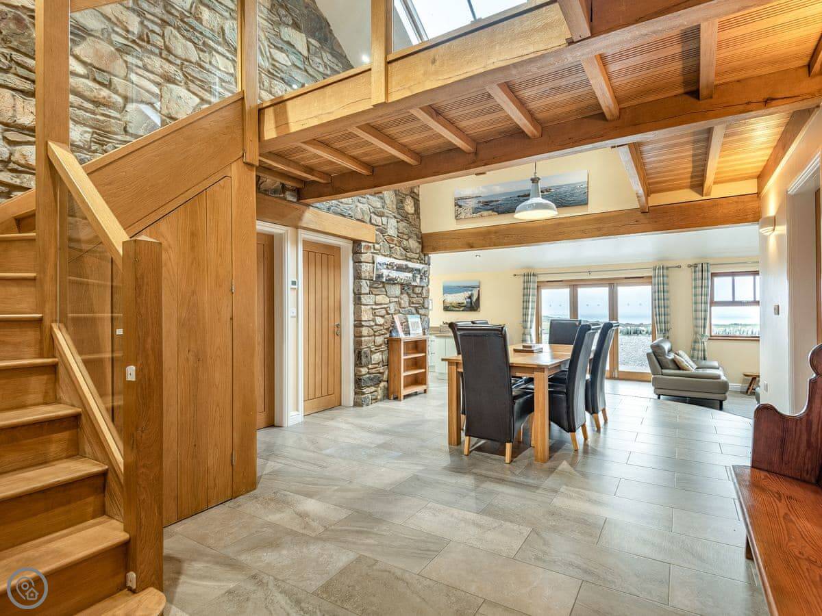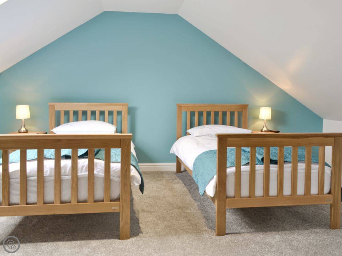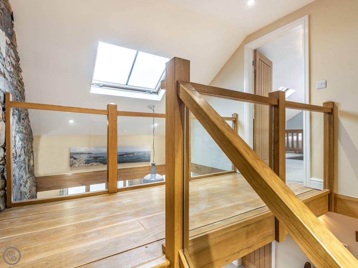 It sleeps six in three bedrooms. There are two bathrooms. It's a 5 Star place, which means it's comfortable and well-equipped. The stairs are open and a bit steep in parts. We've put a stairgate at the top.
