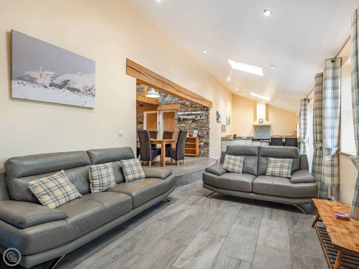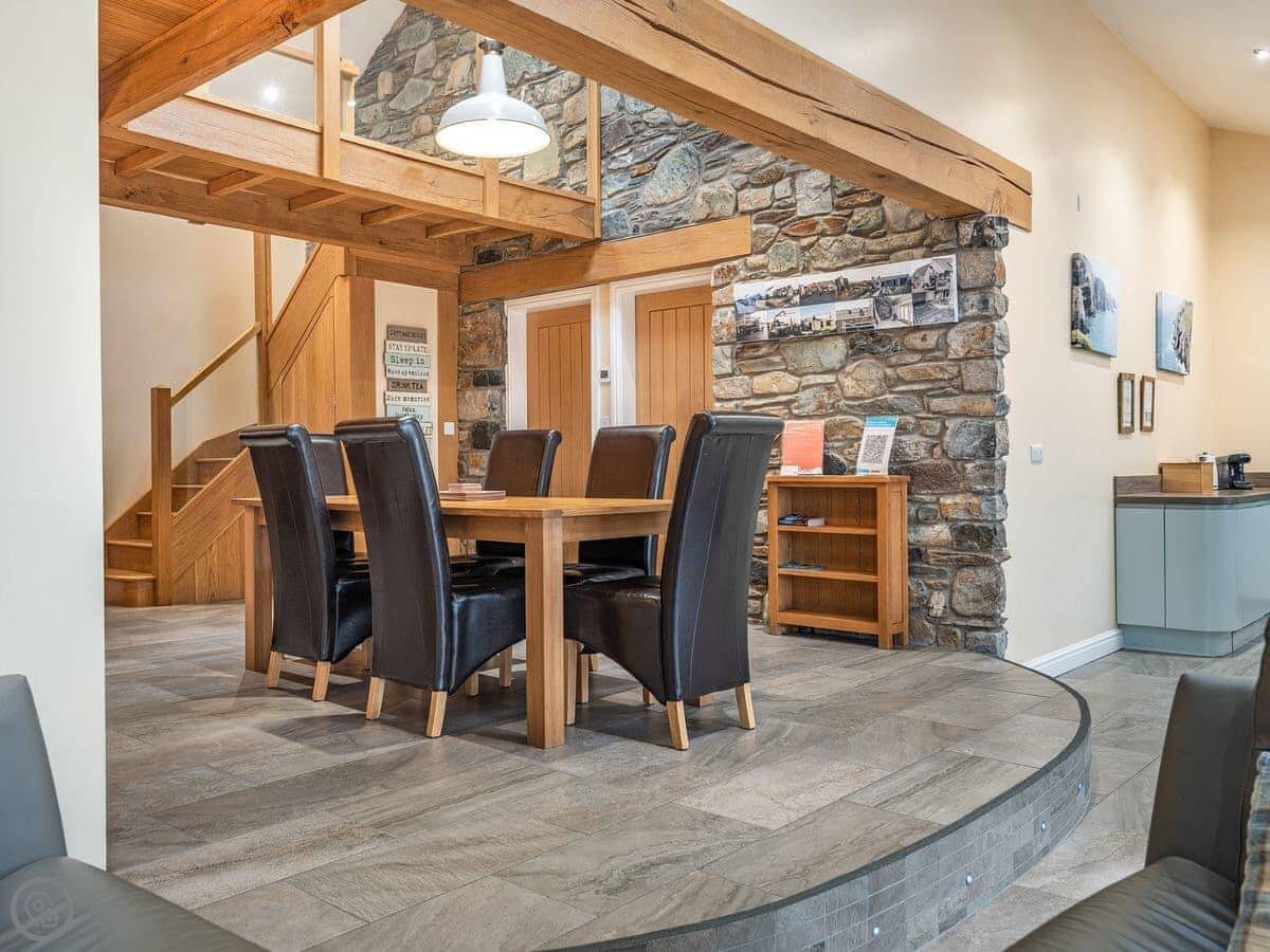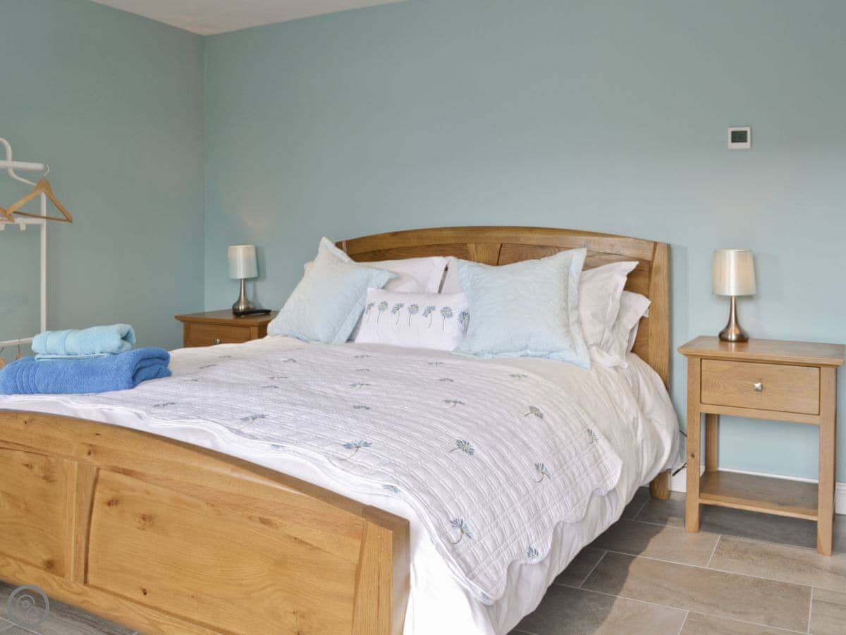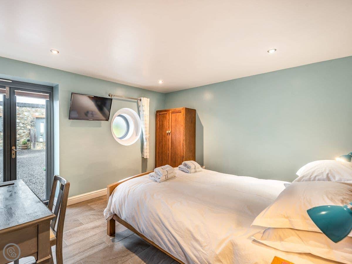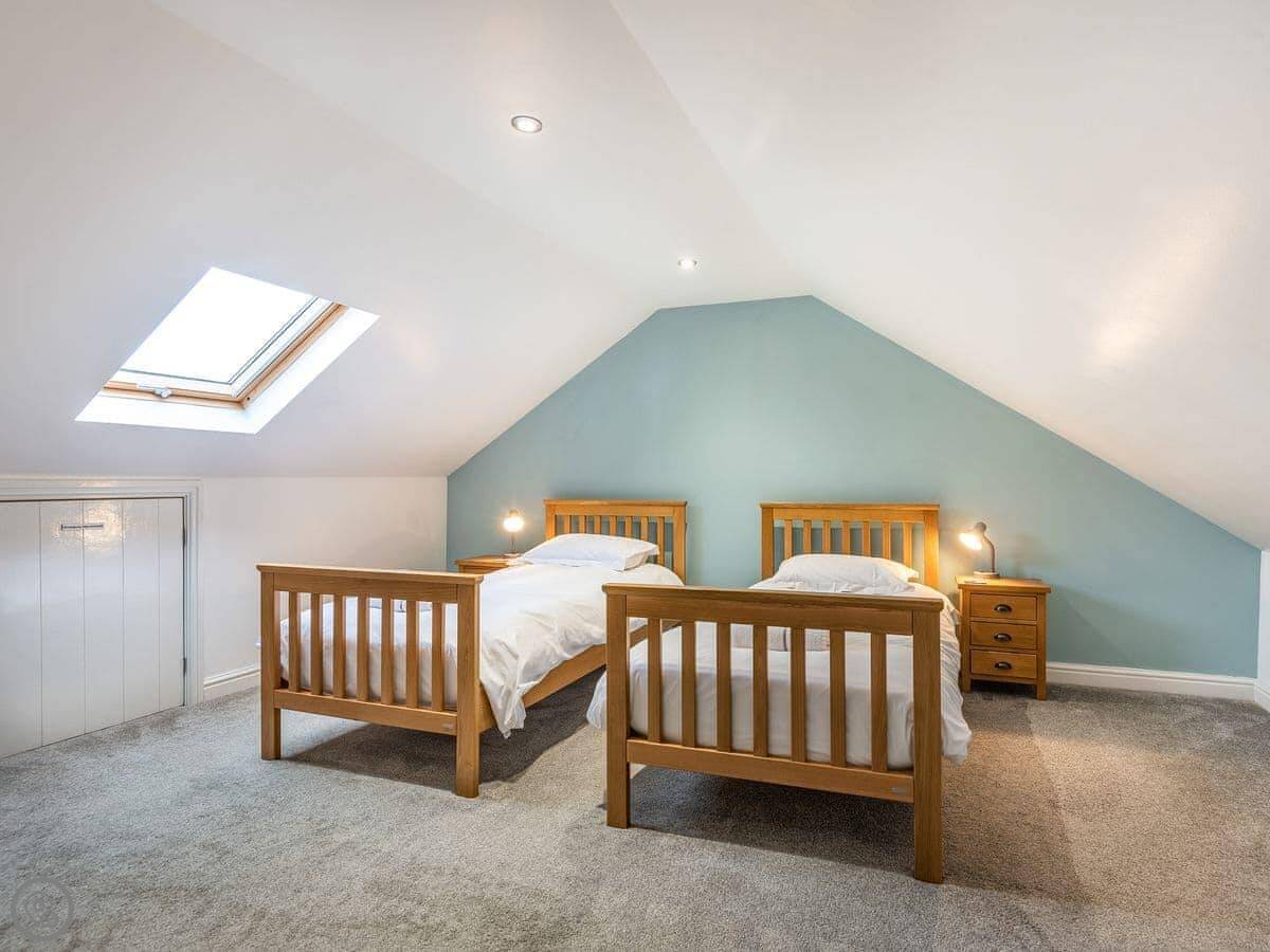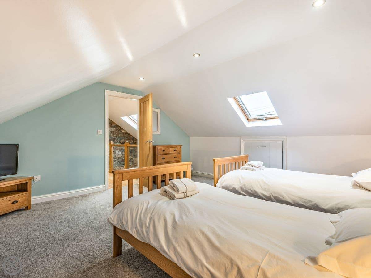 It sleeps six in three bedrooms. There are two bathrooms. It's a 5 Star place, which means it's comfortable and well-equipped. The stairs are open and a bit steep in parts. We've put a stairgate at the top.