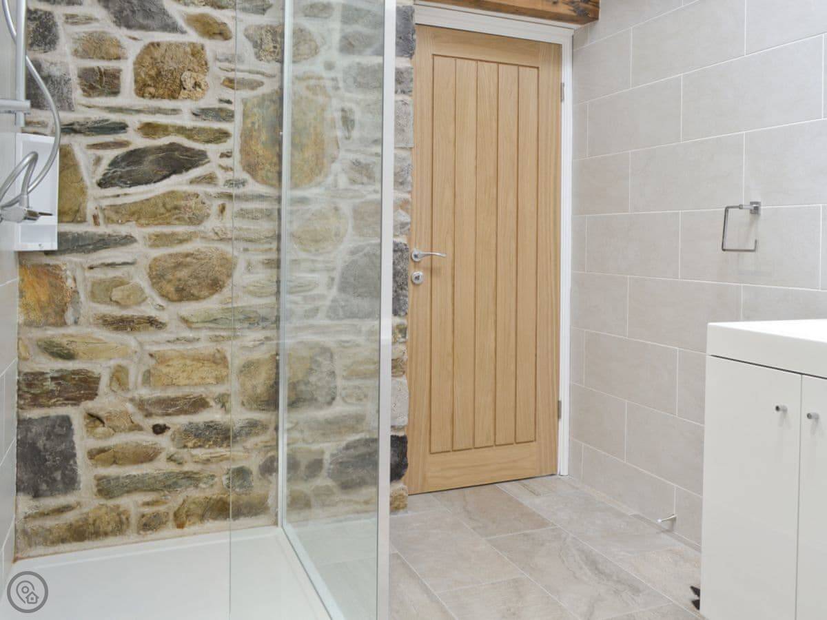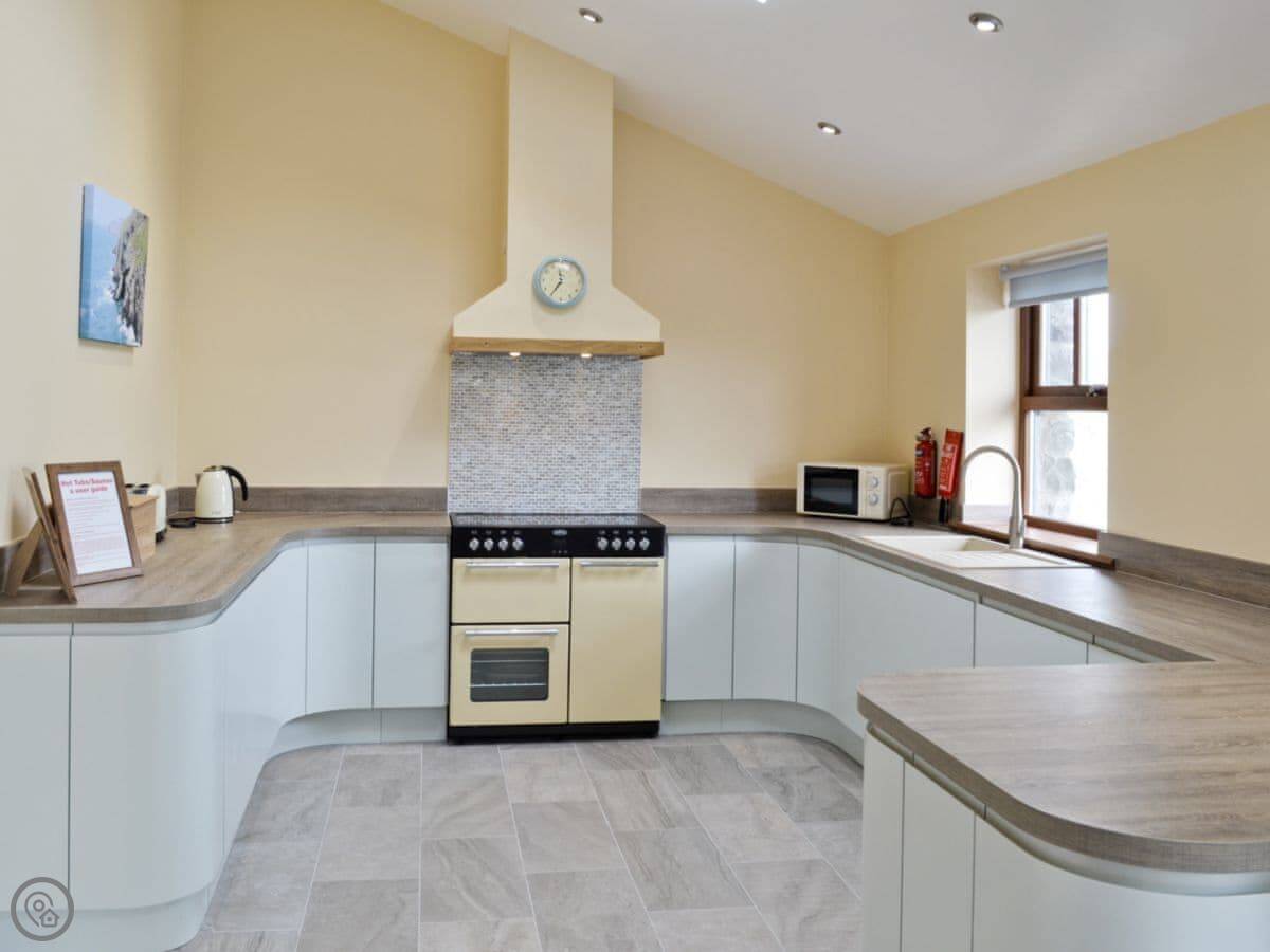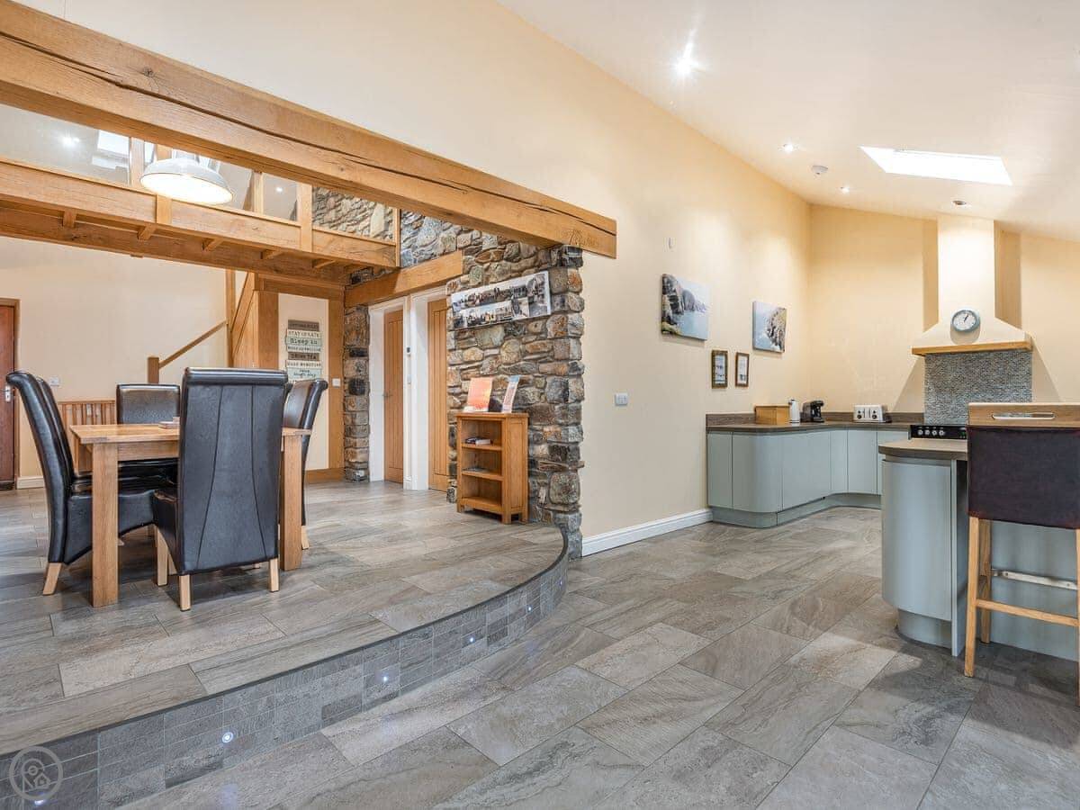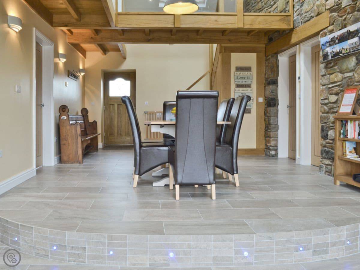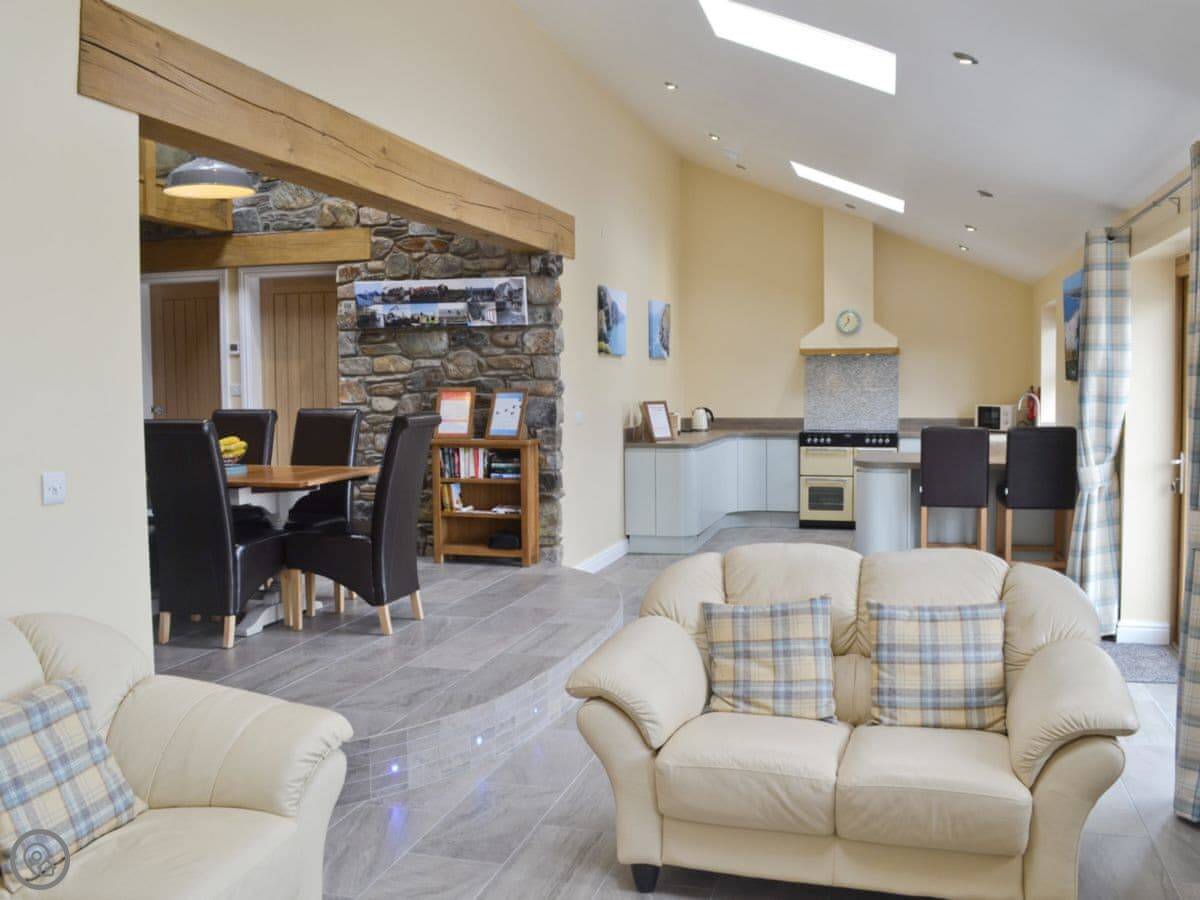 It sleeps six in three bedrooms. There are two bathrooms. It's a 5 Star place, which means it's comfortable and well-equipped. The stairs are open and a bit steep in parts. We've put a stairgate at the top.