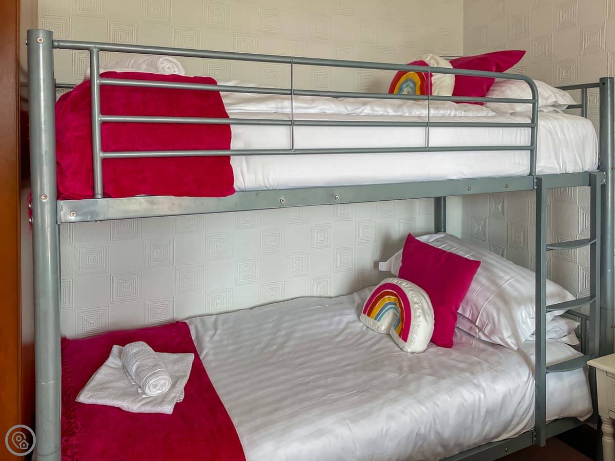 There’s a big main living room and a kitchen with a range cooker, but the other living space is downstairs in the games room. That’s got a full-size snooker table, a darts board and a football table. The garden is enclosed and there are a couple of patio areas with furniture.