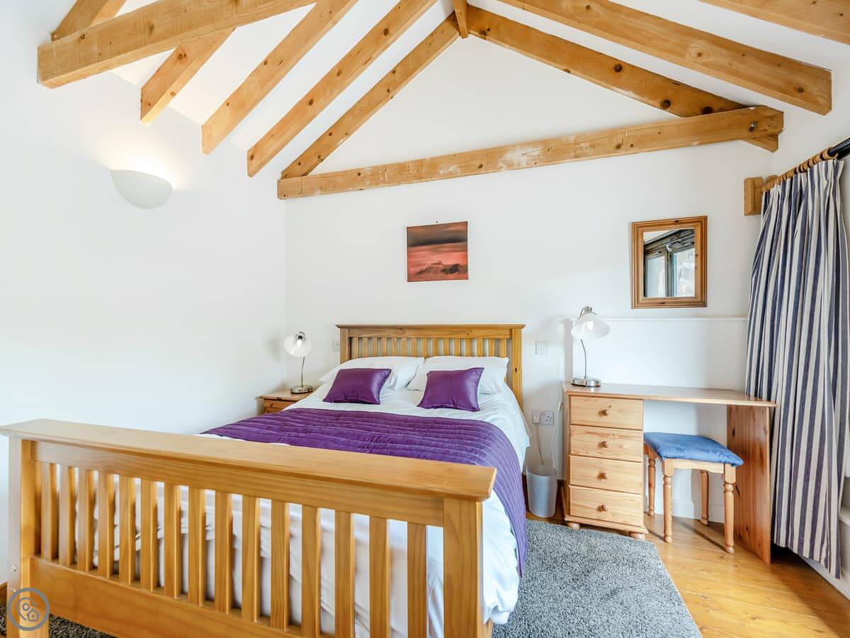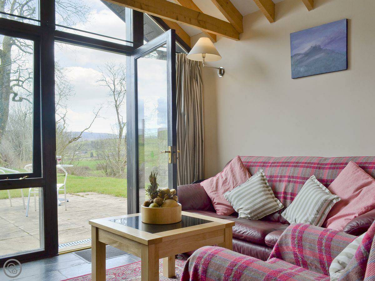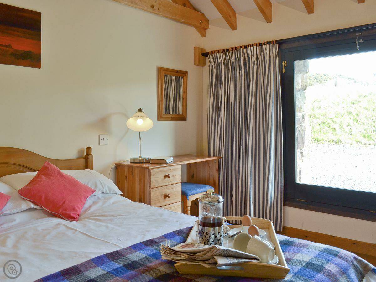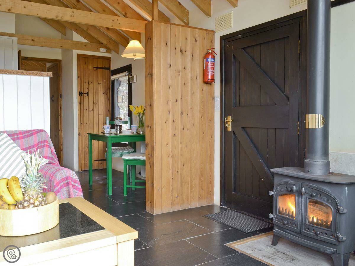 It's for two people. One bedroom, one bathroom. It's got a 4 Star rating. The main room is open plan with a wood burner and big glass doors out to the terrace. The ceiling goes right up to the roof. It has underfloor heating.