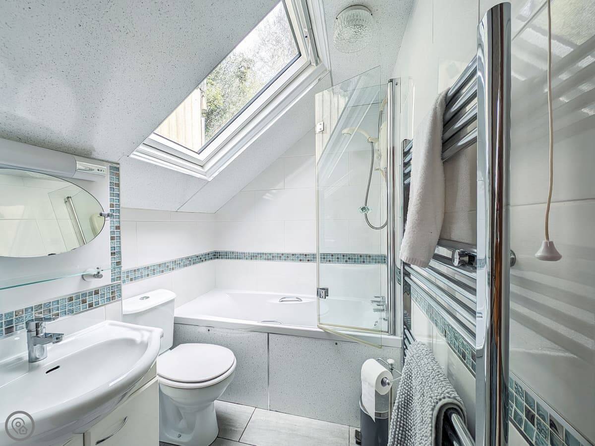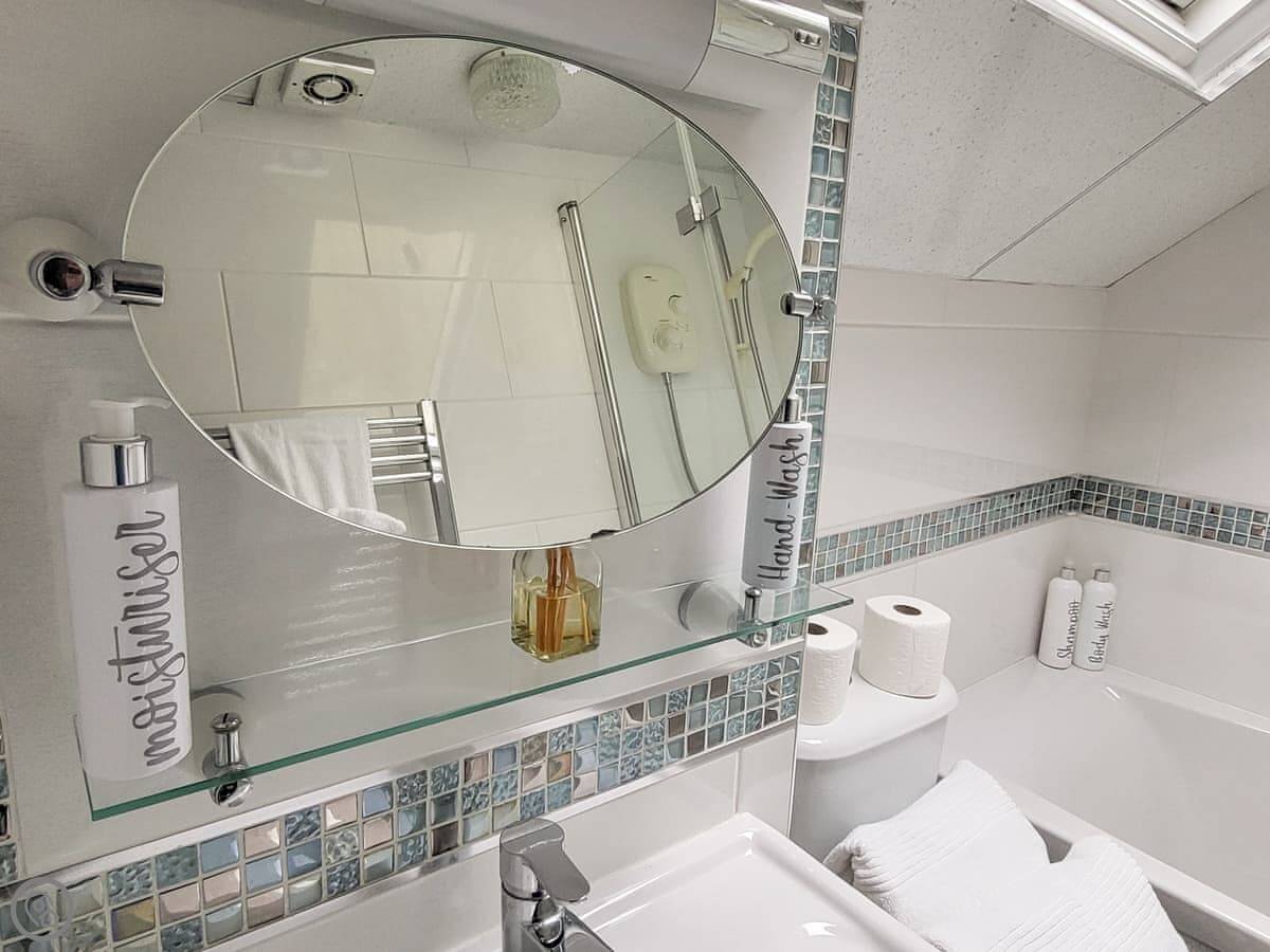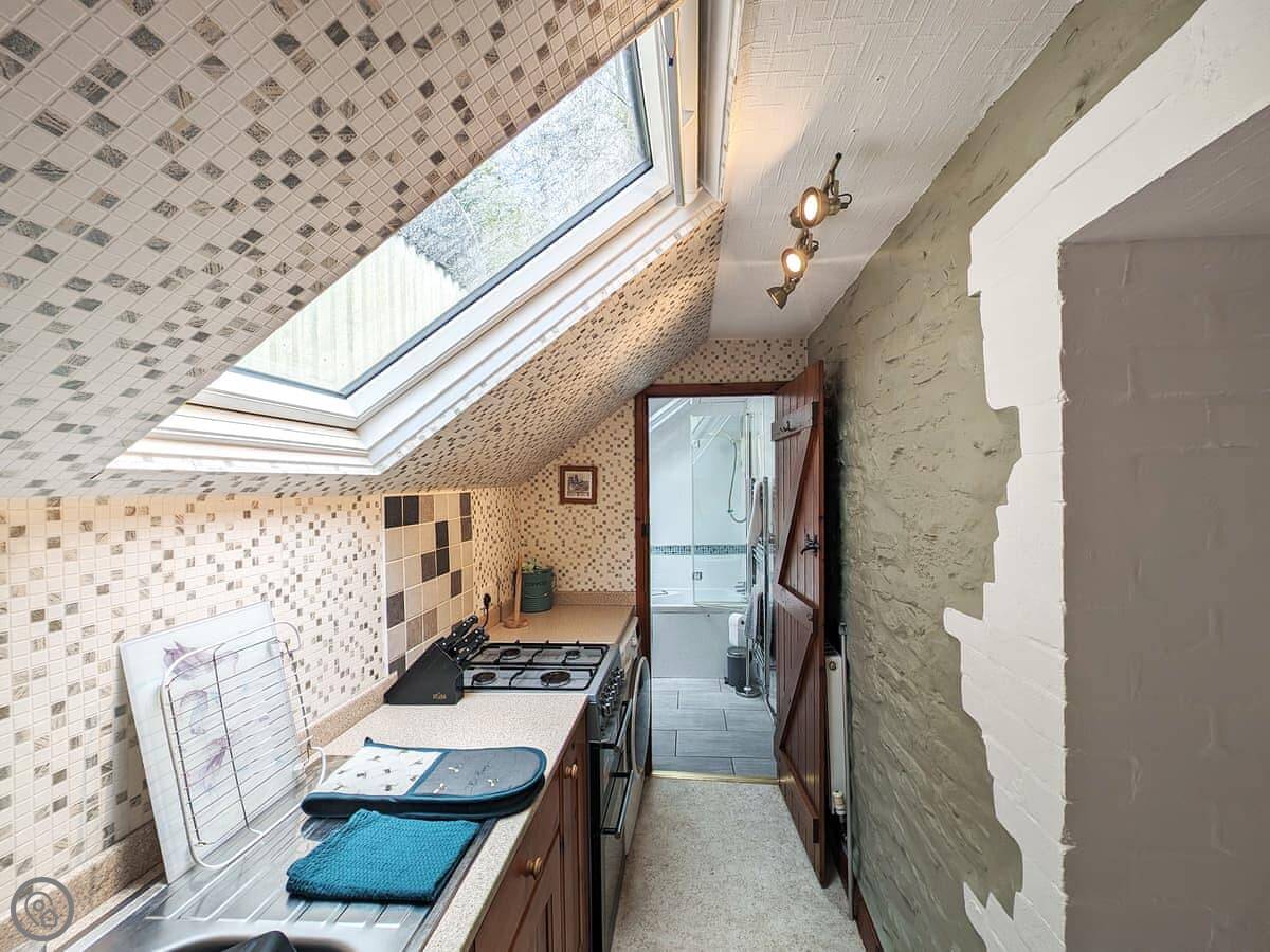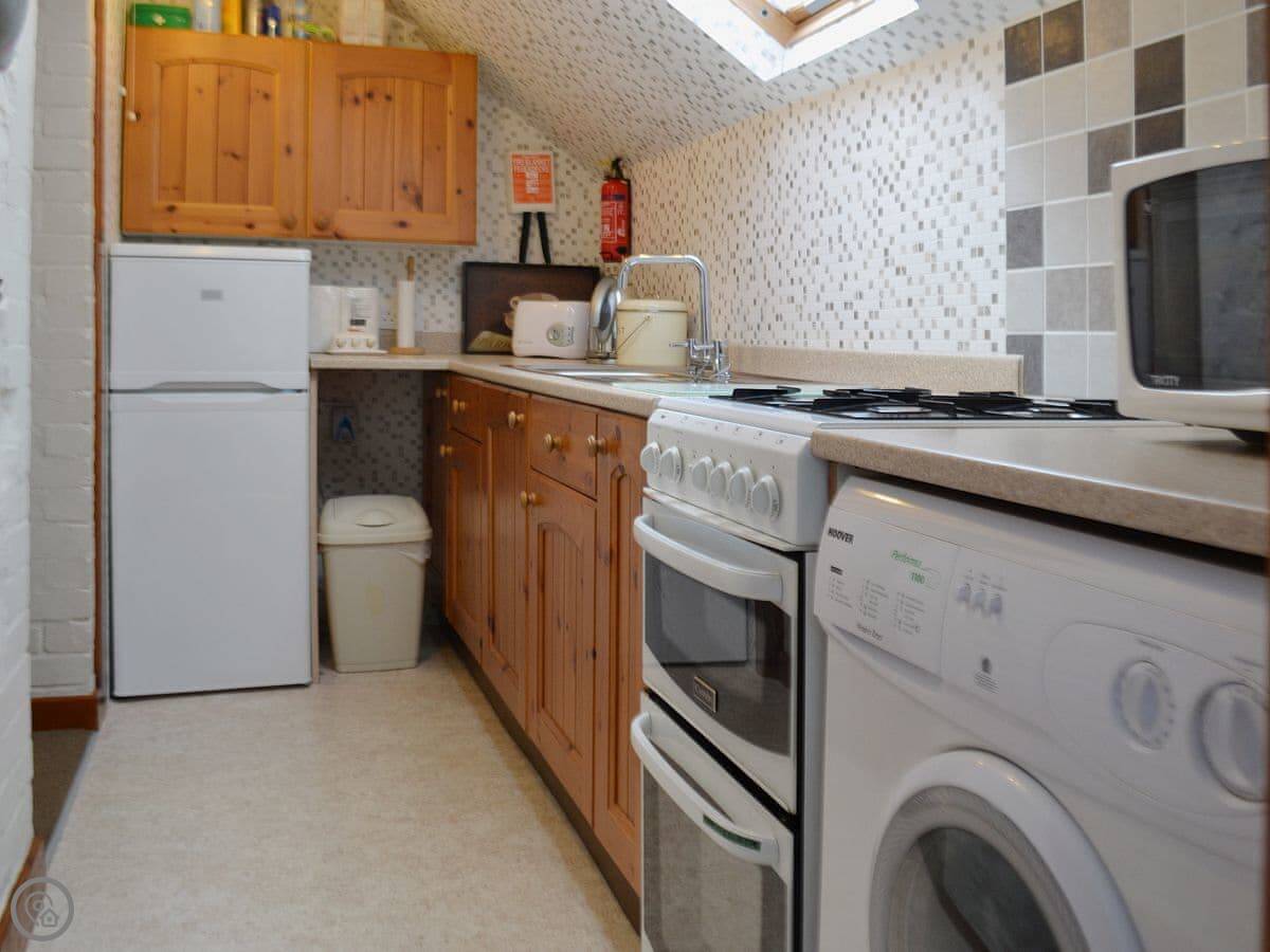 Inside, there's a washing machine, a TV with satellite, and WiFi. Bedding and towels are included. We've got a cot and a highchair if you need them, and a stairgate at the top.