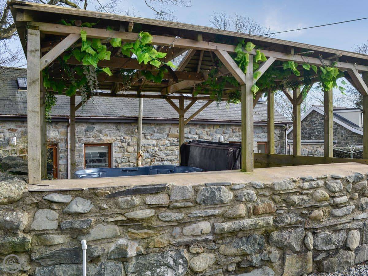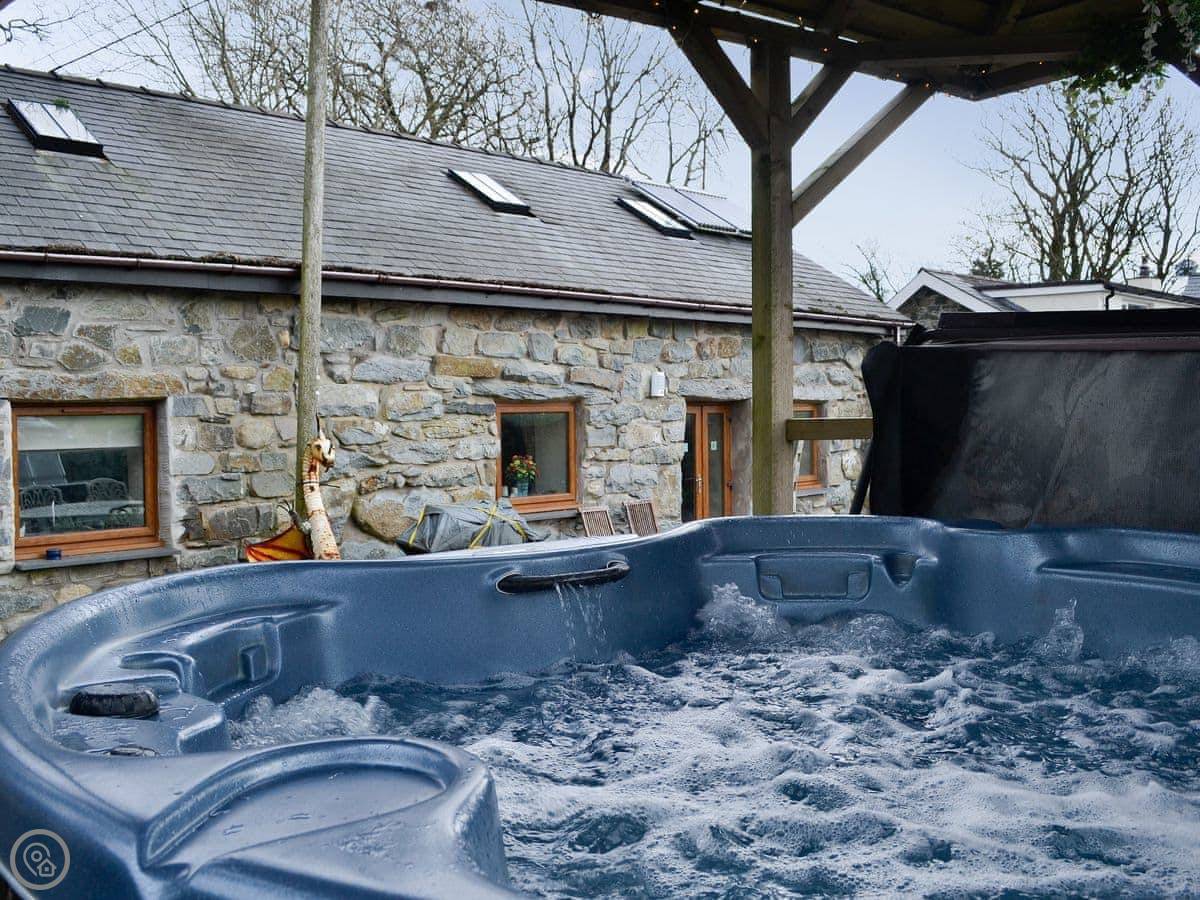 You get your own enclosed patio garden with a hot tub. The garden has a BBQ as well. It's a rural spot, so the views are over fields towards the mountains.
