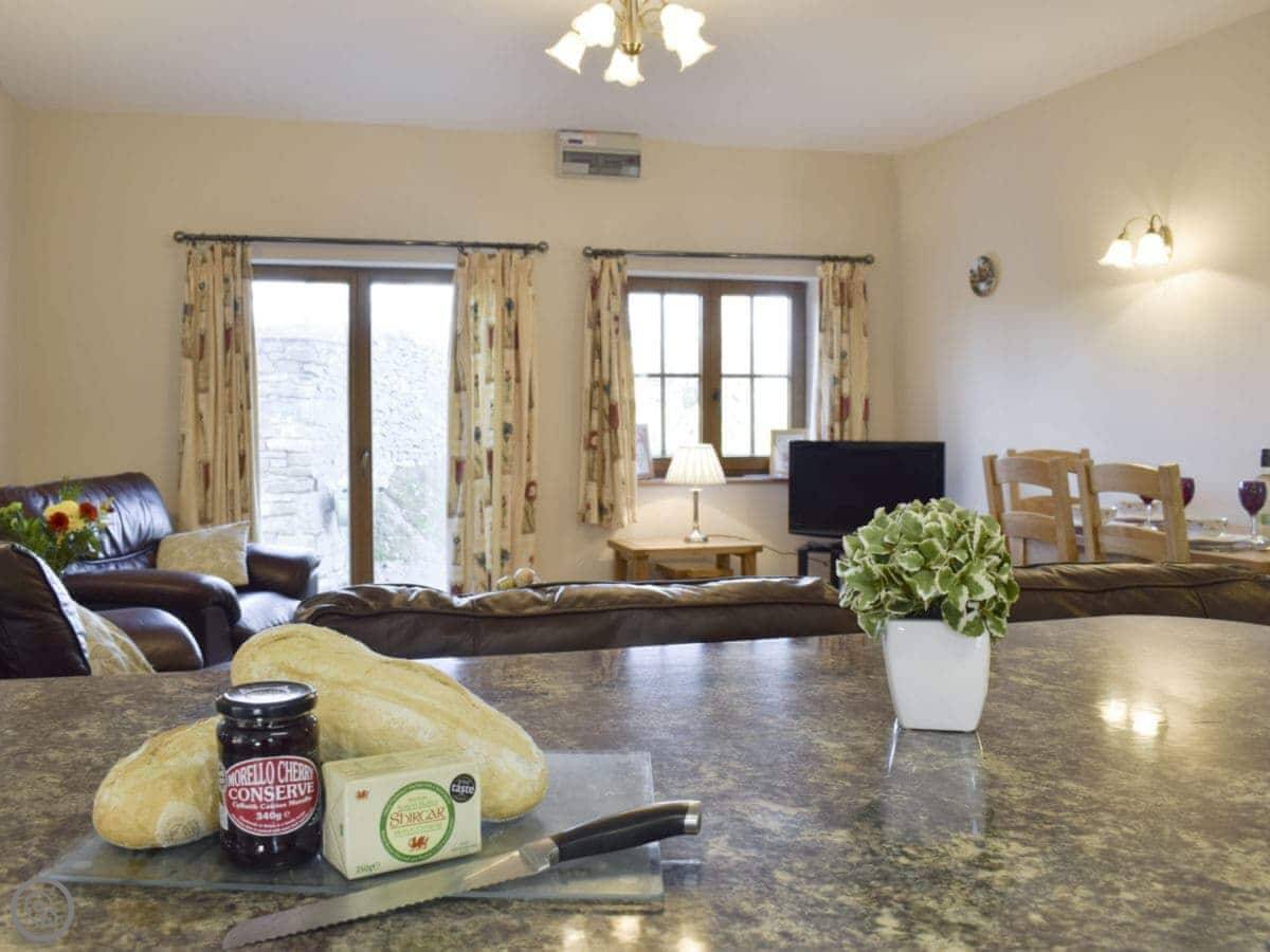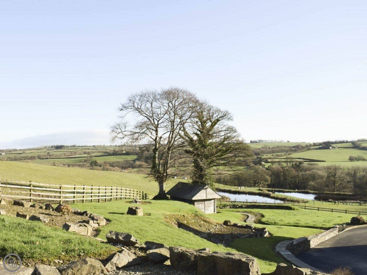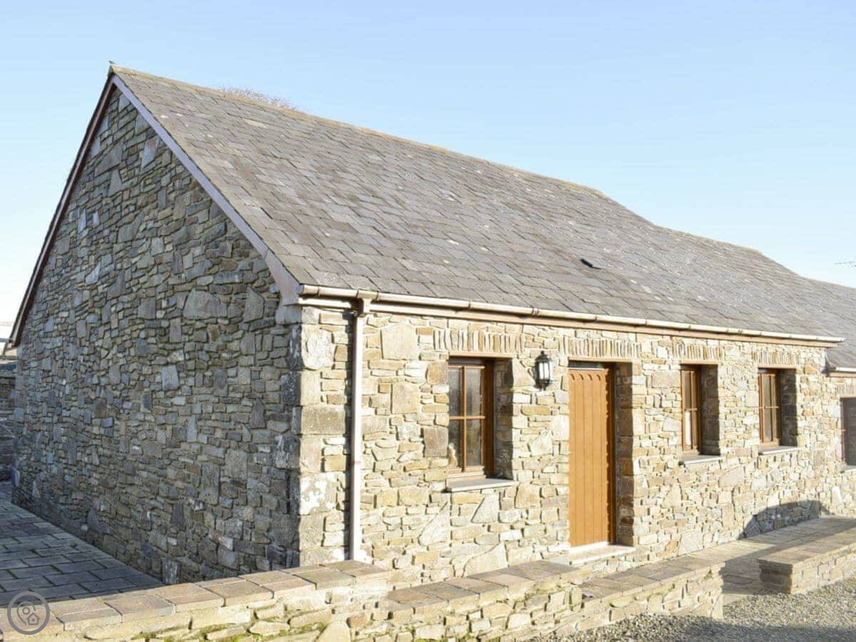 Tan-Y-Dderwen is out near Mydroilyn in Ceredigion. It's a converted barn, so it's long and low. The setting is quiet, just fields and hills.
