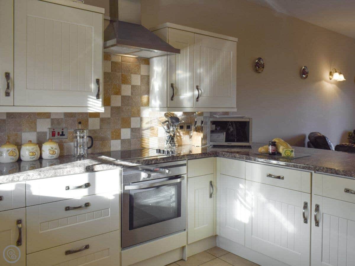 You can bring one dog. There's parking right outside. It has a washing machine, a dishwasher, and a TV. Bedding and towels are included. We provide a cot if you need it. There's a BBQ and a kids' play area on site.