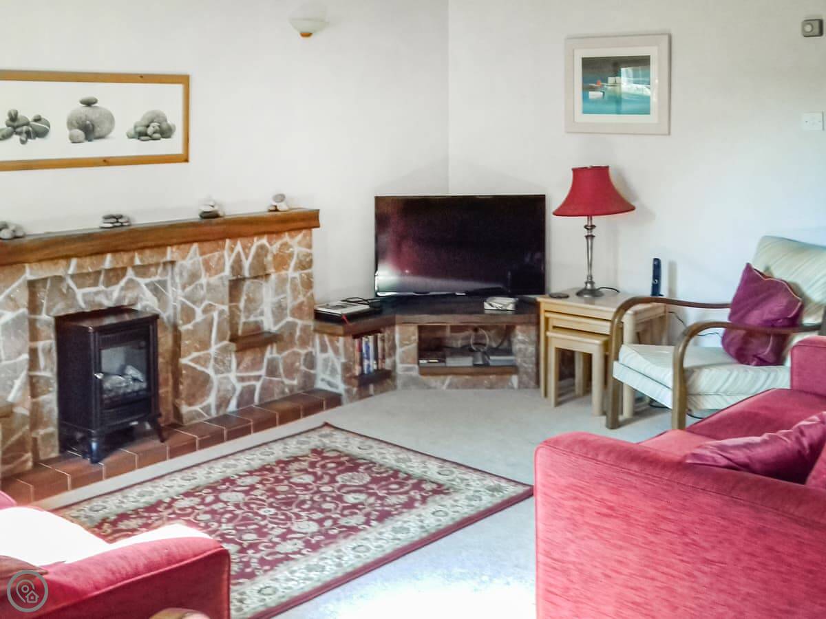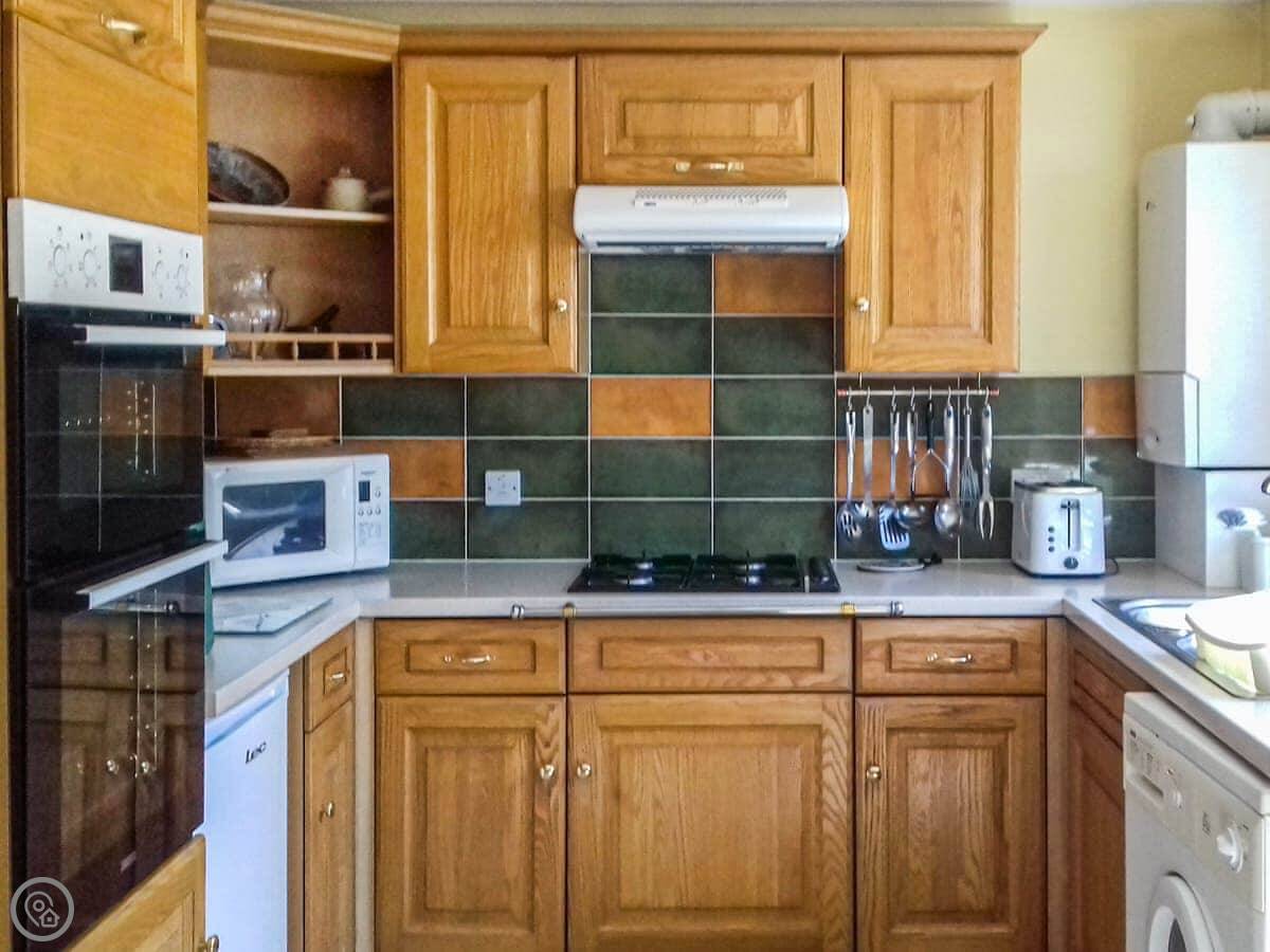 Inside, it's got what you'd need. Washing machine, TV, wifi. Bedding and towels are included. There's a cot and a highchair if you need them, and a stairgate at the top of the stairs. The stairs are a bit steep, it's an old cottage.
