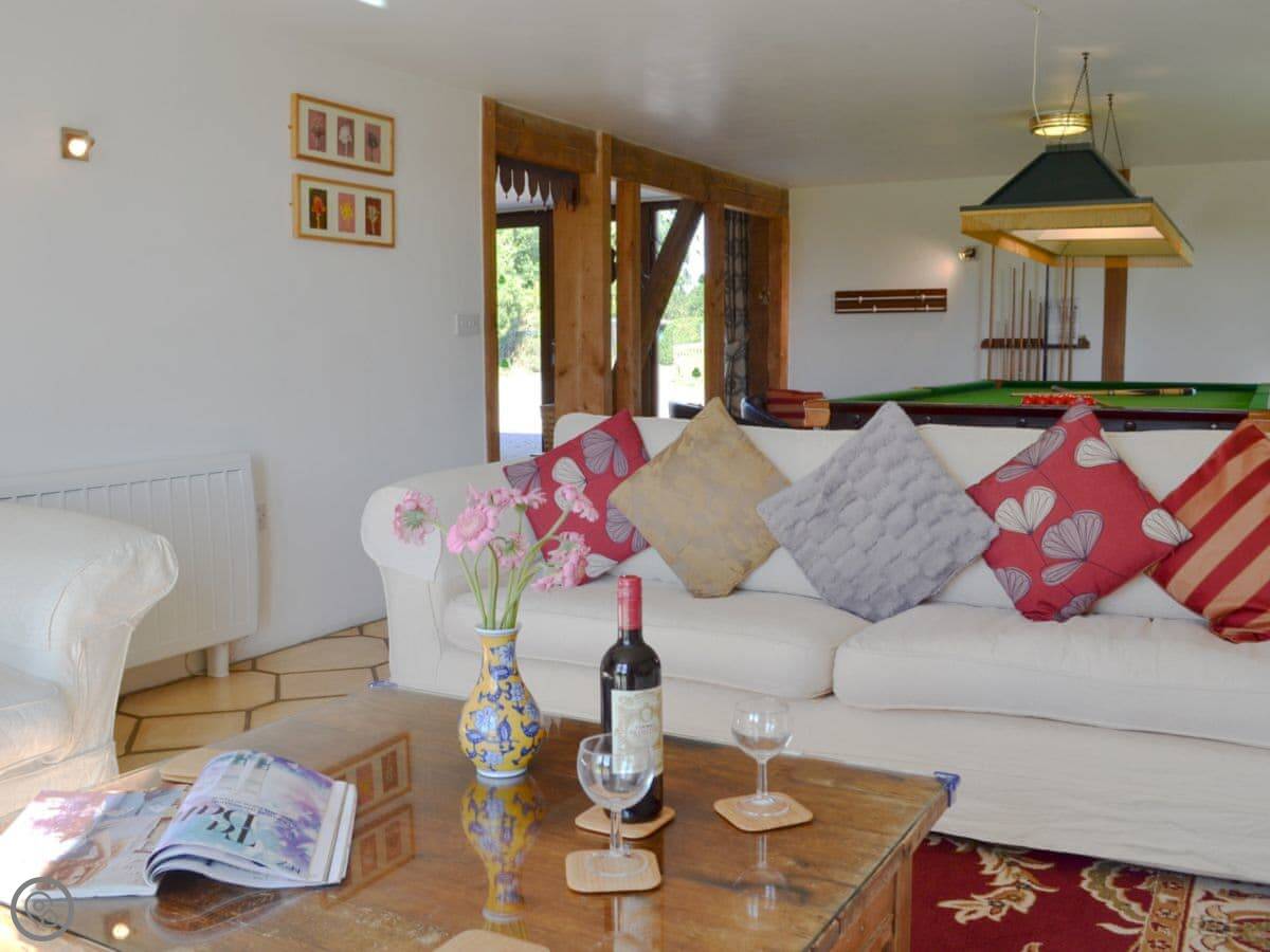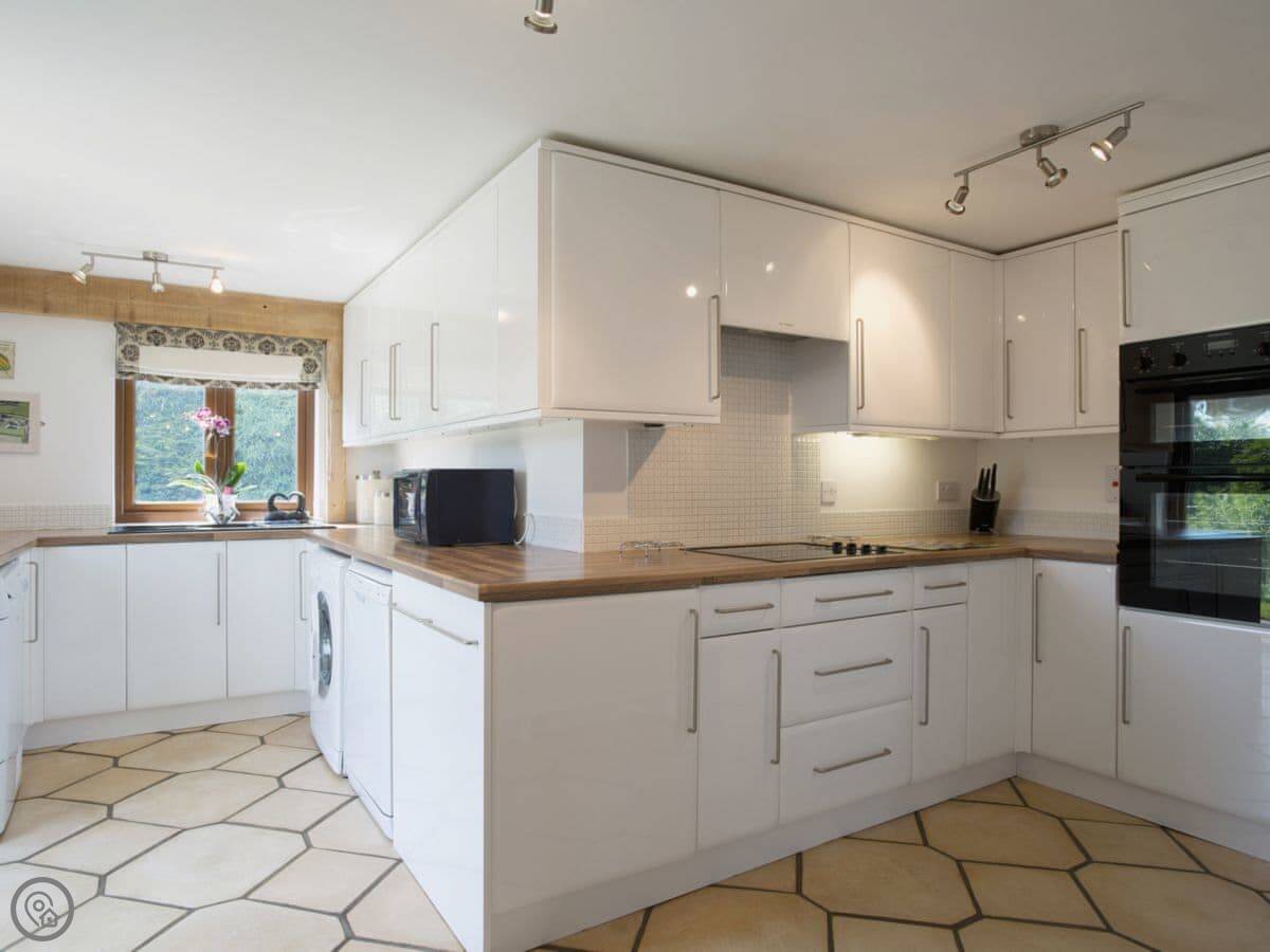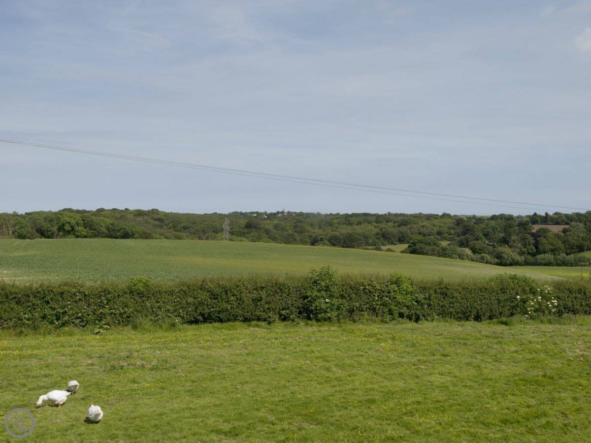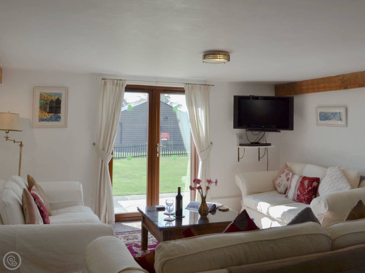 The main living space is open plan. The kitchen is modern, white, and has a dishwasher and washing machine. The sofas look out through French doors to the garden. The garden is private and faces fields. You'll often see chickens and geese from the farm next door wandering past.