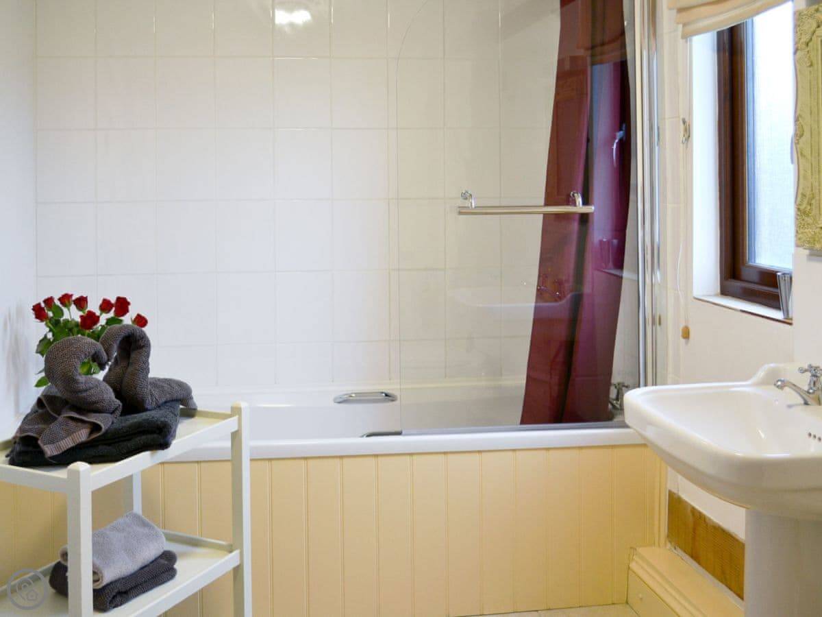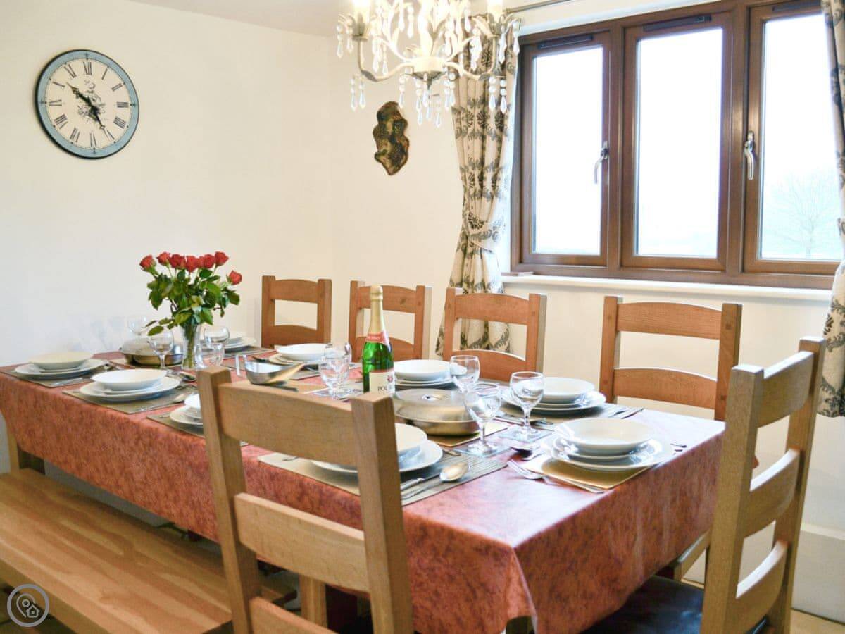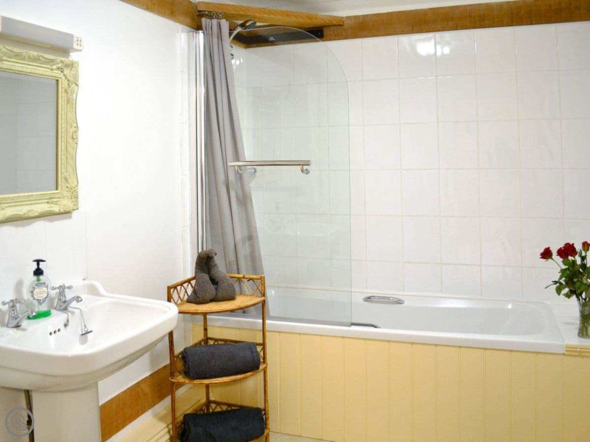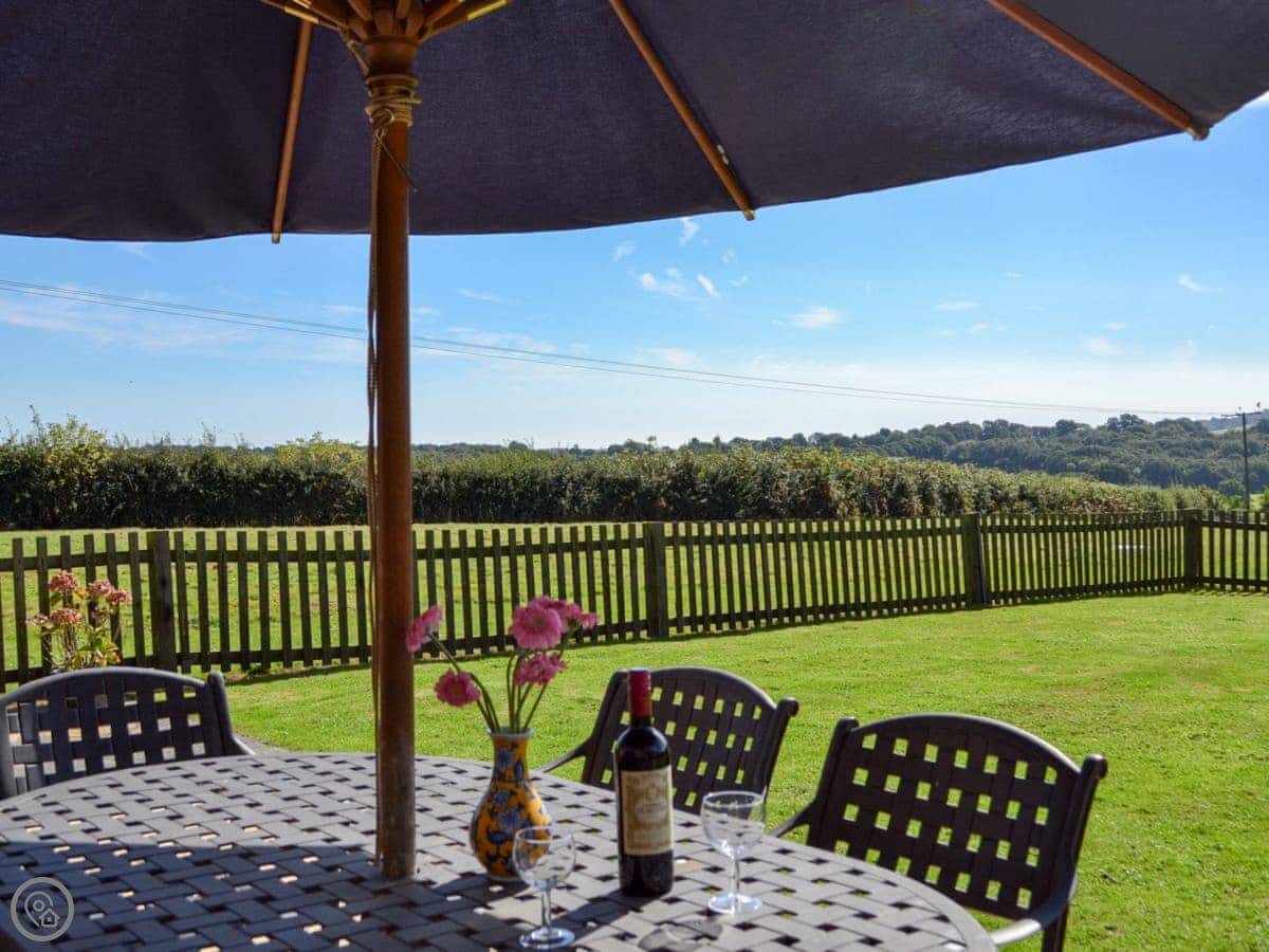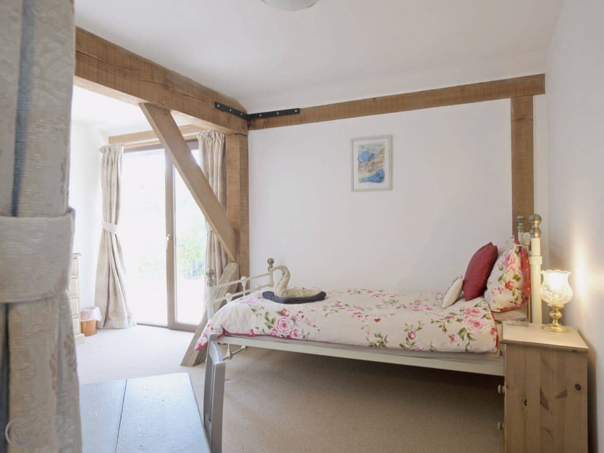 The main living space is open plan. The kitchen is modern, white, and has a dishwasher and washing machine. The sofas look out through French doors to the garden. The garden is private and faces fields. You'll often see chickens and geese from the farm next door wandering past.