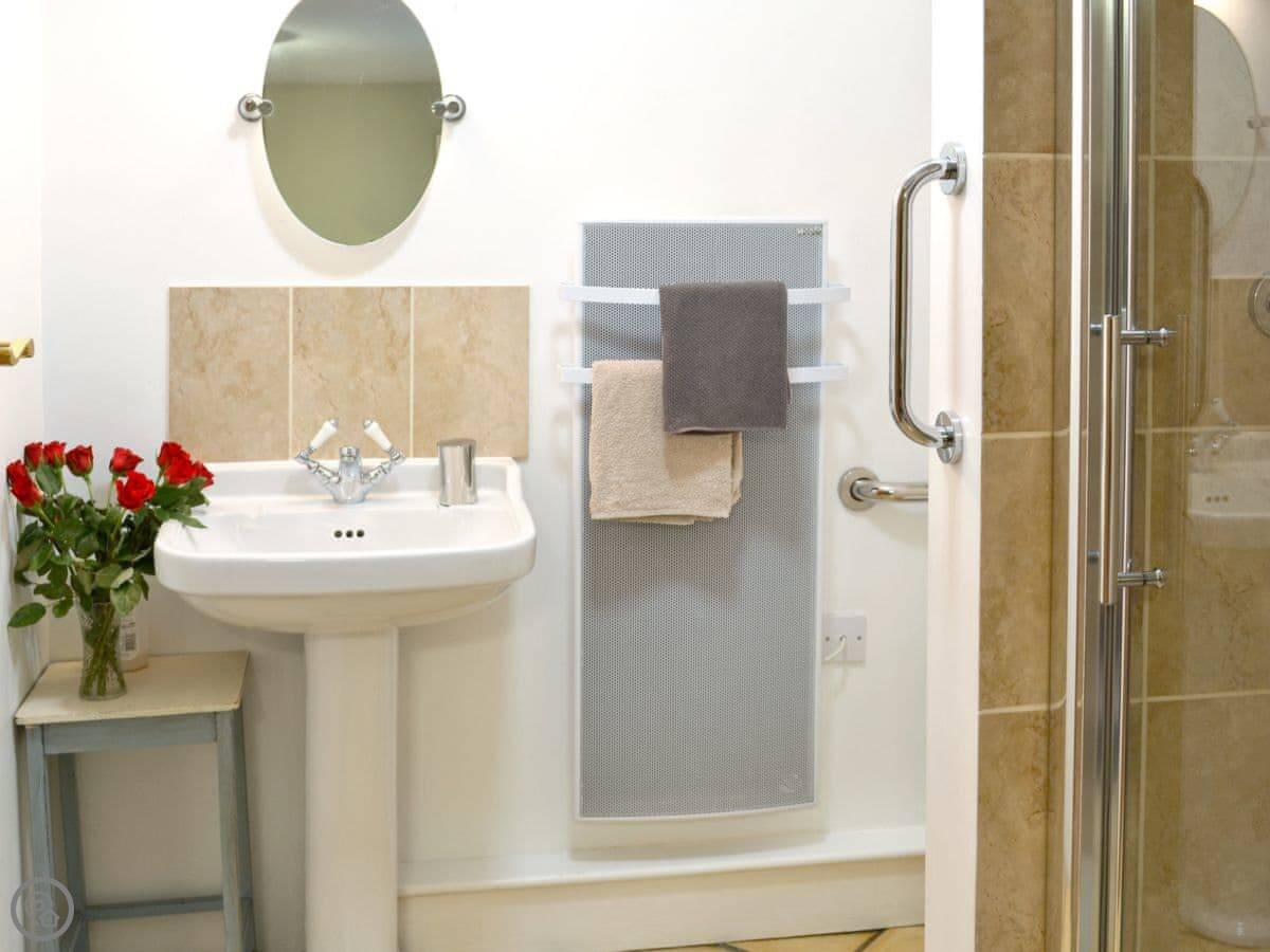 It sleeps nine people. There are three bedrooms and each one has its own bathroom. It's all on one level, so it's good for wheelchairs. There are grab rails in the wet rooms and the entrance has no steps.