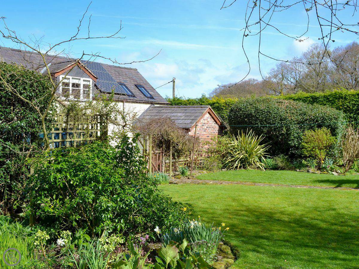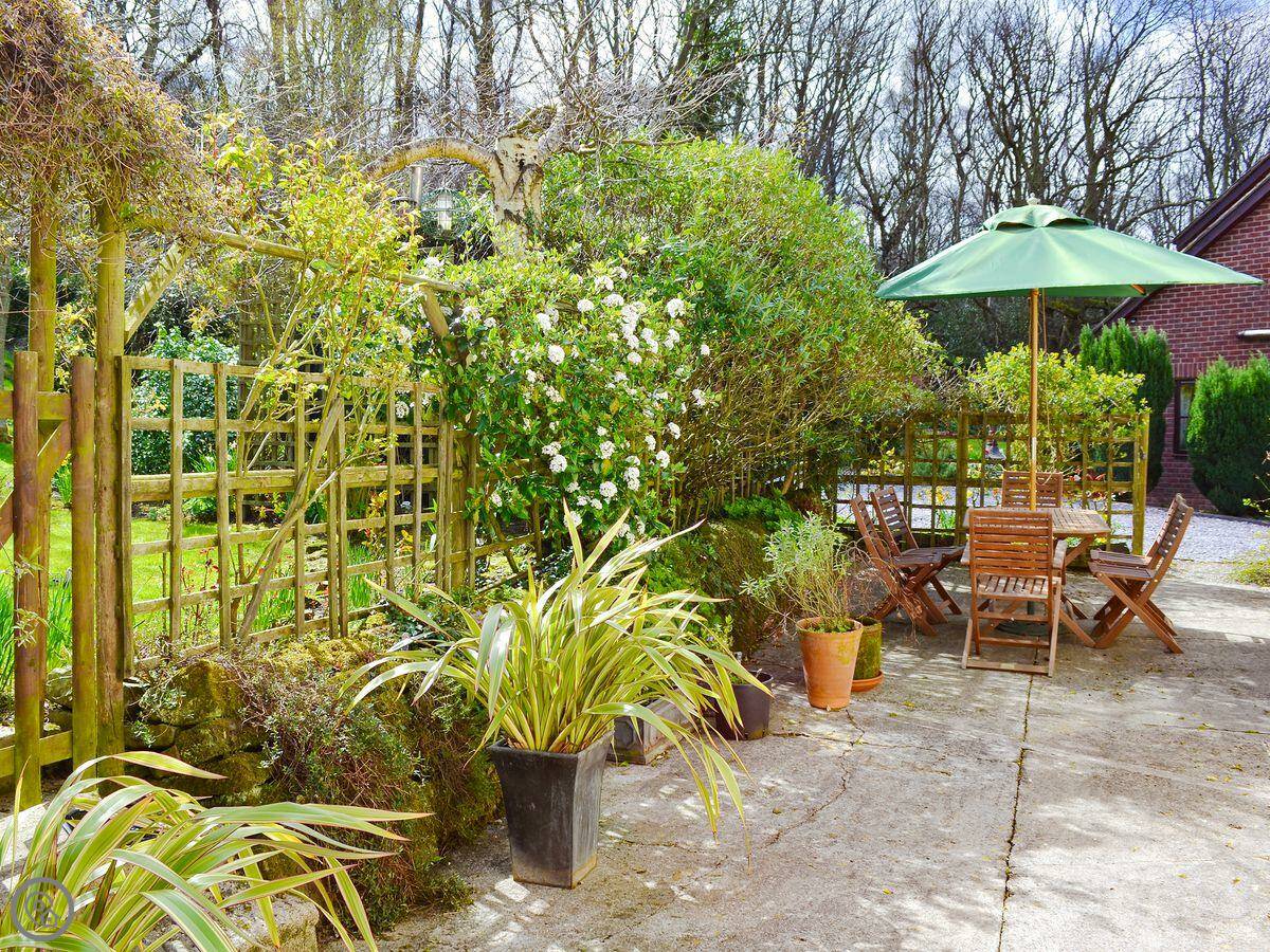 The garden you get is big. There's an orchard at the bottom. There's a patio with a table and chairs by the cottage. We leave the BBQ out there.