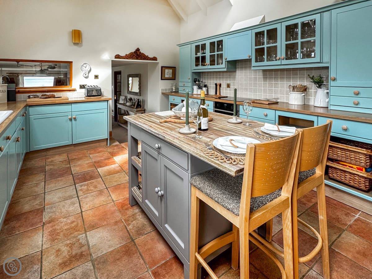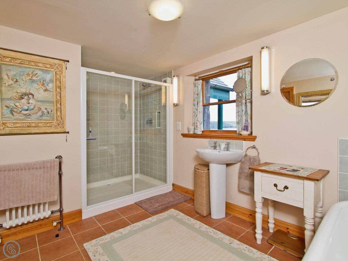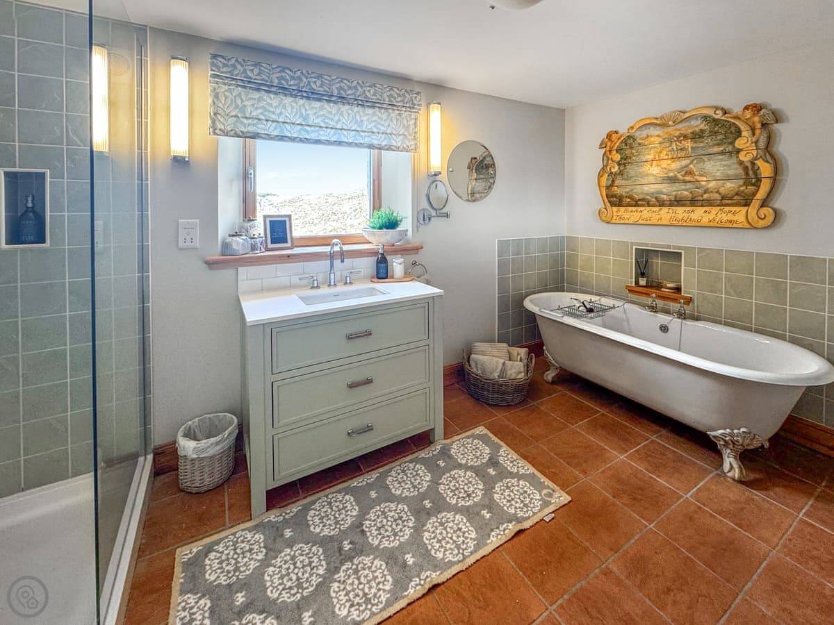 The kitchen is big and has an island with stools. Off that is a utility room and a shower room. There's another bathroom downstairs with a shower and a roll-top bath. The stairs are fine, normal stairs. Upstairs there's a small area with a desk if you need it.