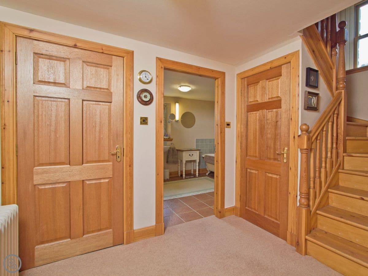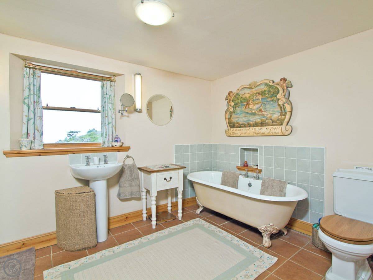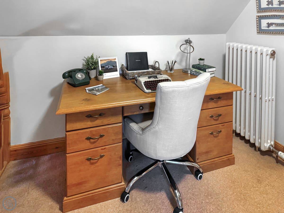 The kitchen is big and has an island with stools. Off that is a utility room and a shower room. There's another bathroom downstairs with a shower and a roll-top bath. The stairs are fine, normal stairs. Upstairs there's a small area with a desk if you need it.