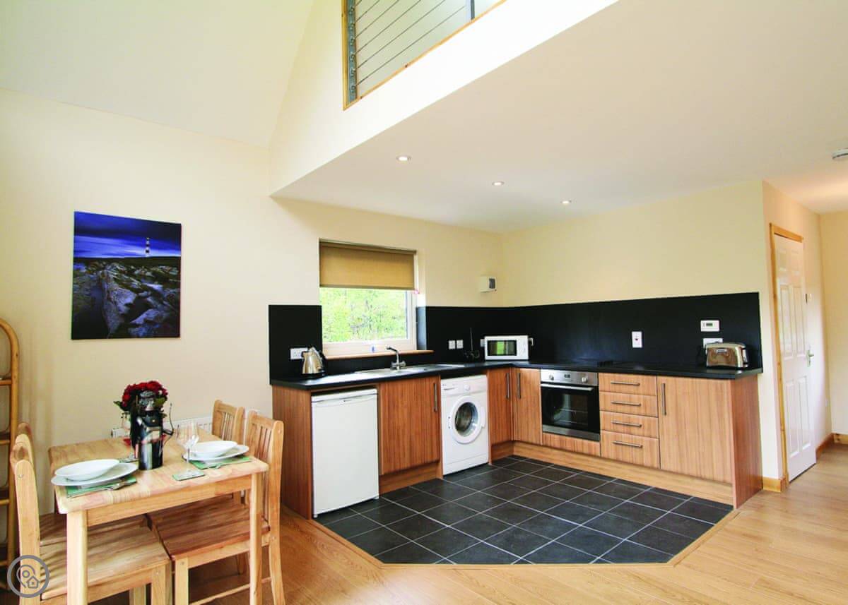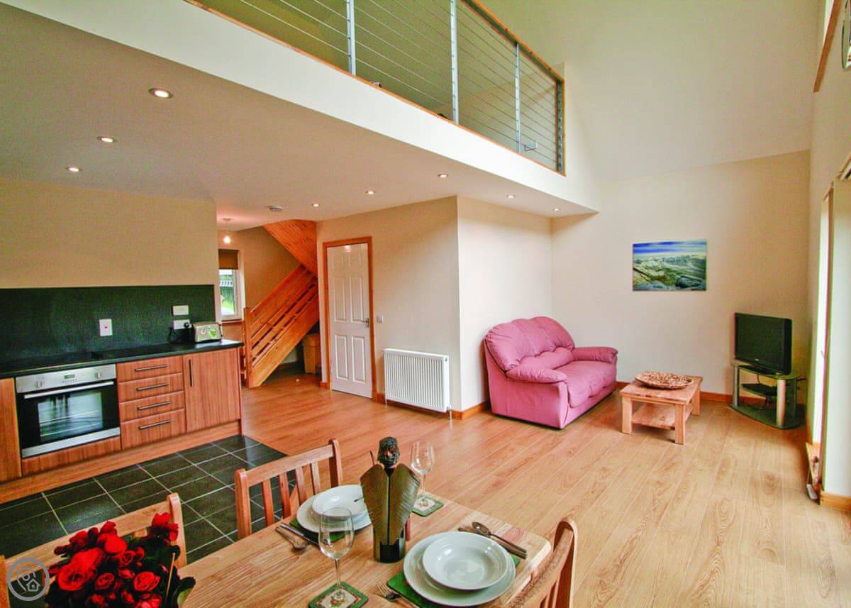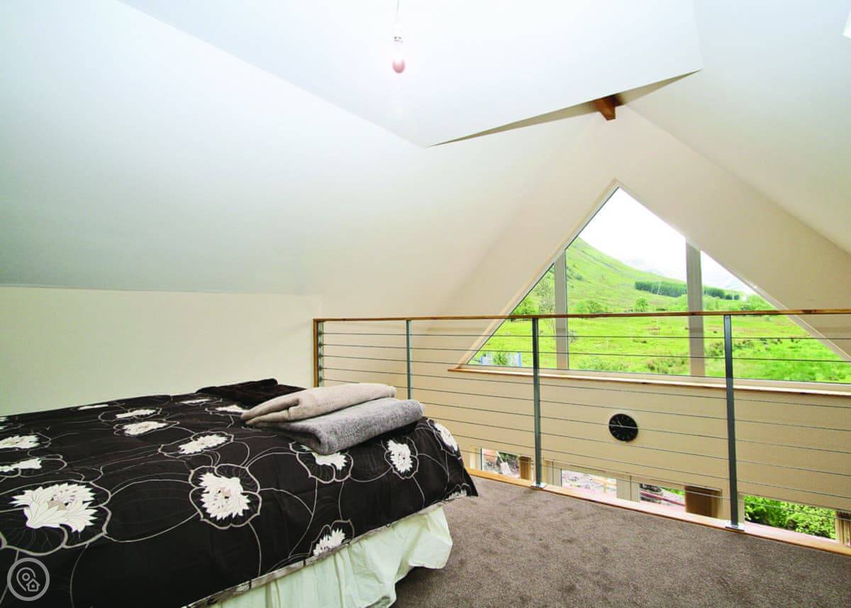 It's for two people. One bedroom upstairs on a mezzanine, one bathroom. It's got a 4 Star rating, so it's comfortable and well-equipped. The big front wall is glass, so you get the full view of Glen Nevis from the living area and even from up in the bed. The stairs up to the mezzanine are a ship's ladder style, so they're quite steep and narrow.