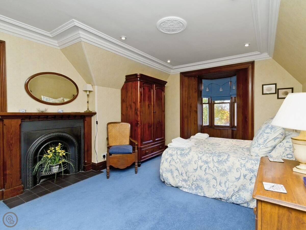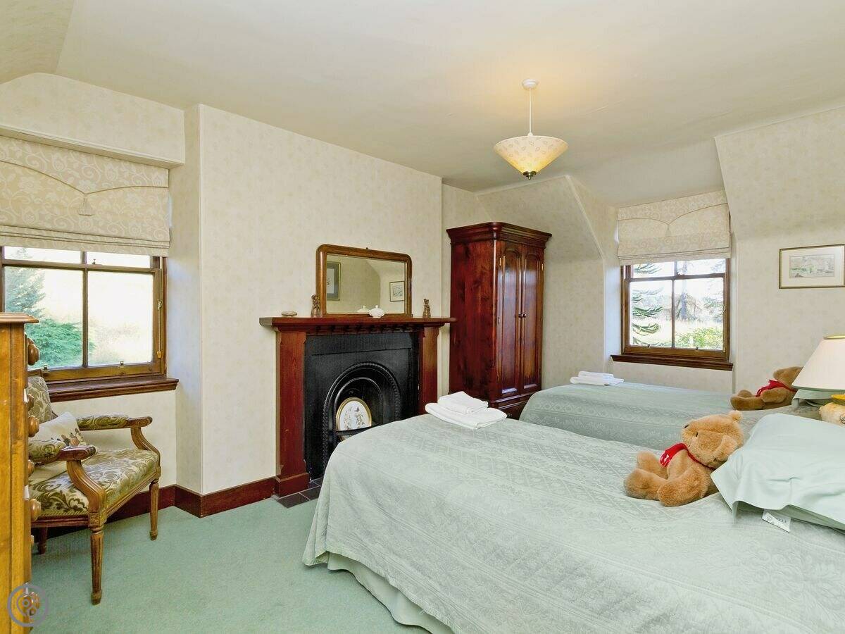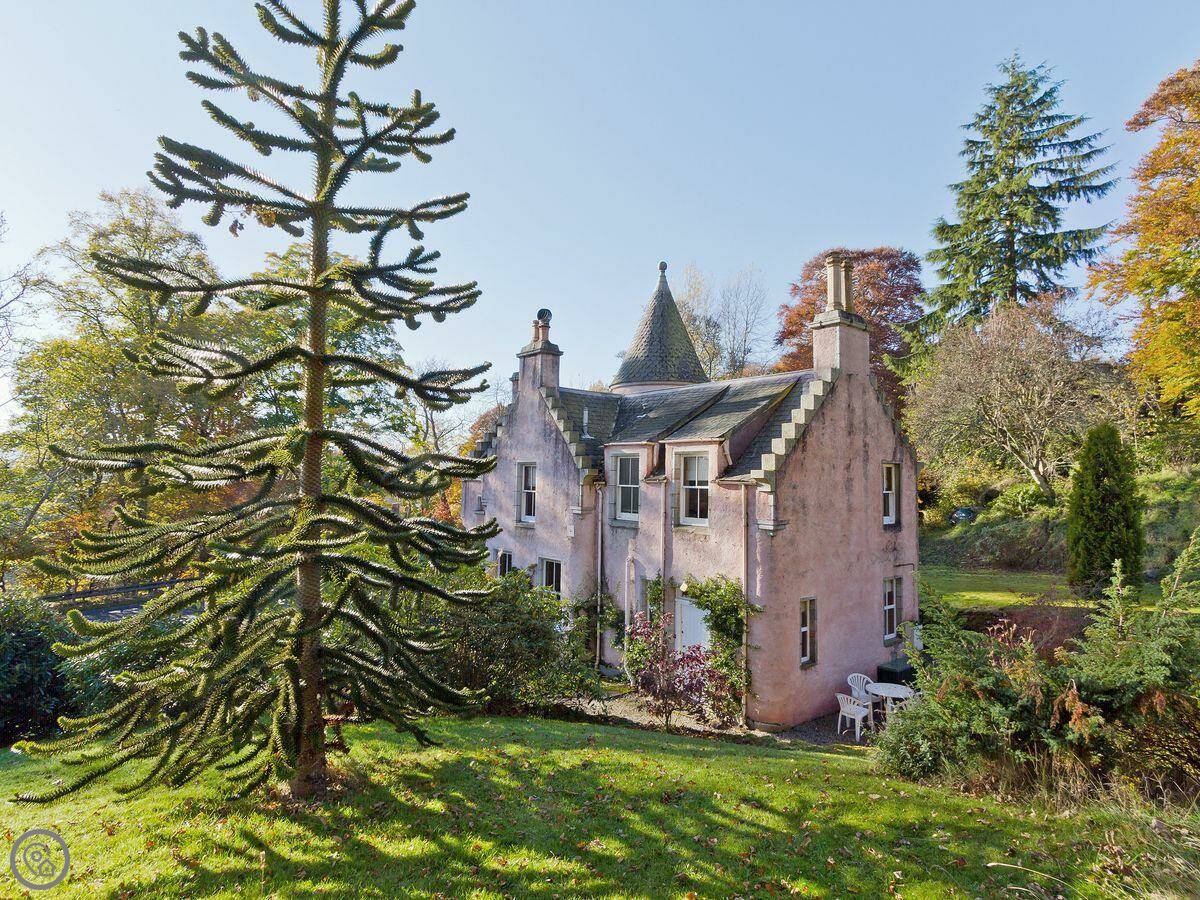 It sleeps four. Two bedrooms, two bathrooms. It's got a 4 Star rating. It's done up traditionally, lots of pine wood and an open fire. It feels older, not big and modern. The gardens go around it on three sides.