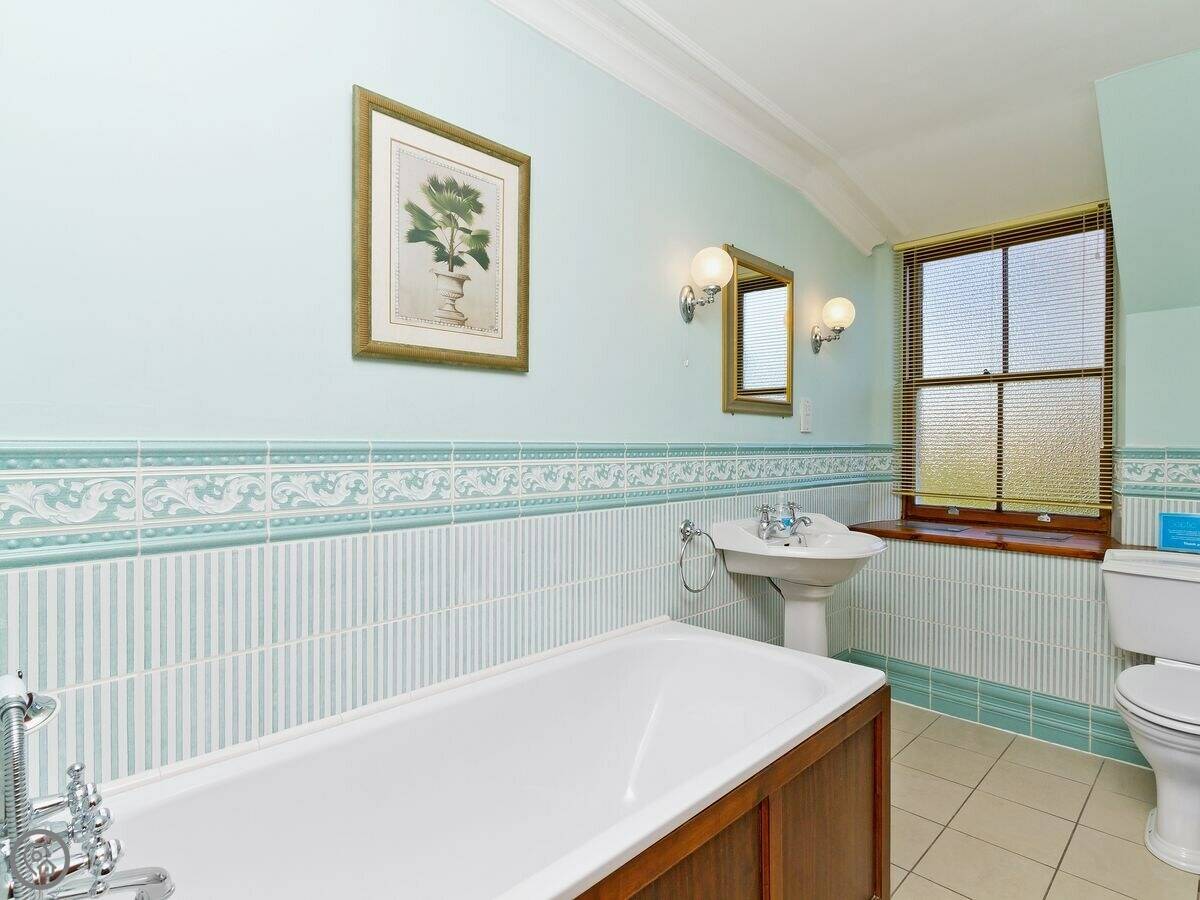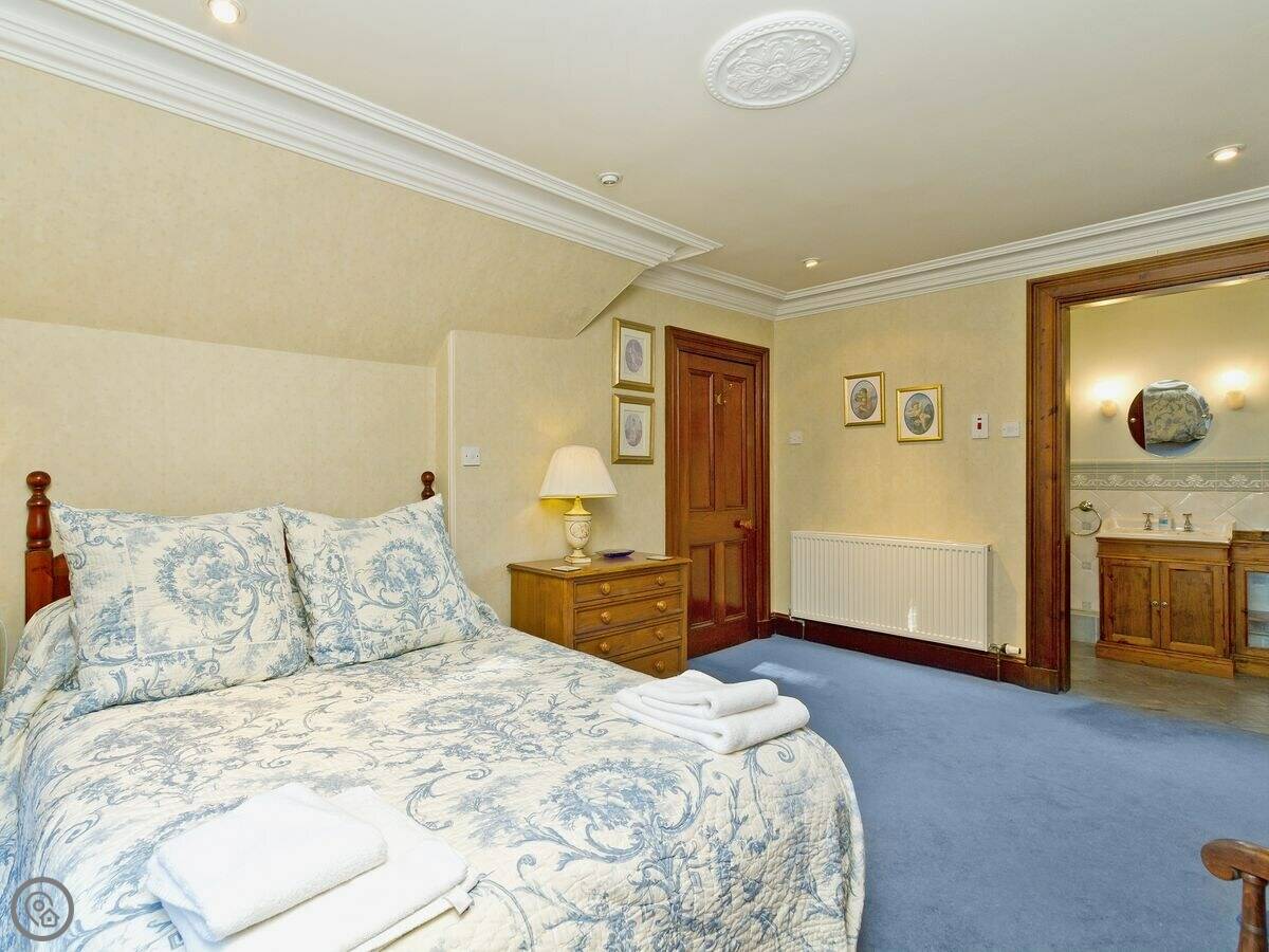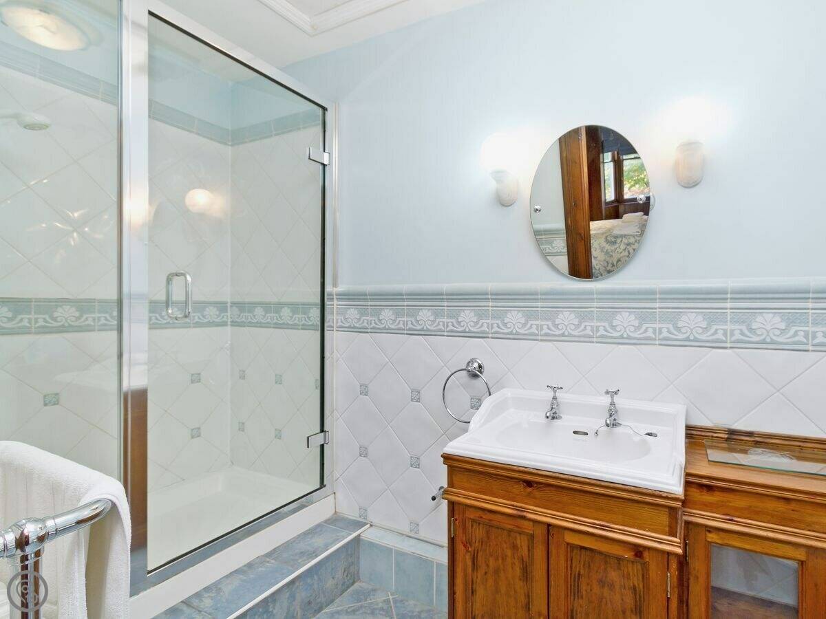 It sleeps four. Two bedrooms, two bathrooms. It's got a 4 Star rating. It's done up traditionally, lots of pine wood and an open fire. It feels older, not big and modern. The gardens go around it on three sides.