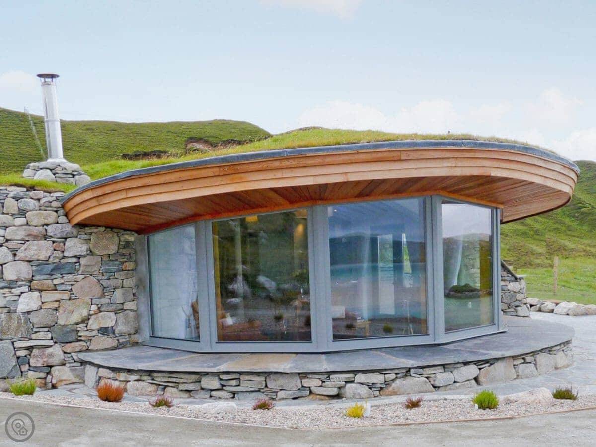 The cottage sleeps four. Two bedrooms, both with their own bathrooms. One bathroom has a Jacuzzi bath. There's also a small sauna for two people in the house. It's all on one floor and designed to be accessible, with wide doors and a wet room. The roof is turf, which is unusual. It's got a woodburning stove for cooler evenings.
