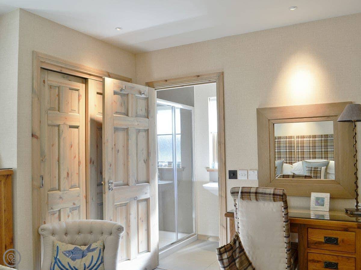 It sleeps four. Two bedrooms, both with their own bathroom. That's quite handy. It's a 5 Star place, which means it's finished to a high standard and well-equipped. You get a view of the river from the living area.
