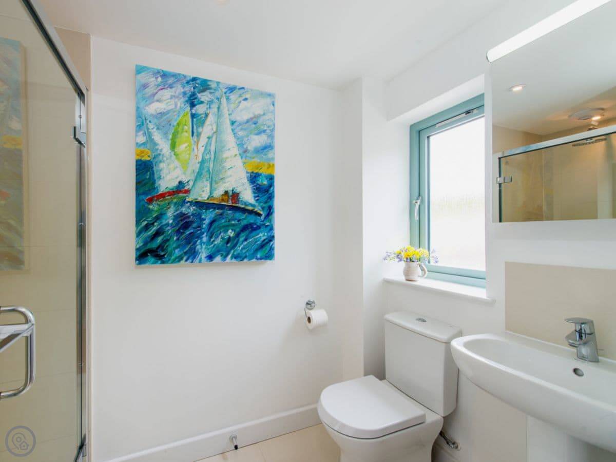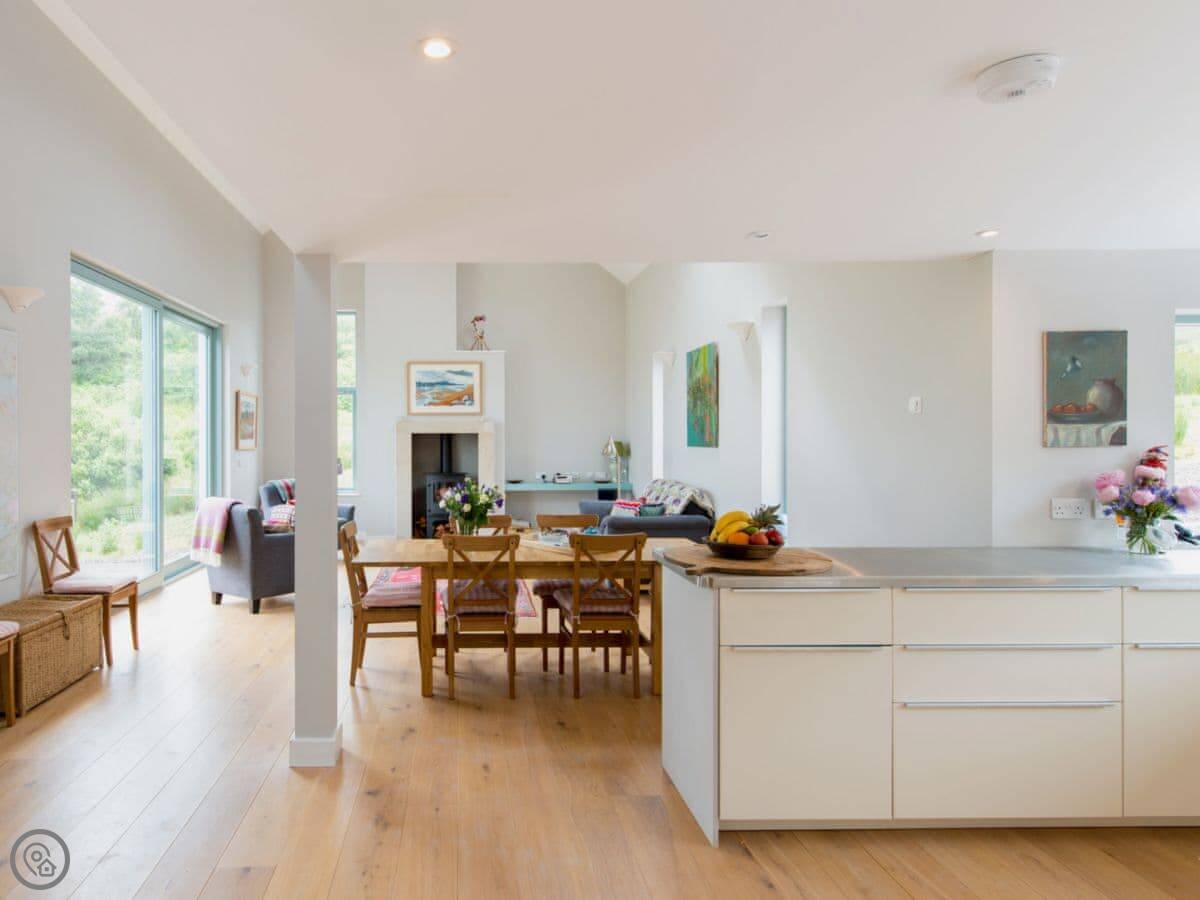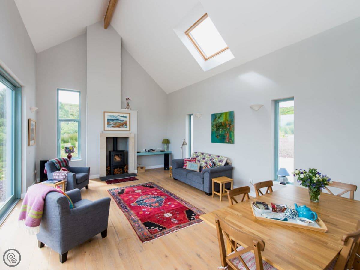 It's an eco-house, so it's warmed by a ground source heat pump, with underfloor heating. It's very light inside, with high ceilings. There's a multi-fuel stove.