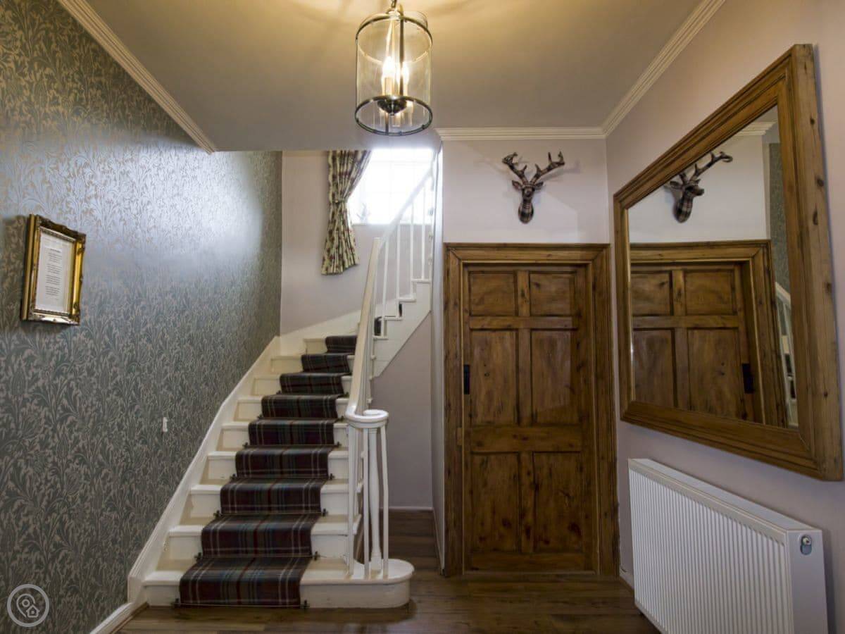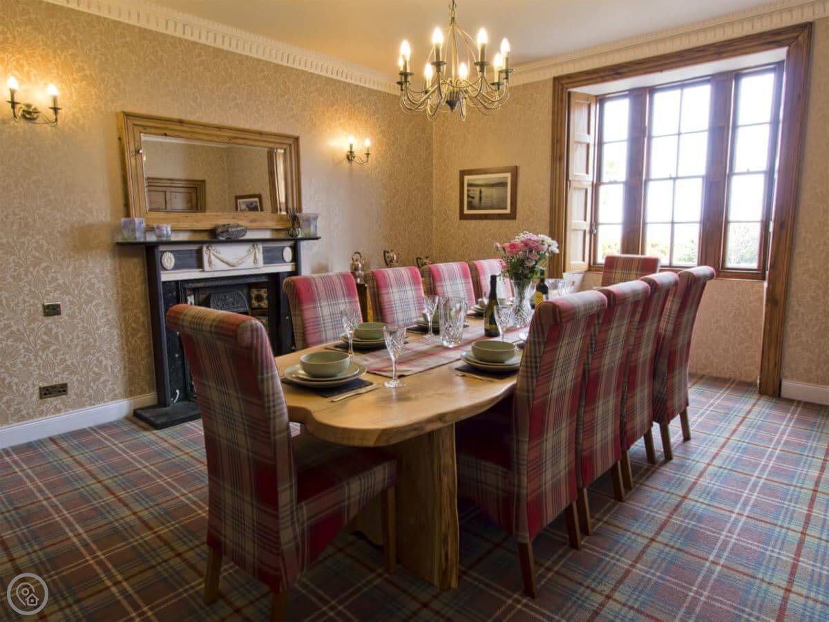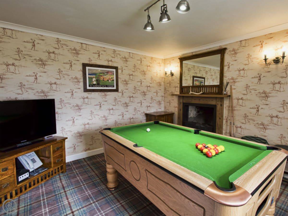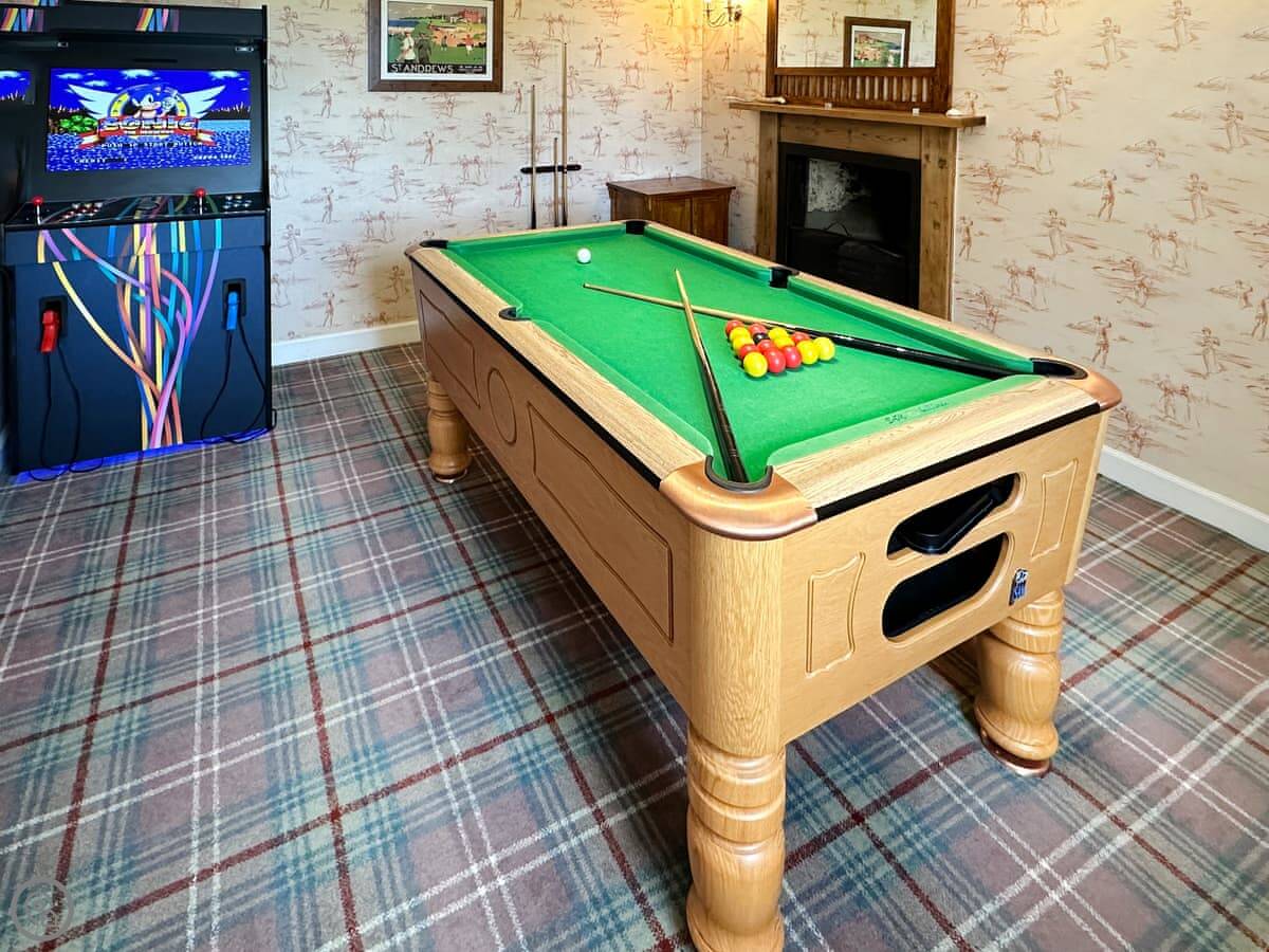 Downstairs, the rooms are big with high ceilings. The kitchen is a good size and has everything you'd need. The dining room has a long table that seats everyone. The main living room has a wood burner and comfy sofas. There's also a games room with a full-size pool table.